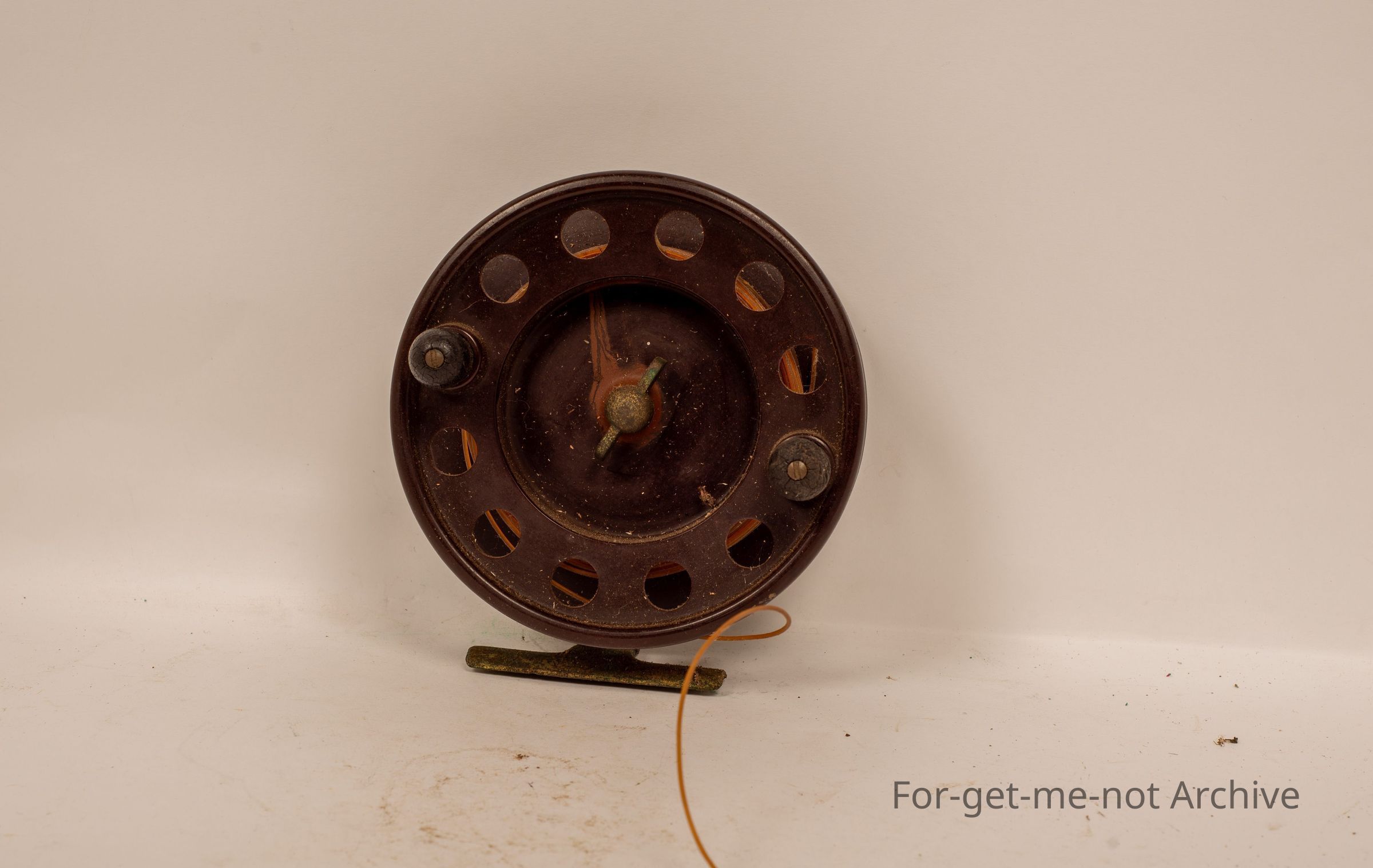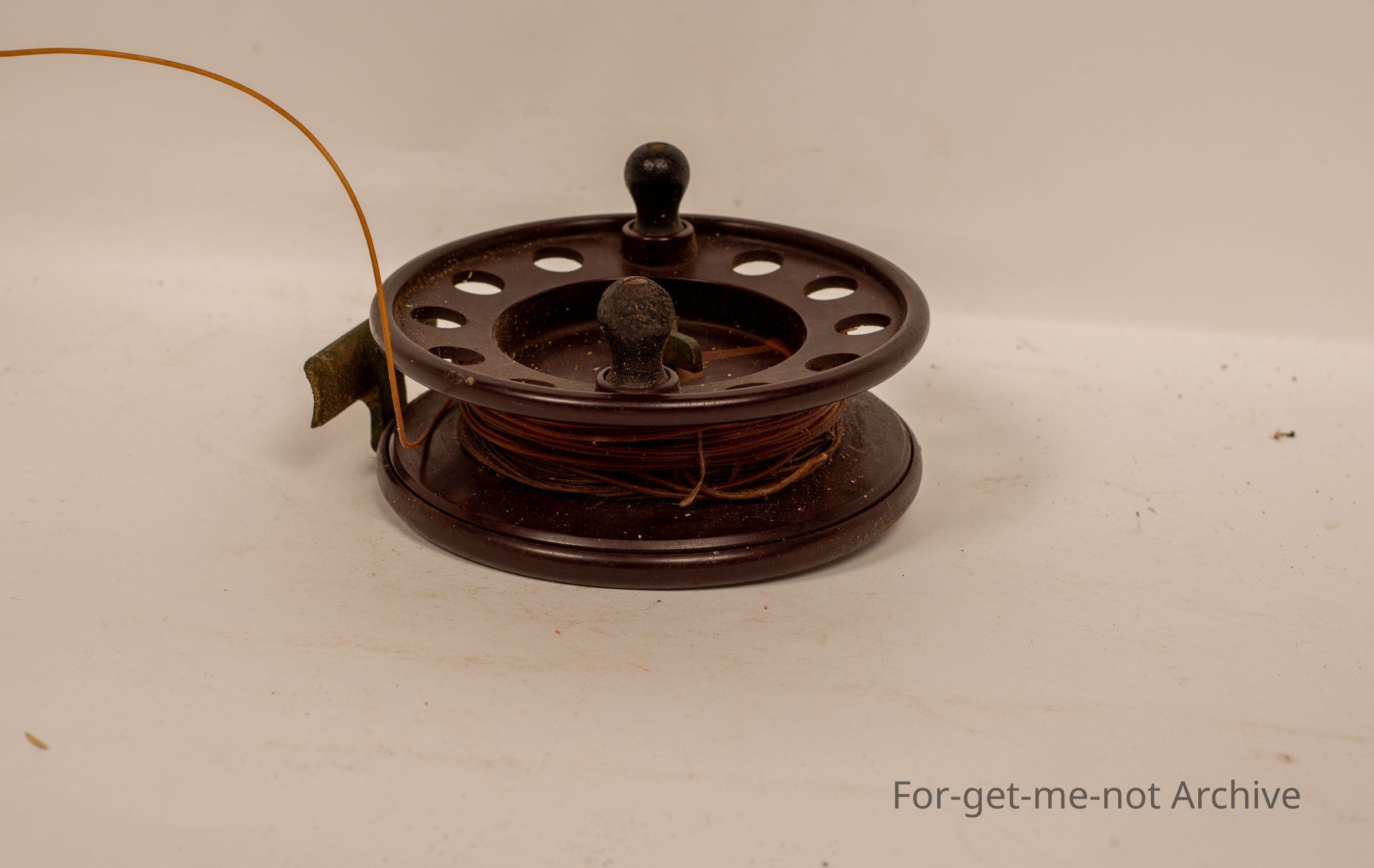 Large Baker Lite Fishing Reel. Branded Pacific, 5 inch. The interesting part of this is that it still has the old fashioned gut line attached to it, which is probably quite rare.