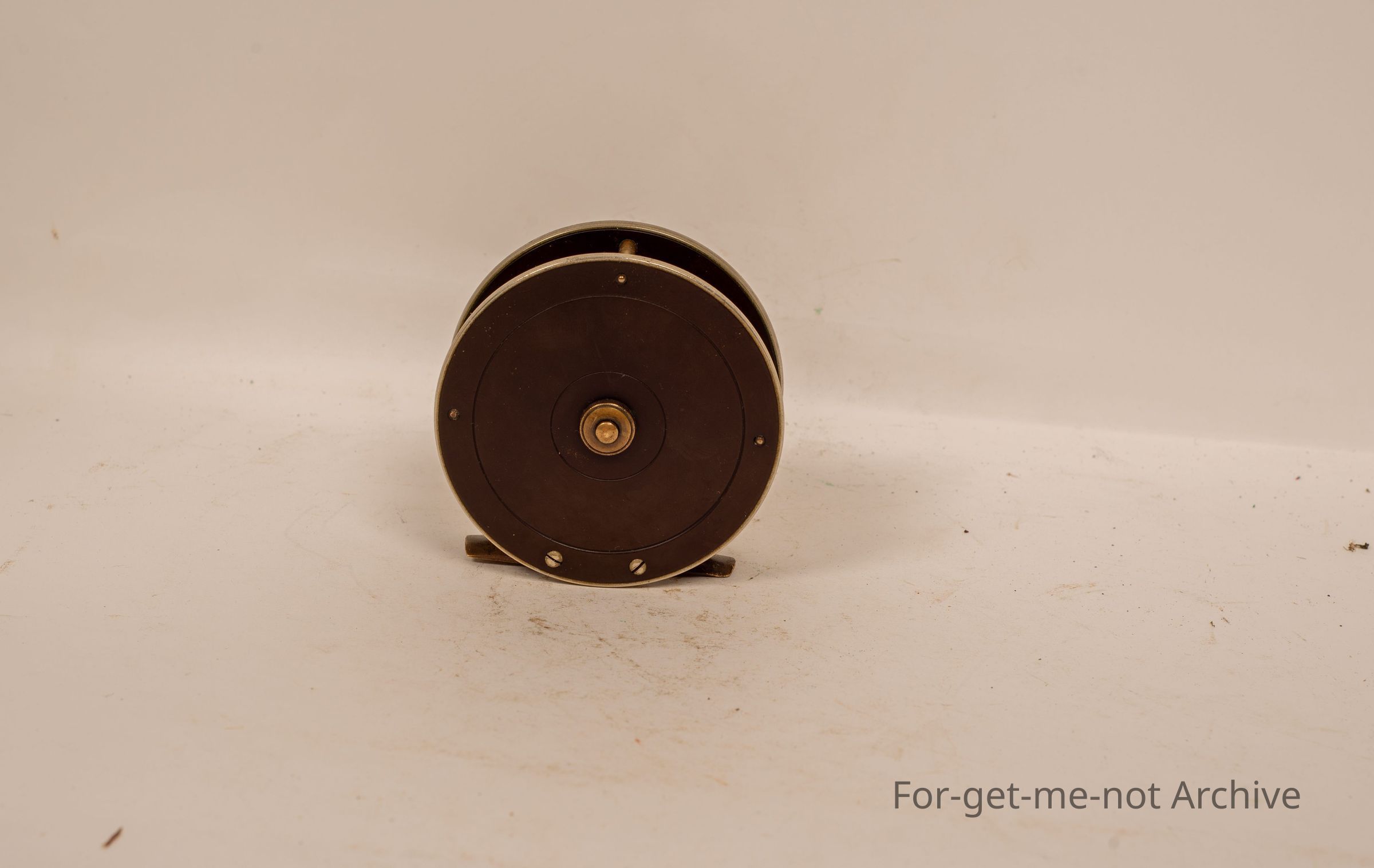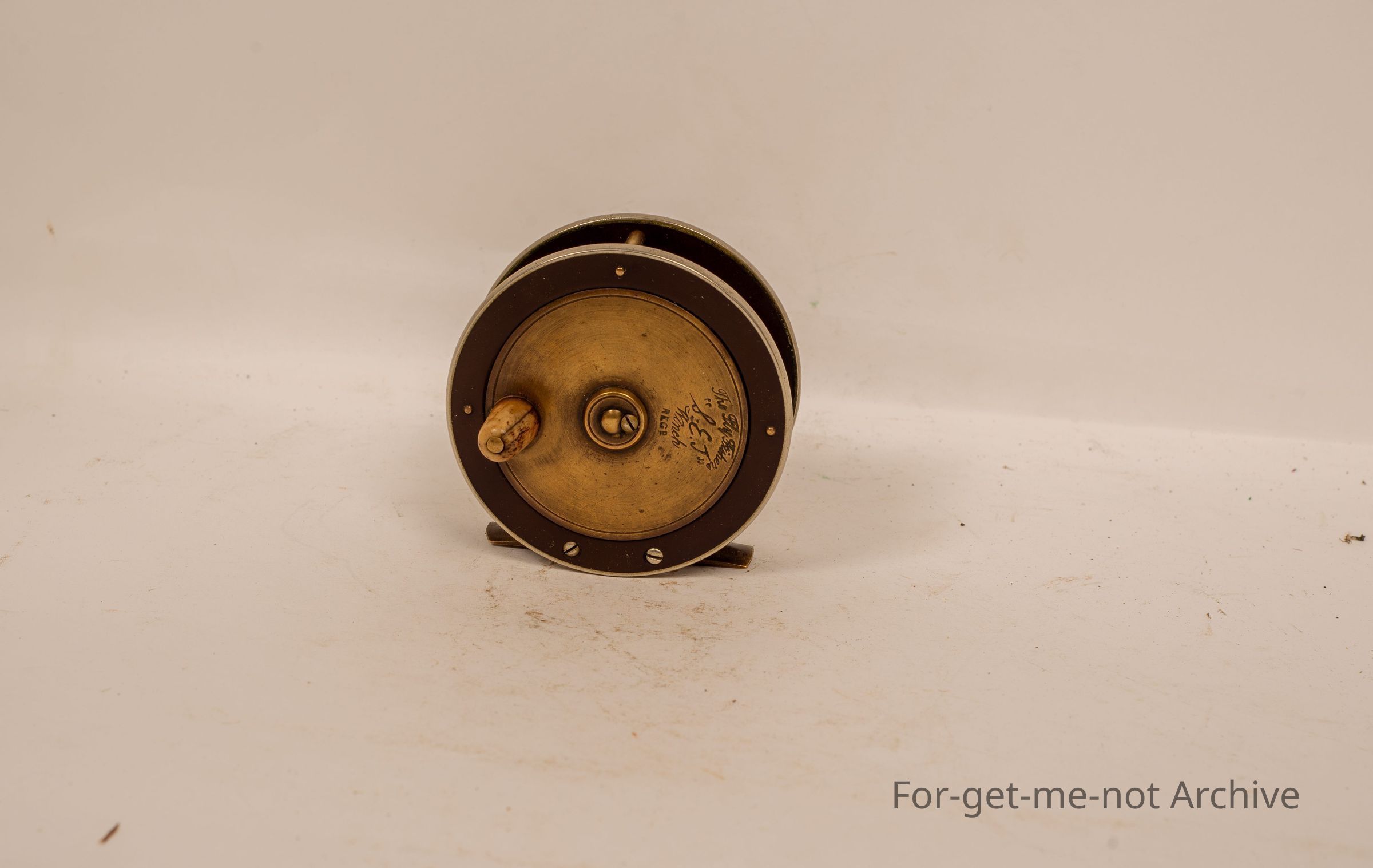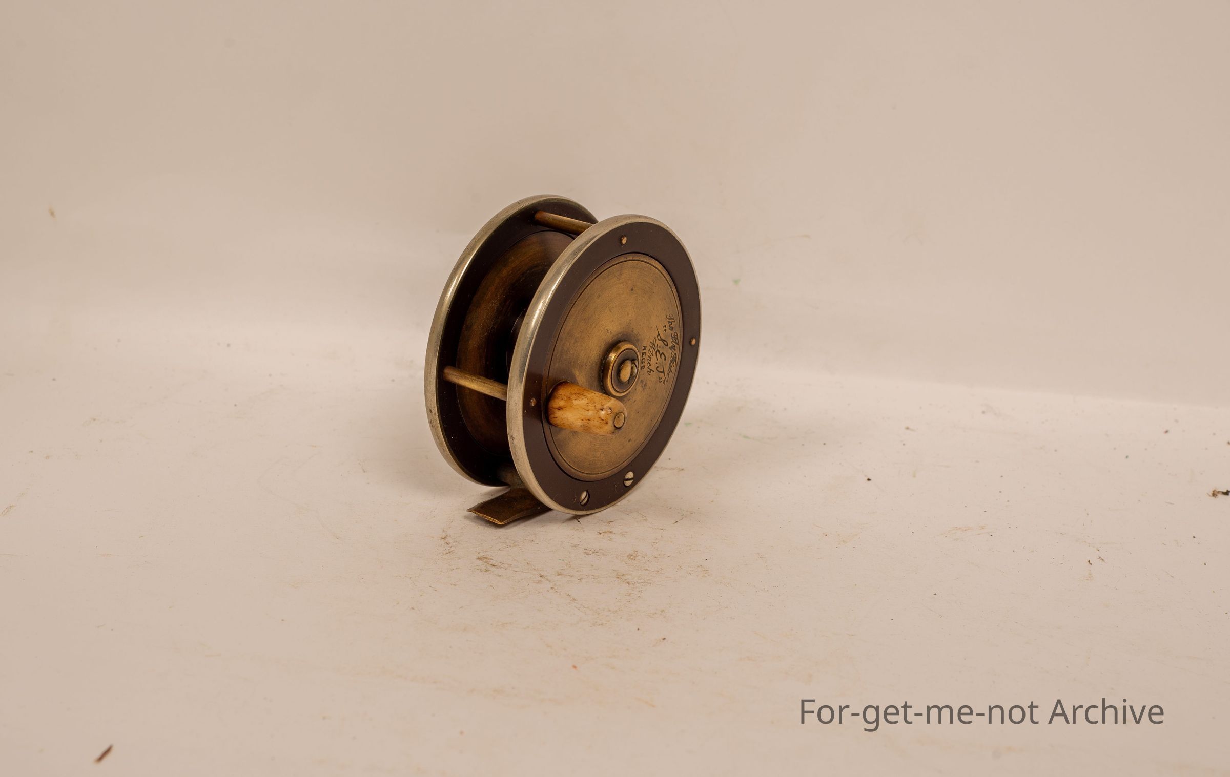 A beautiful fly fisherman's reel. The fly fishers winch, s e j carved into it. This reel belonged to my grandfather, Max Bruce.