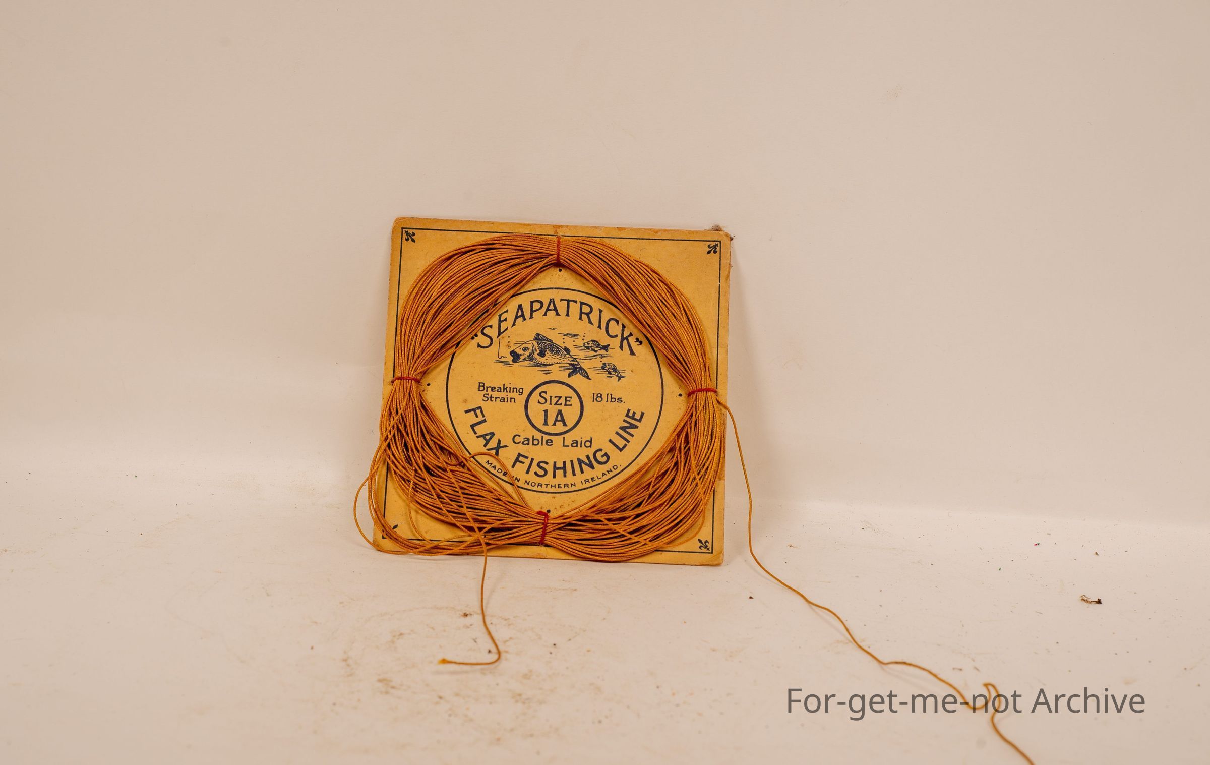 More nylon fishing not nylon, flax fishing line, made in Northern Ireland. Image of fish called see Patrick on cardboard backing.