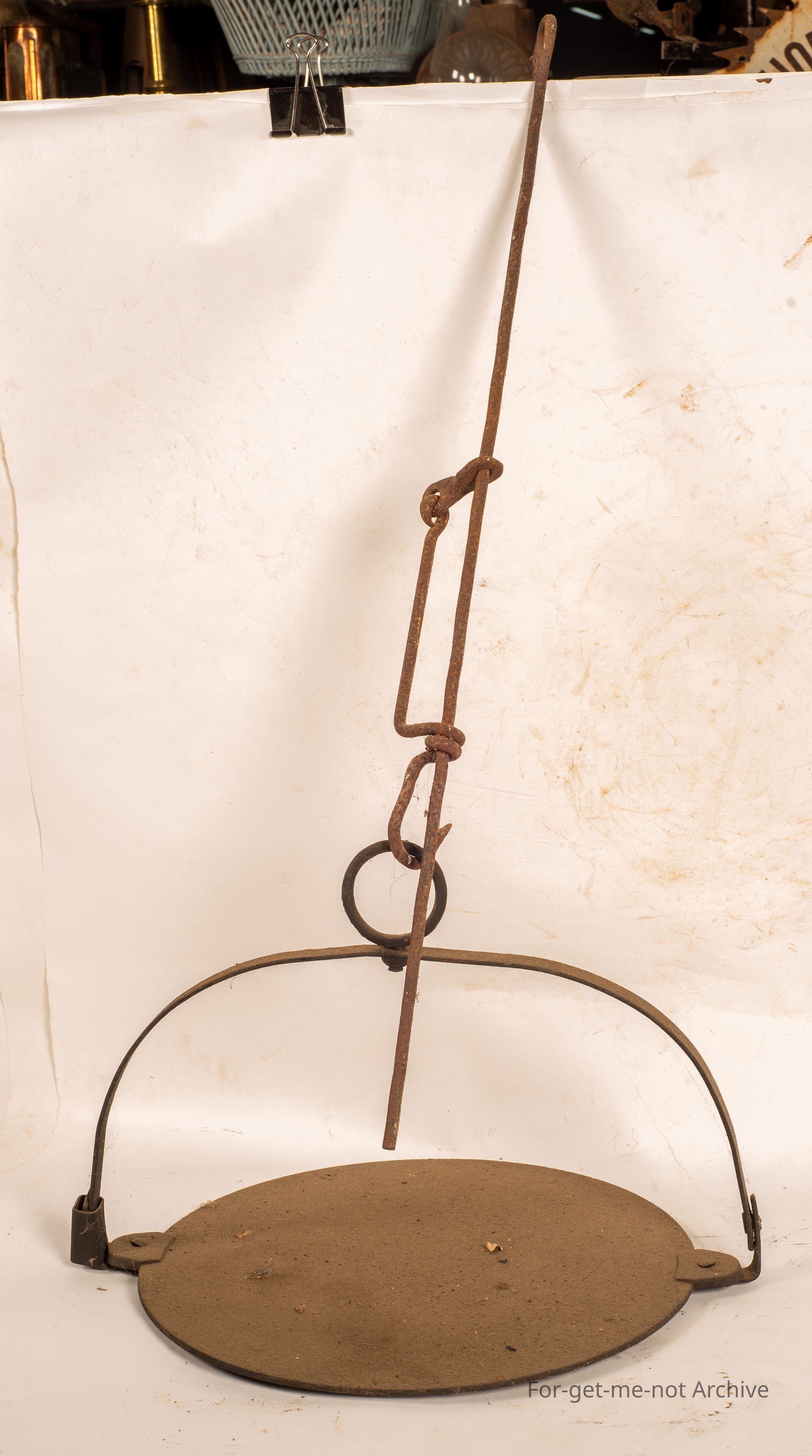 This is a common outfit from a stockman's camp. The flat fry pan on a heavy handle hanging on the end of a trammel that would have been attached to a bar above the fire. A lot of cooking would have been done on these. The trammels are all adjustable so that can be lifted above or down closer to the plane.Collection