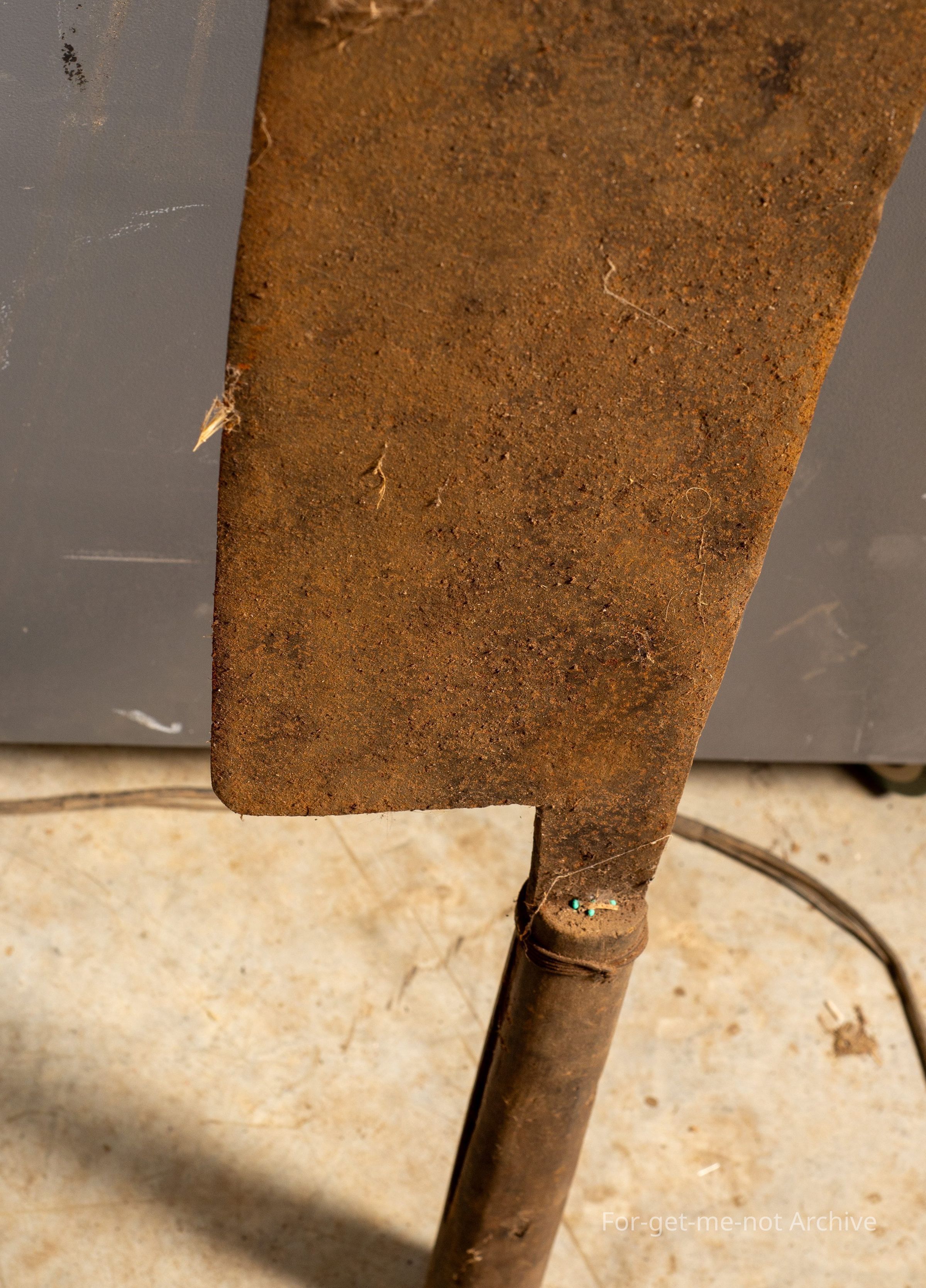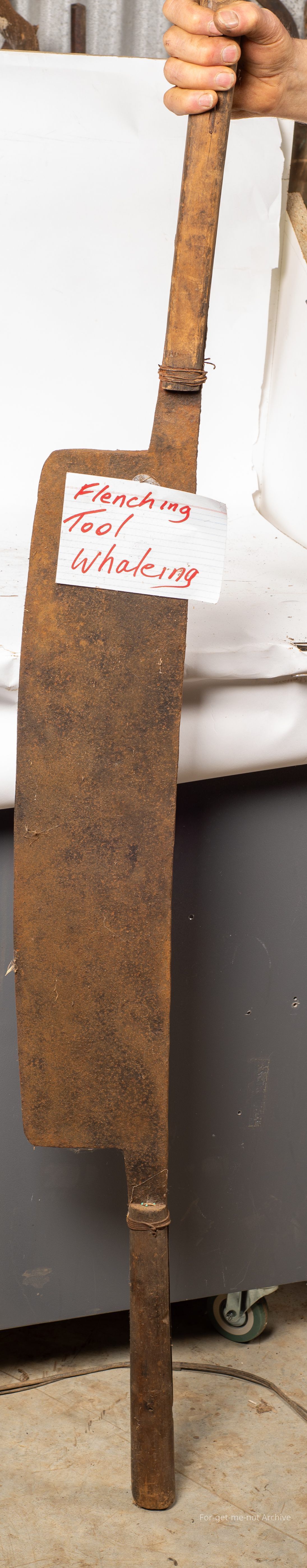 This is a flenching tool from the whale industry. These were used by running a cut strip, to roughly the width of the blade down the body of the whale. These were held by 2 men. 1 on either handle that ran was splayed under the skin to get the skin away from the blubber of the whale. This pair, are from the Australian Whale Industry which is now gone. A relic of the whale industry time.Collection
