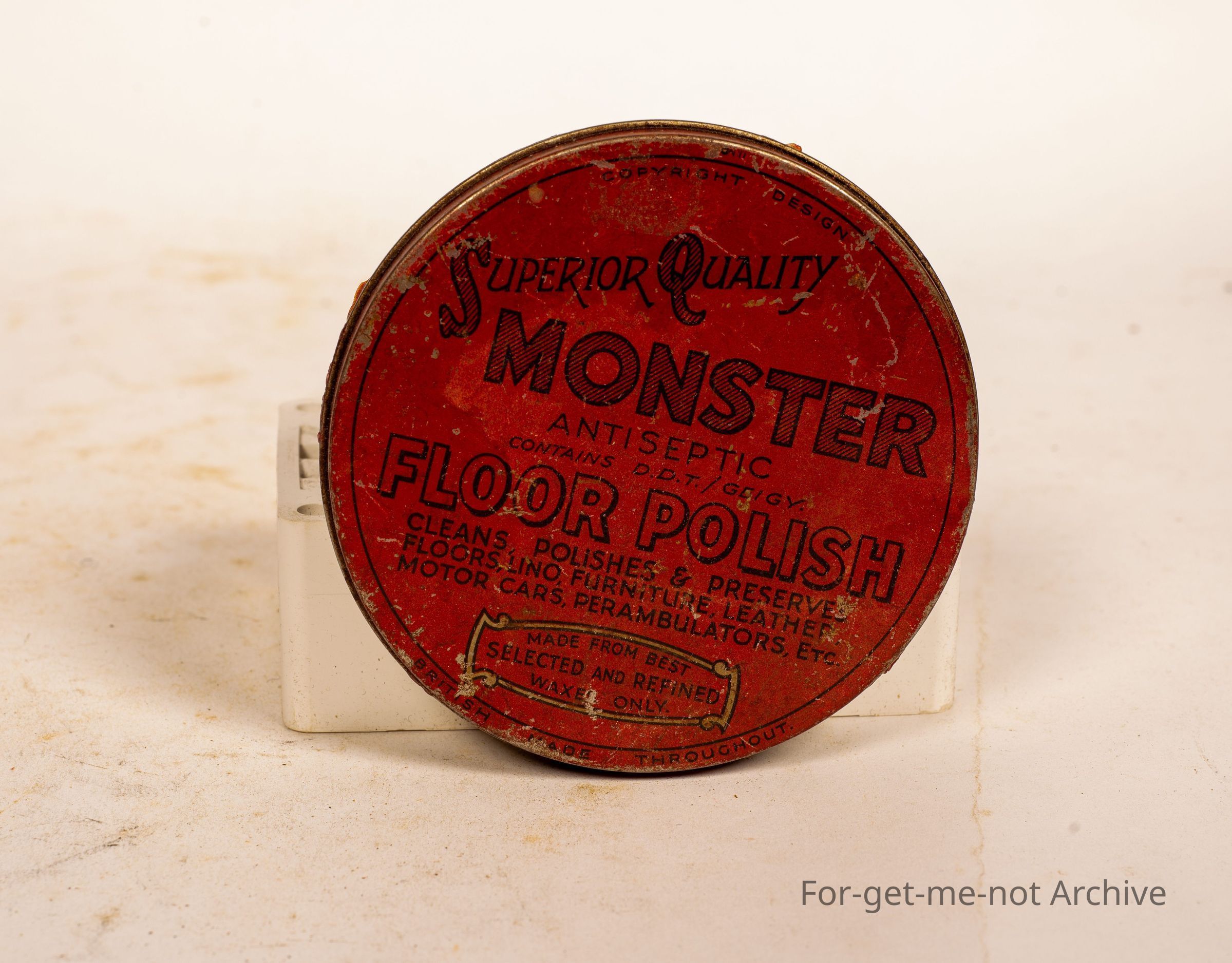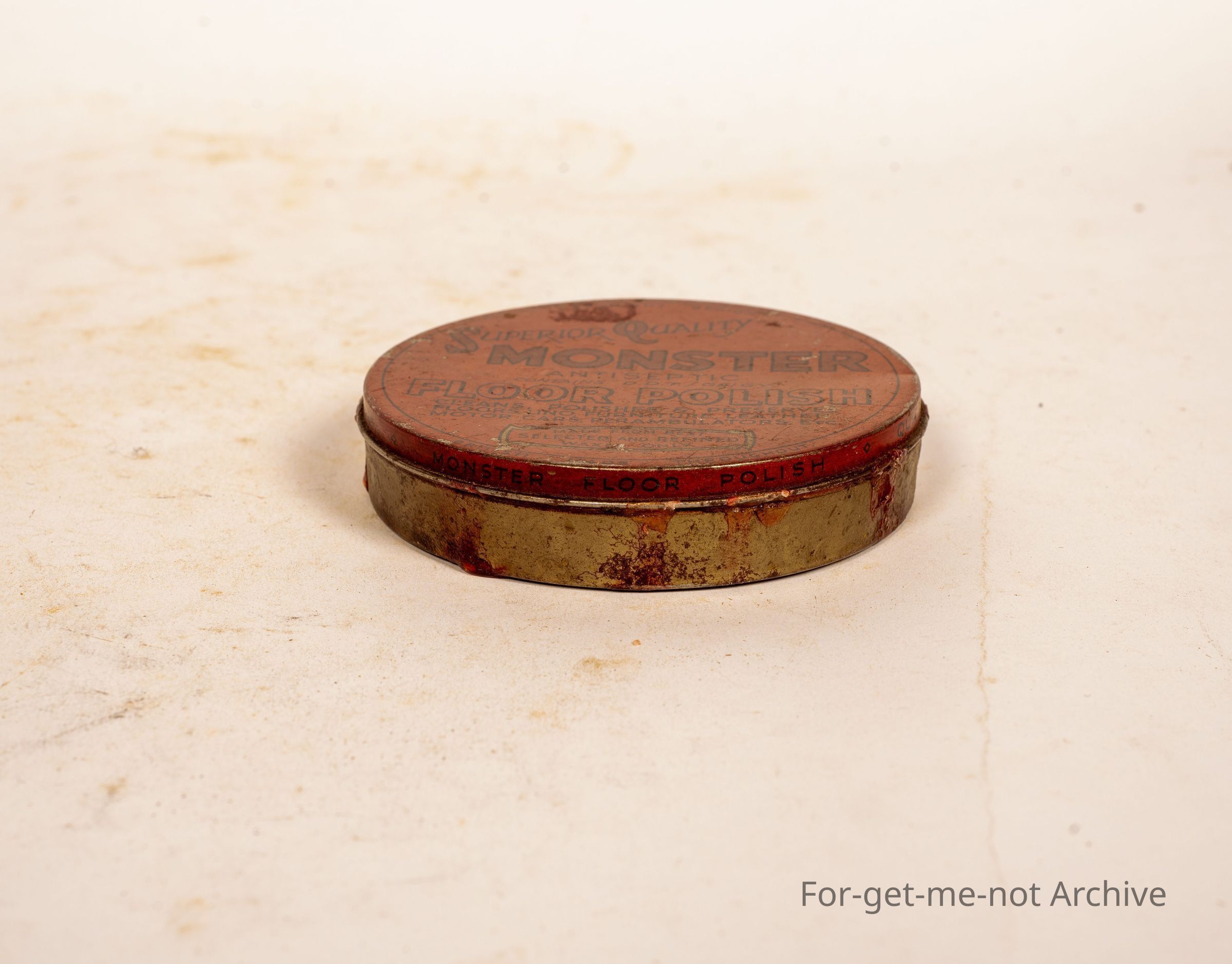Is a tin of floor polished titled Superior Quality Monster Antiseptic Floor Polish. Once again, this tin is down a bit.