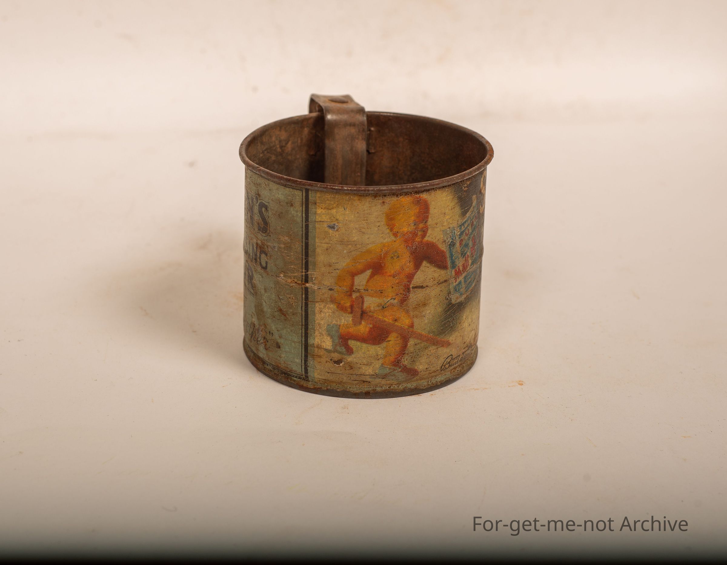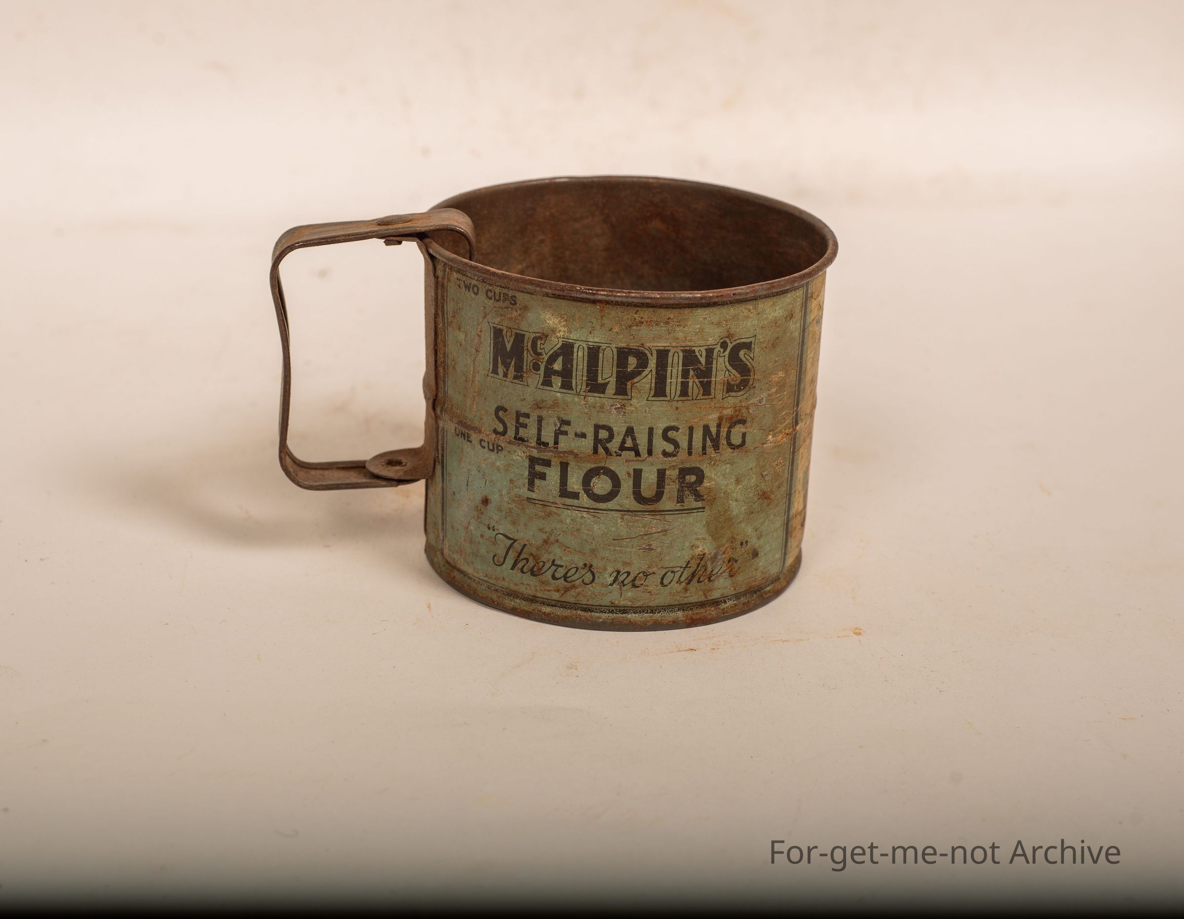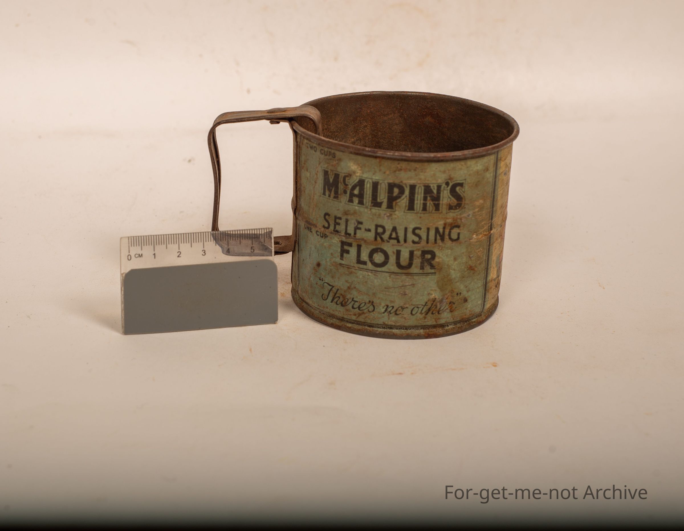 This is a small cup like flower sister. Sifter, works on a spring advertising Saunders malt extract with a young kid running around and McAlpin's self raising flower on the back. There's no other. Very early, very old, condition, not that goodCollection