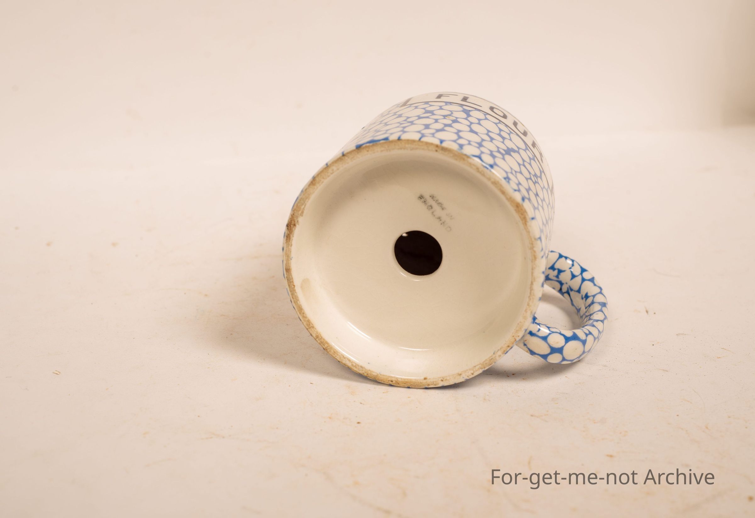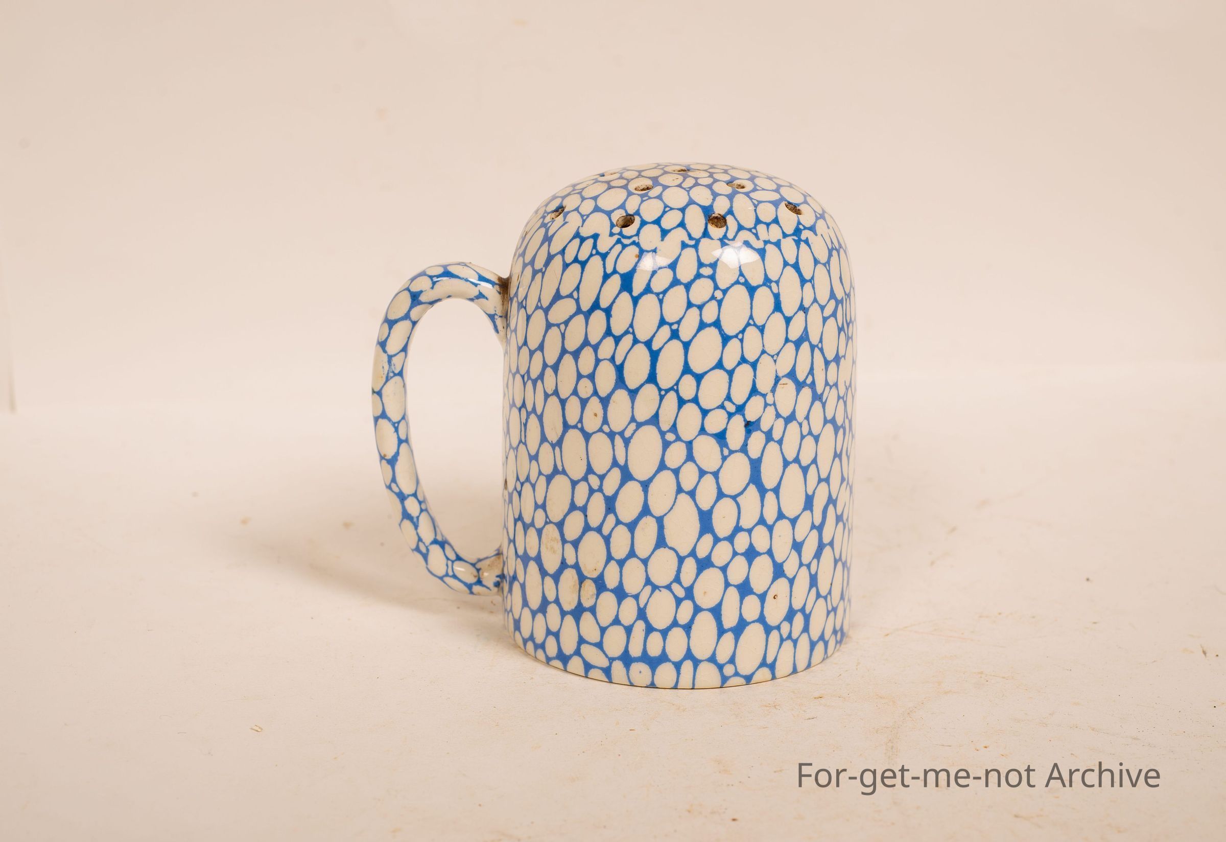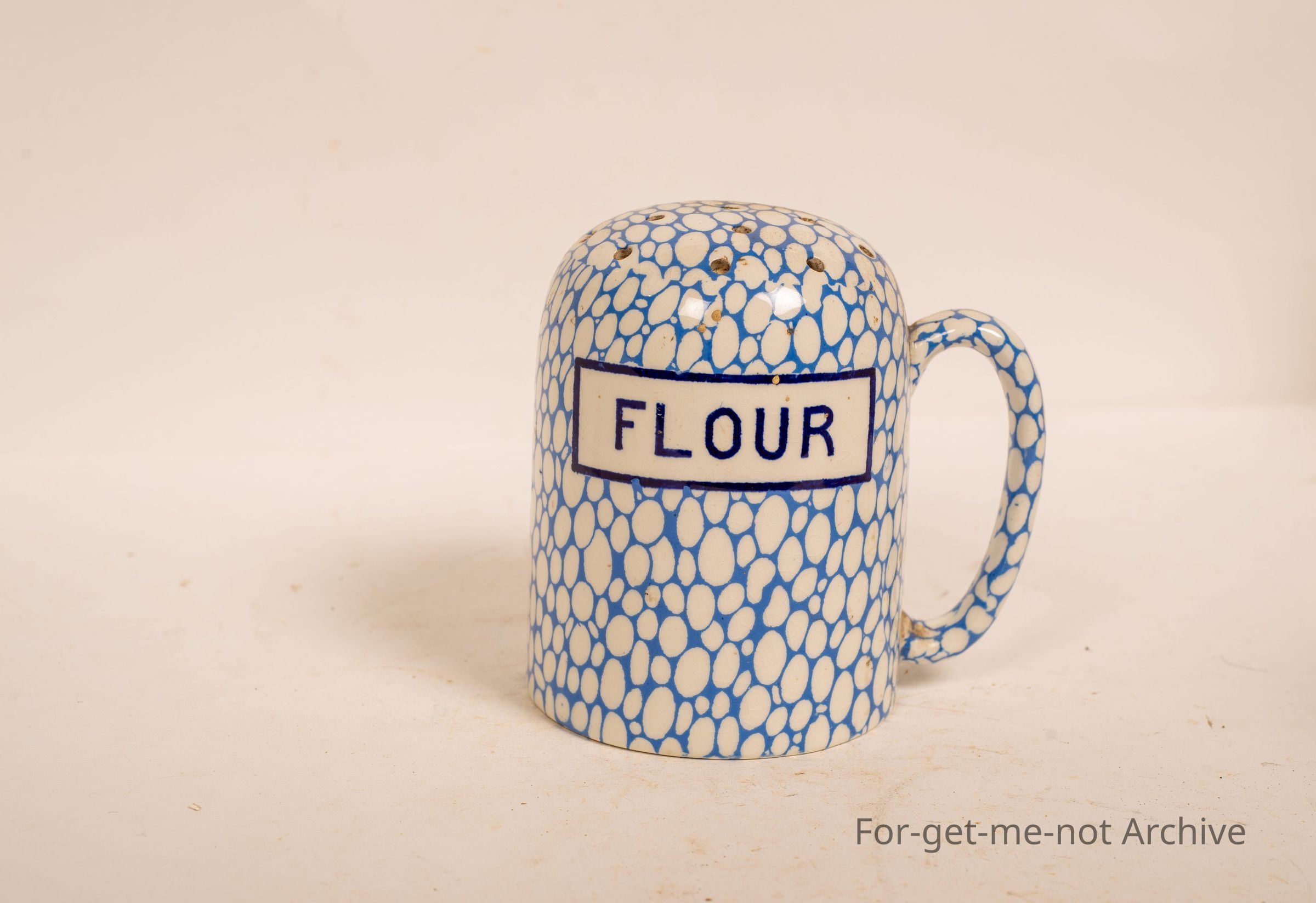 Ceramic flour distributor, holes in the top for shaking the flour out with a handle, flour written on it. Once again, these are quite old, but this one's in very good order.