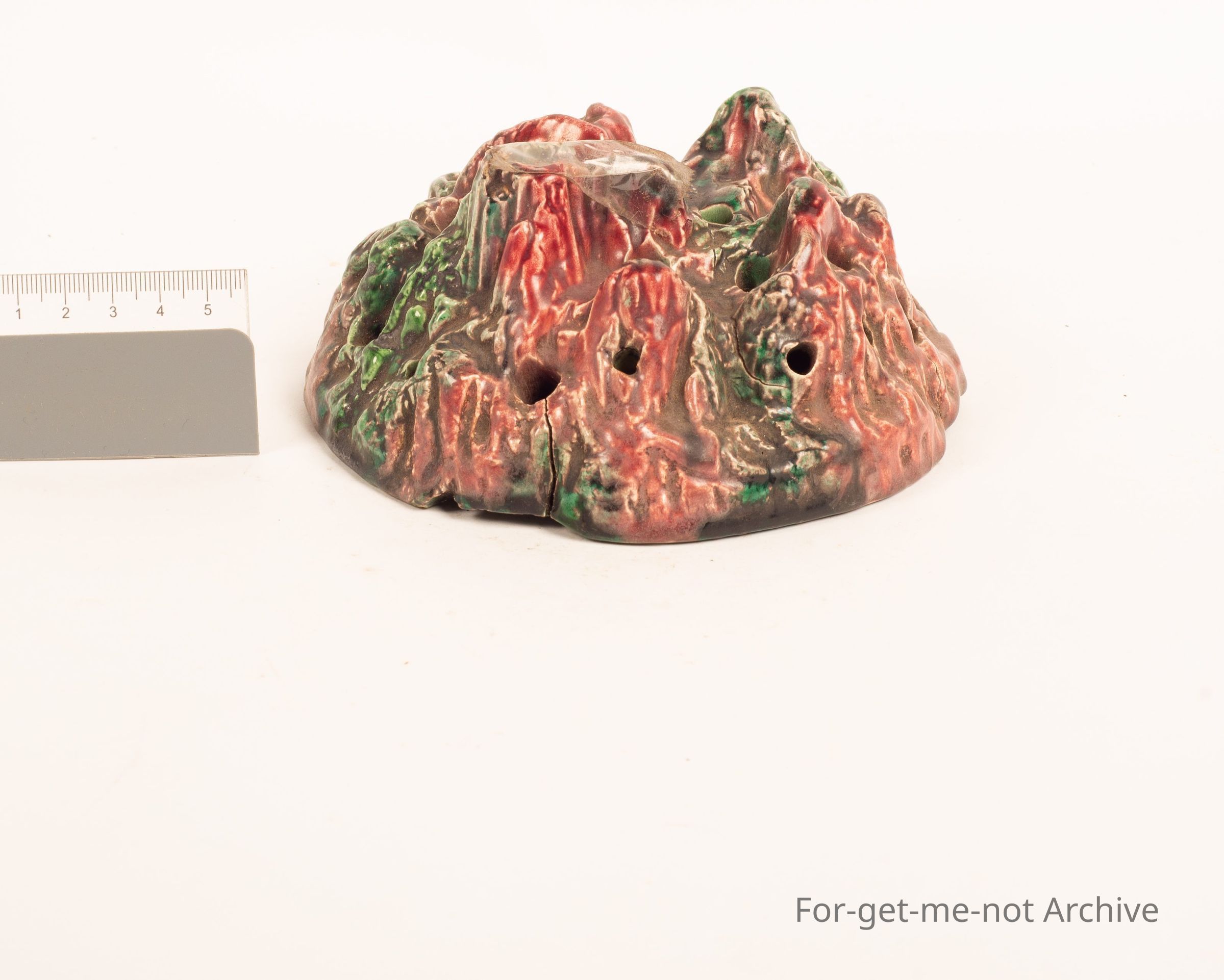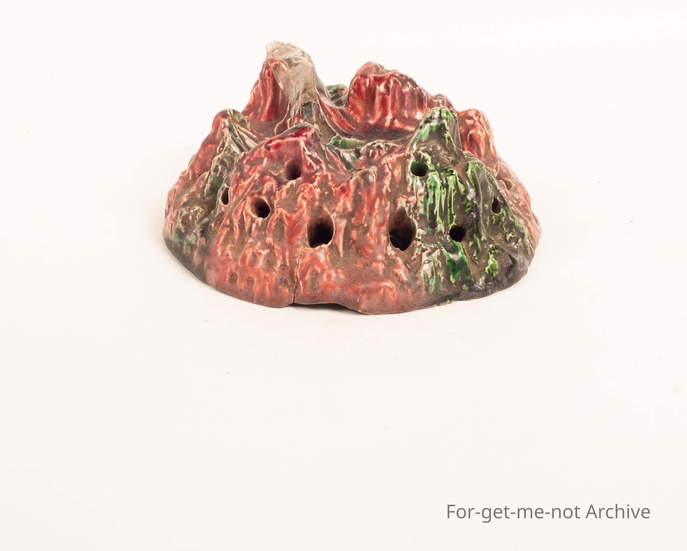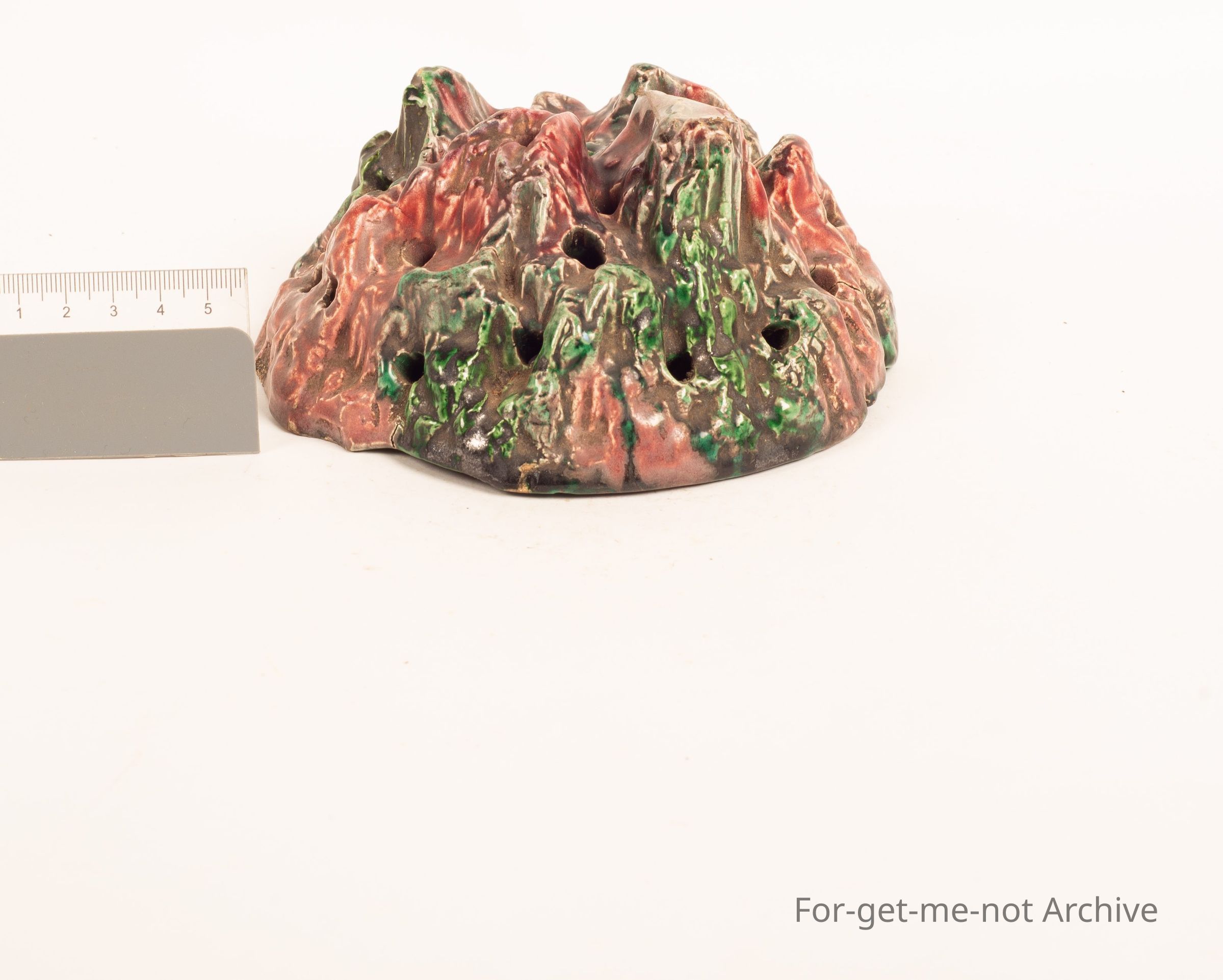 Studio made flower frog. Very ornate. Amazing design. Almost looks like a volcano. Unusual glaze of red and green. Unsigned, unfortunately