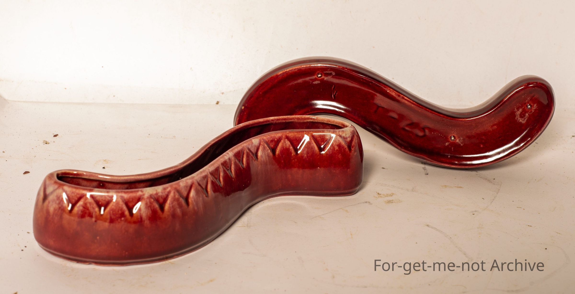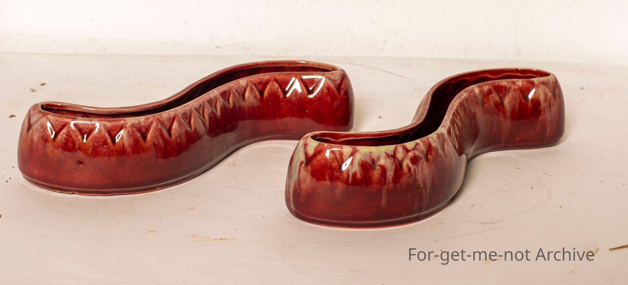 A pair of flower vases, these are a dark burgundy type glaze with a patterned, number of T25 on the bottom, in the shape, roughly, of an S. Not an uncommon piece.