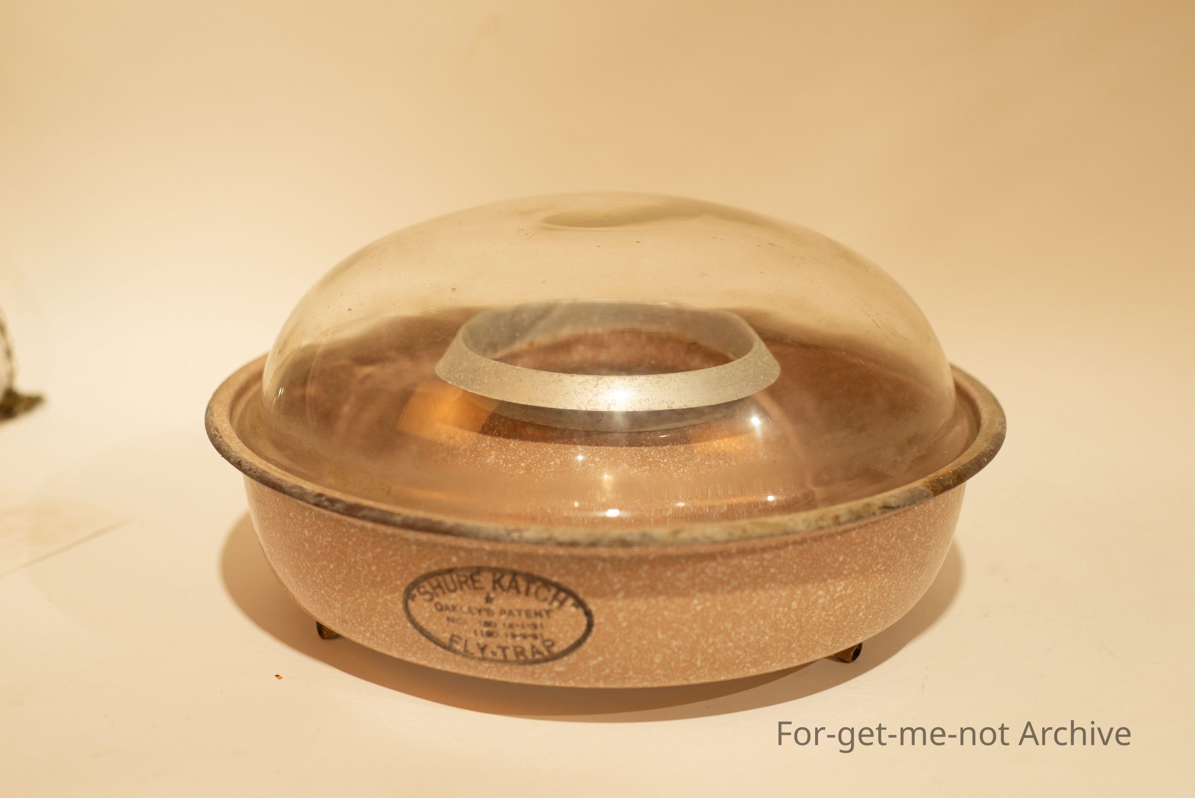 glass dome top, base enamel, tin, name: "Shure Catch" Fly-trap