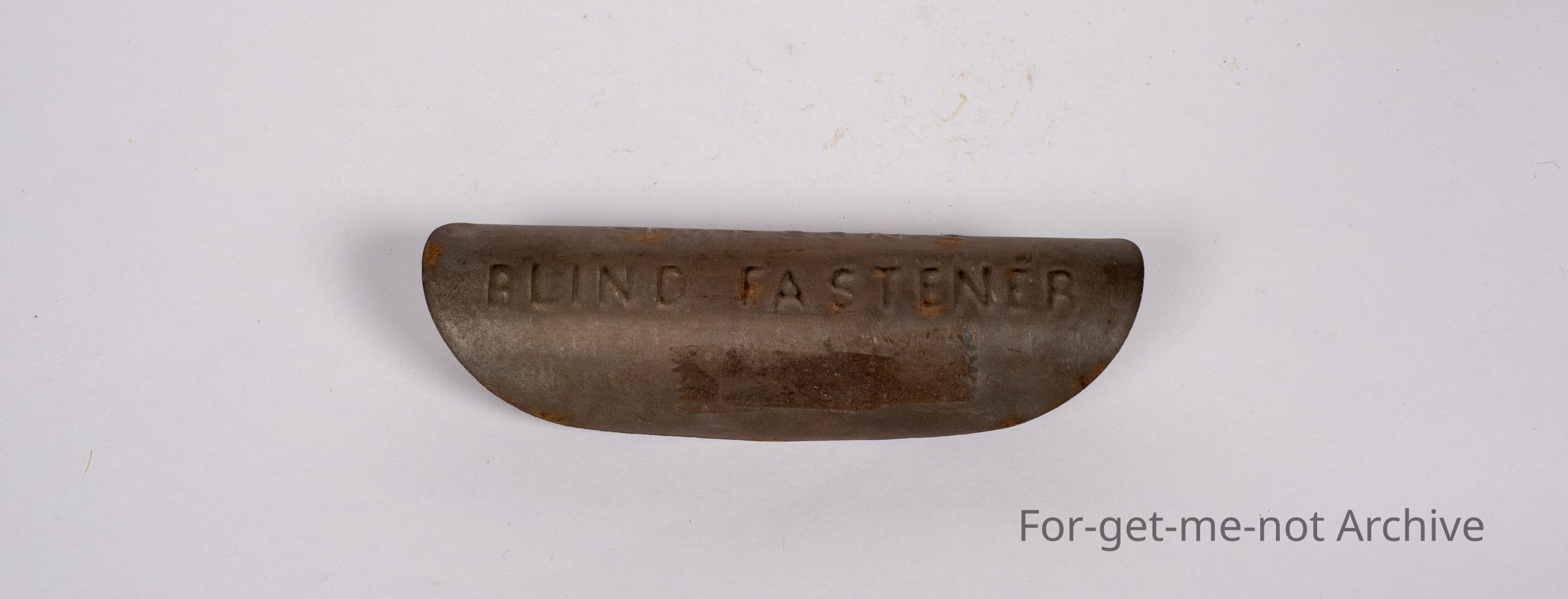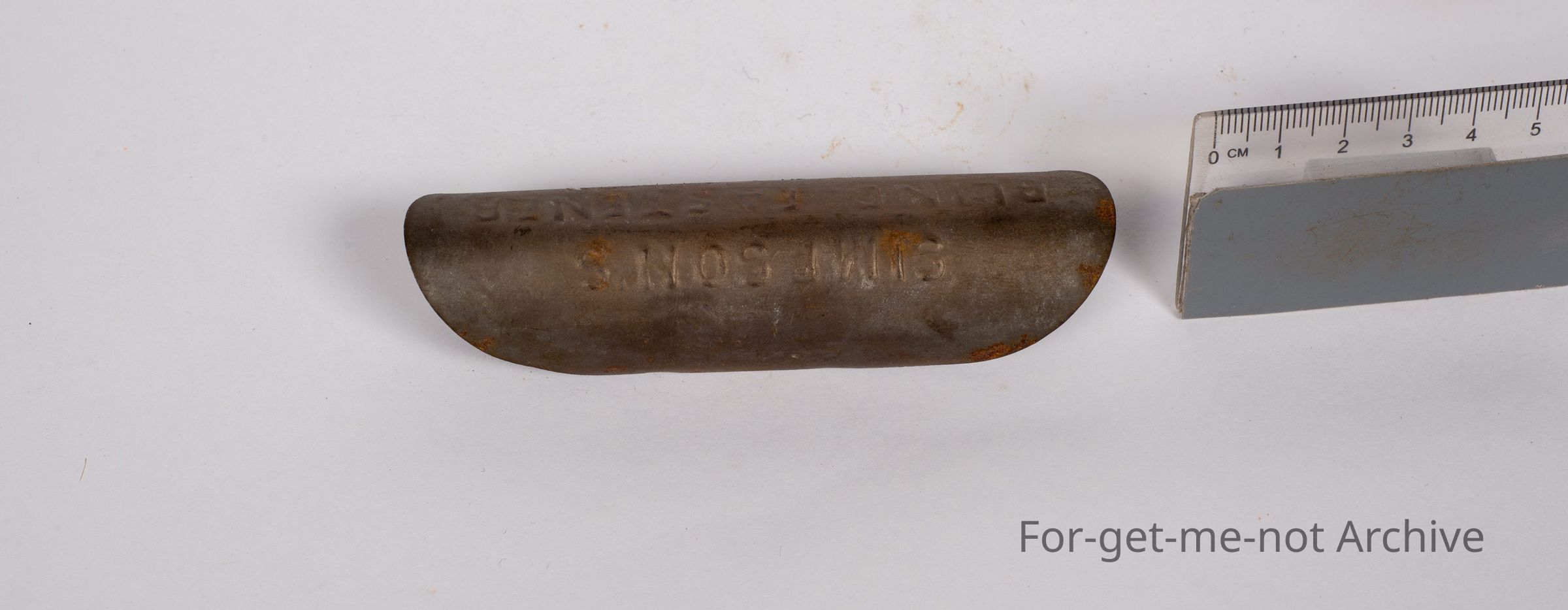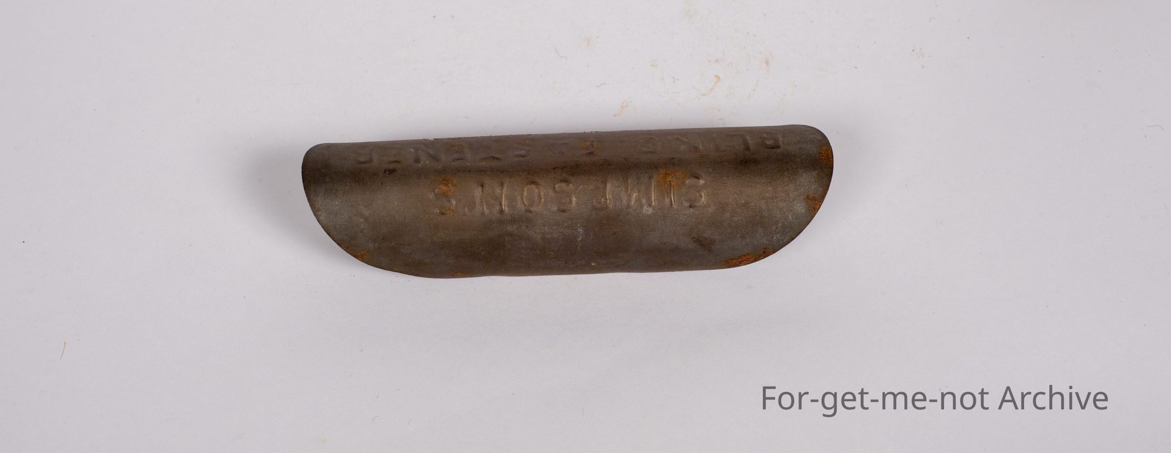 A piece of folded tin, which is, in fact, a Simpson's blind fastener to keep wound up blinds held in position so they will not unwind. An interesting piece of South Australian production history.Collection