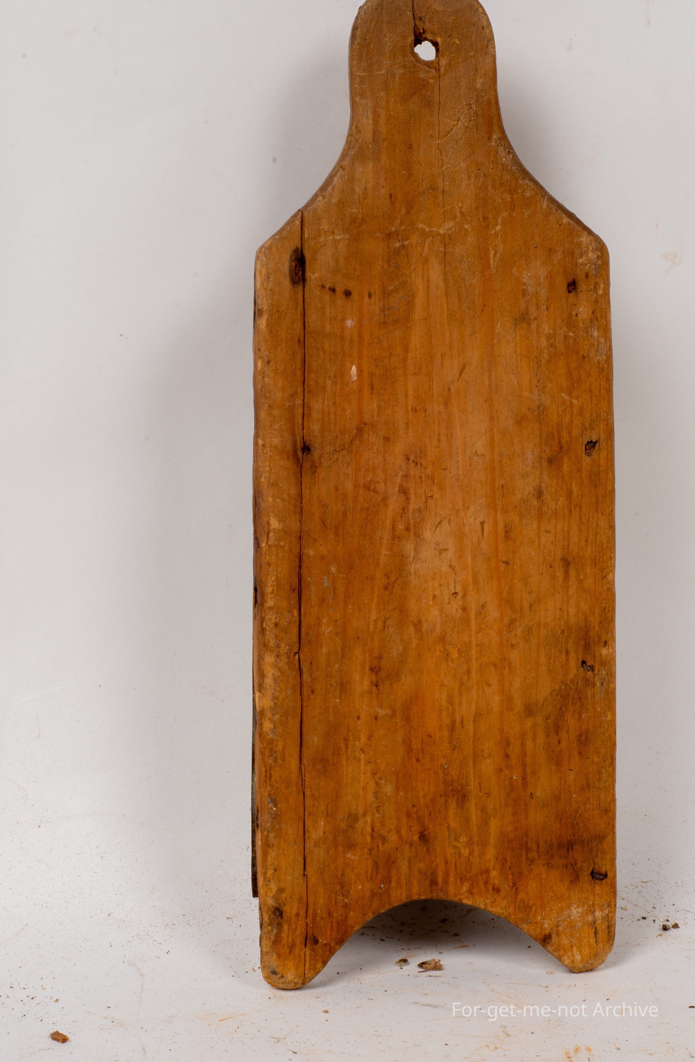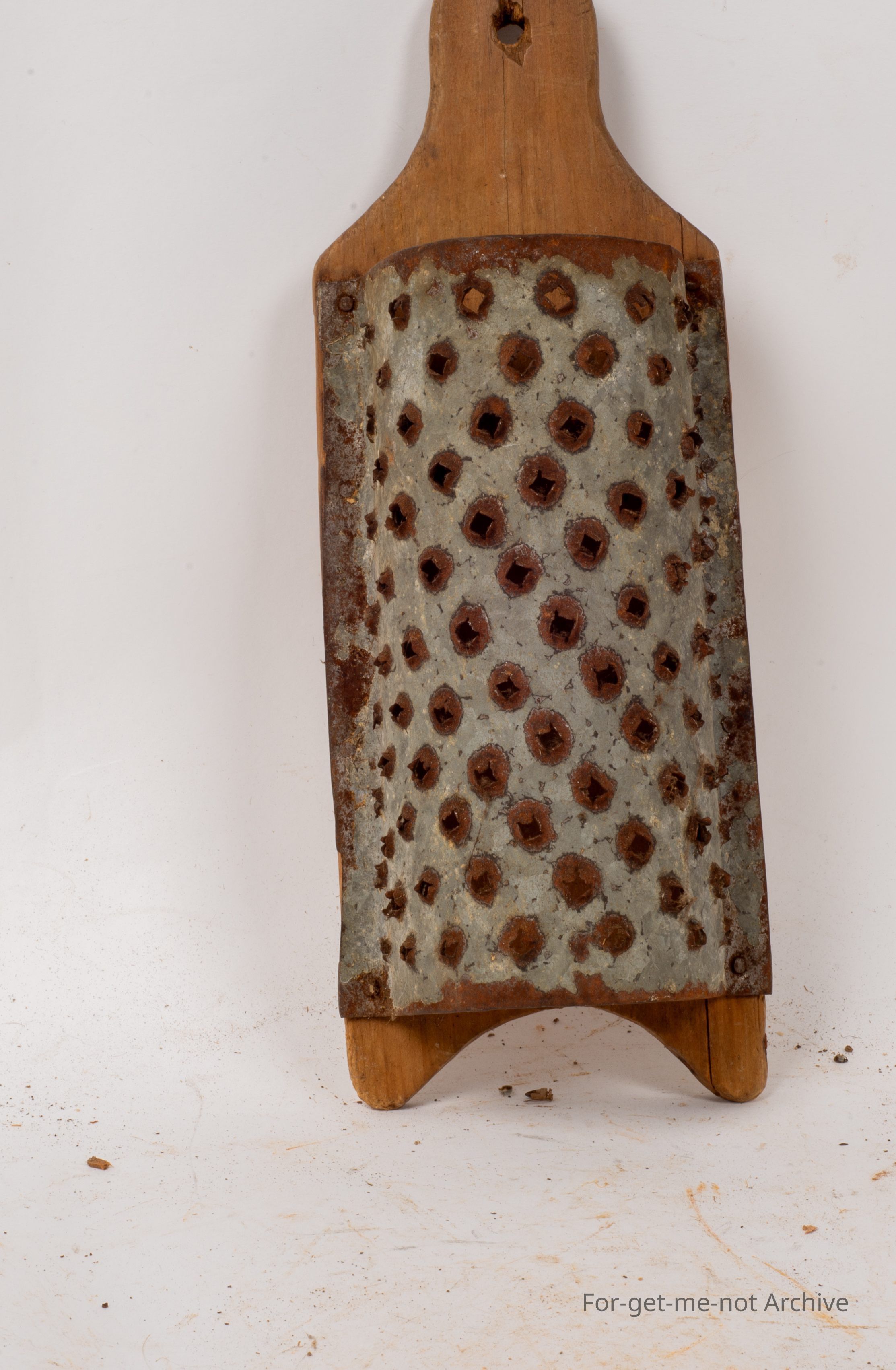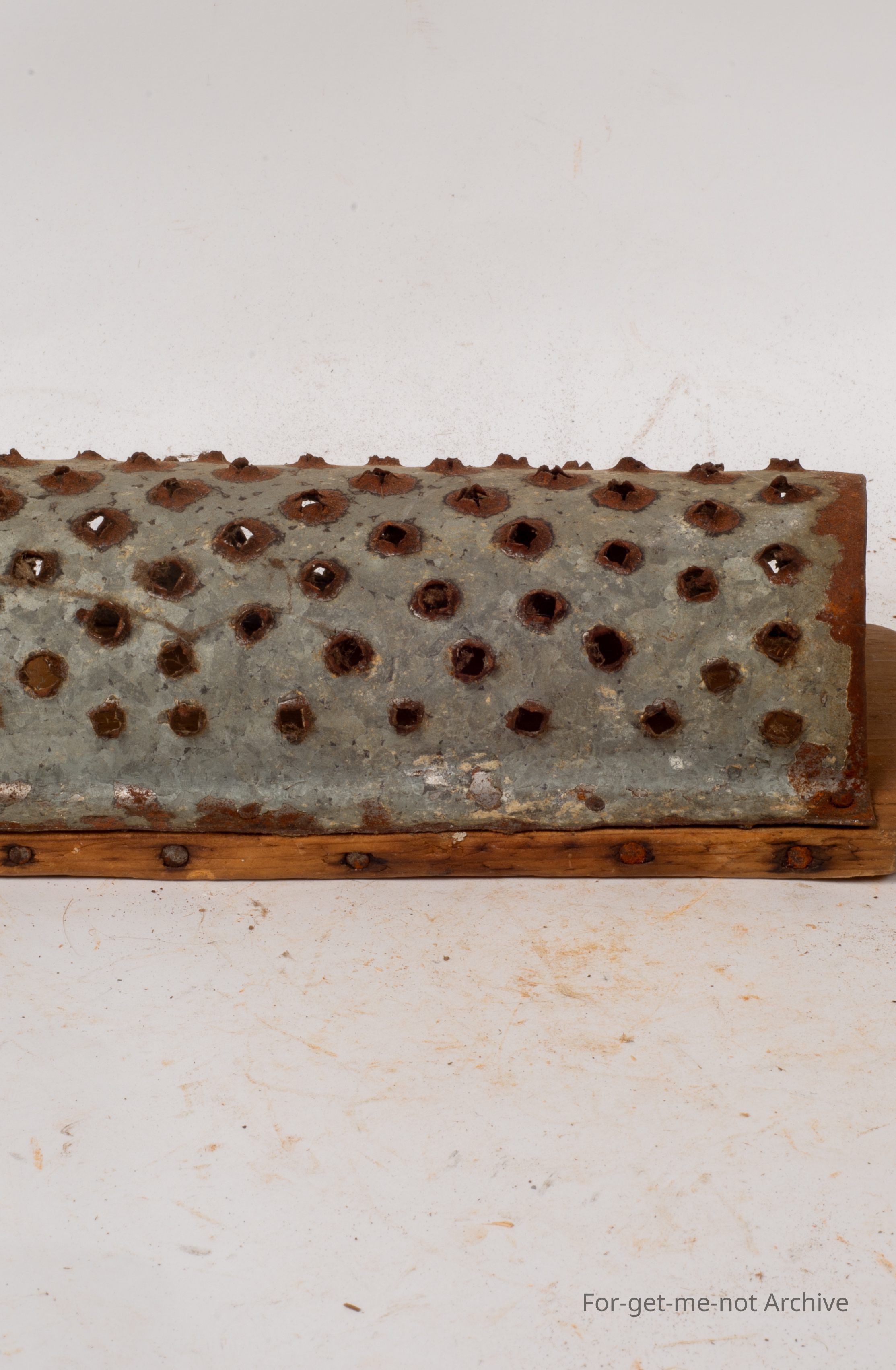 A classic piece of Depression era improvisation. This is a food grater with a wooden back homemade piece of folded tin, attached to the wood to form a grater. The perforations have all been made by nails prior to being hemming on. This is a lovely piece.Collection