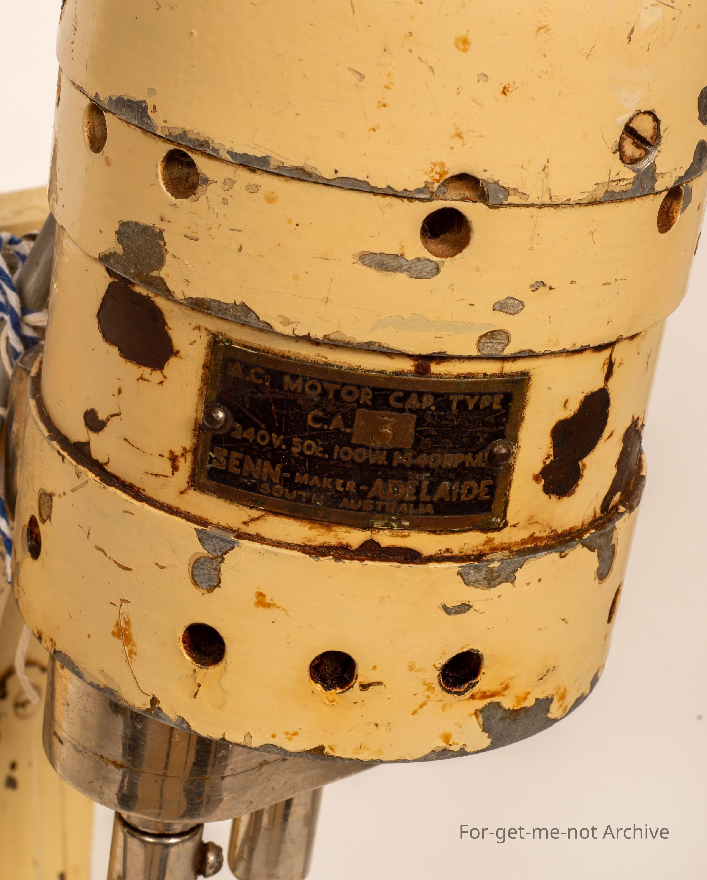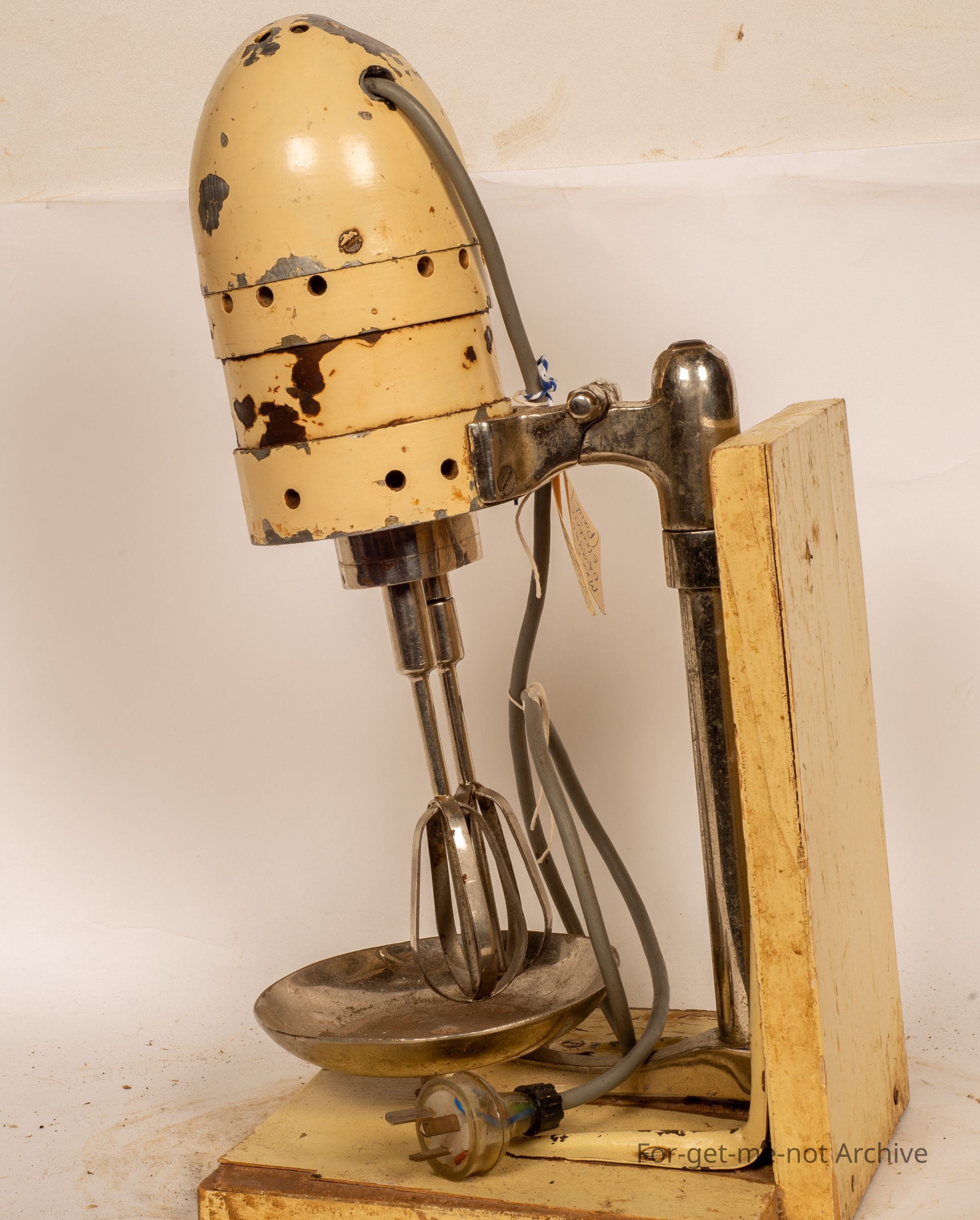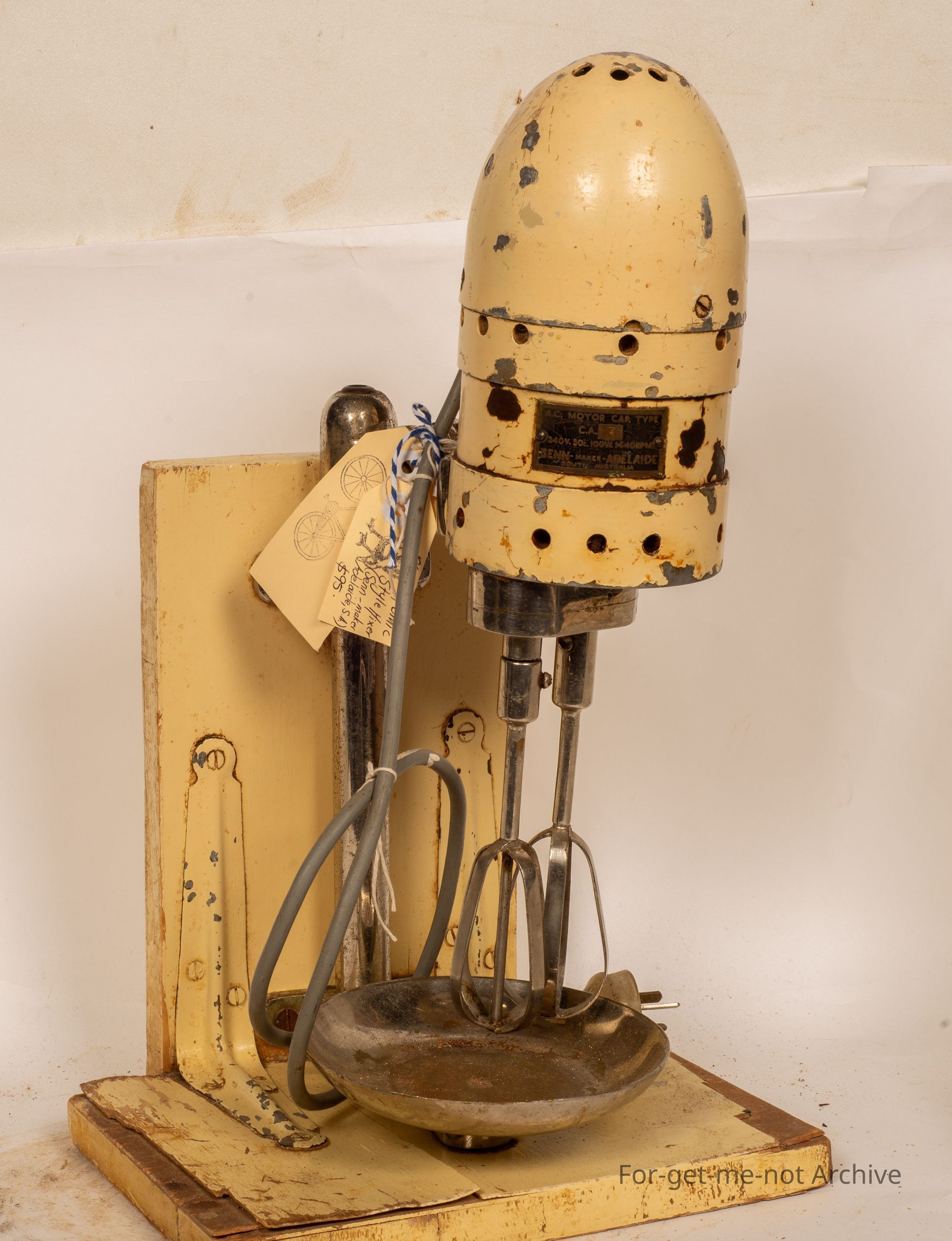 This time, quite a large, almost industrial, food mixer, electric. Has a plaque on it. SEN, S E double N, maker, Adelaide, South Australia. Very unusual piece on a stand. The stand is made of wood to keep this thing upright. All complete,Collection