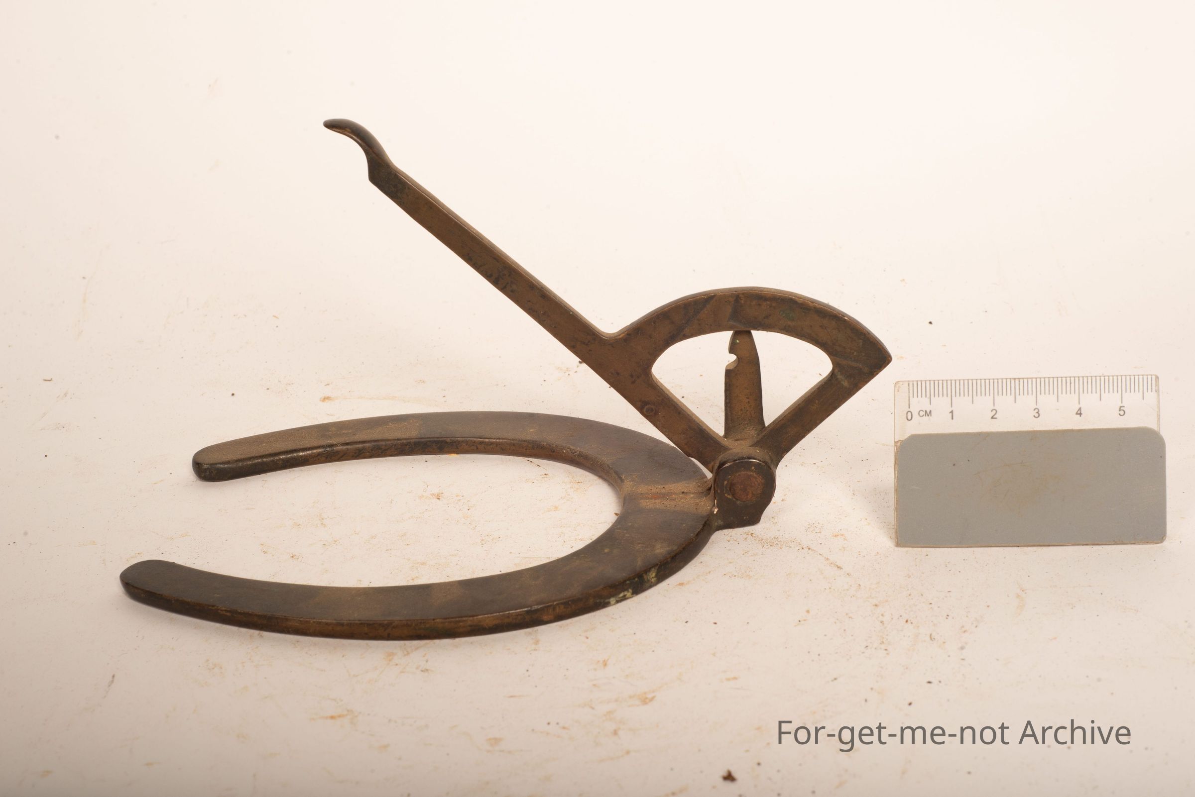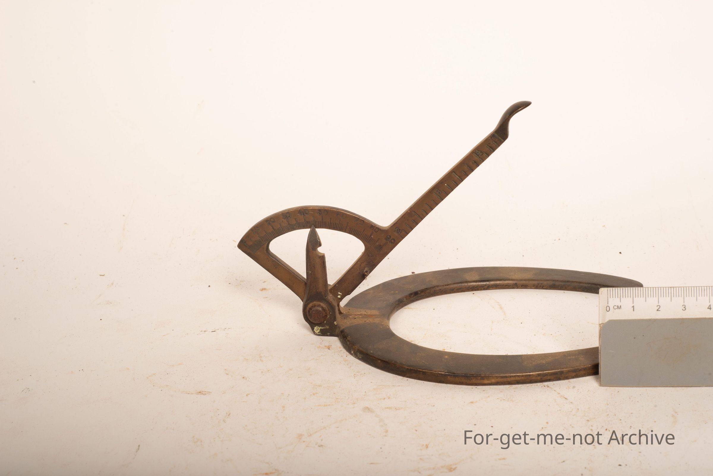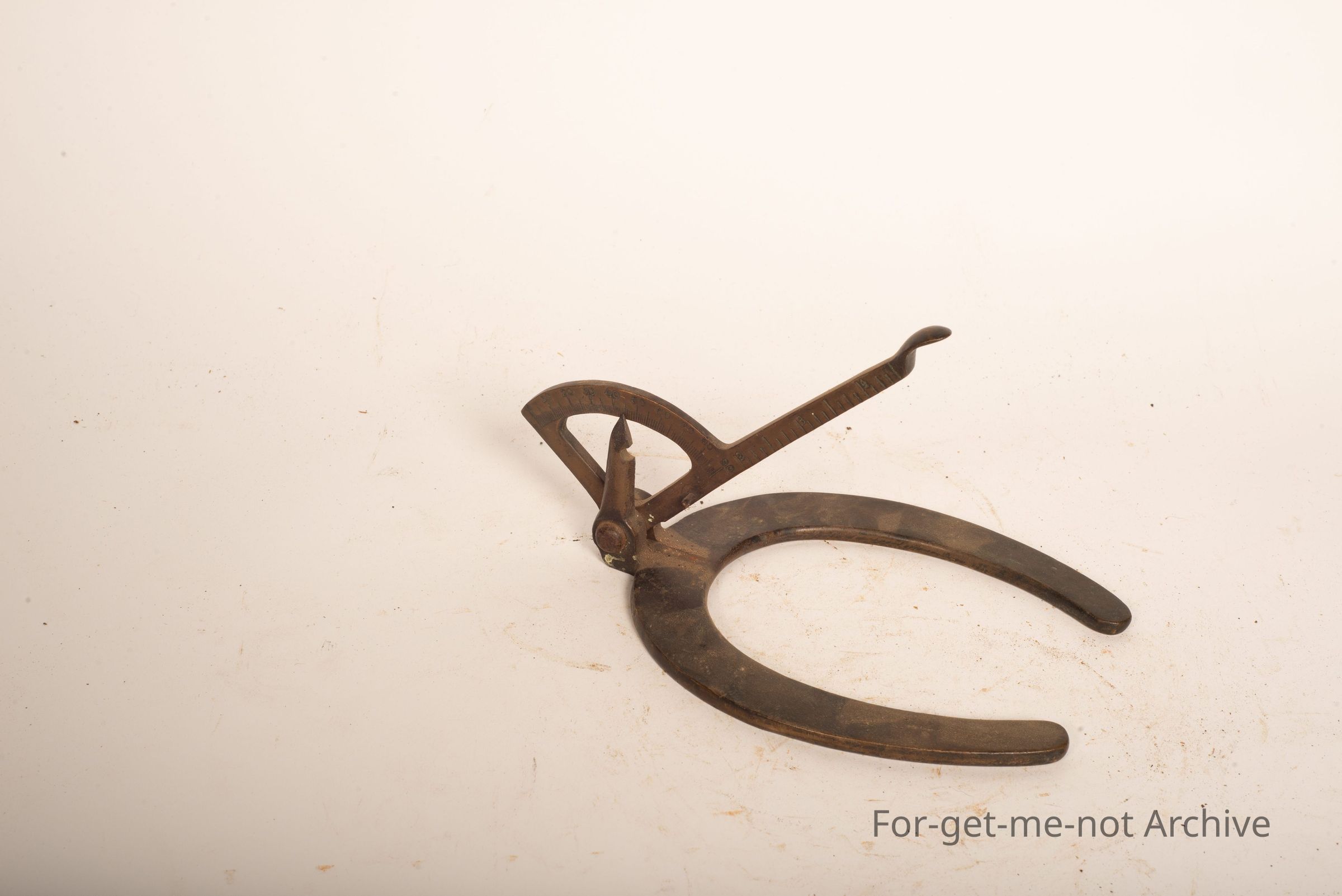 This is a brass farriers, foot measure for making horse shoes to fit the sides of the horse's foot. Quite a few calibrations on it. Early ones like this are reasonably hard to findCollection