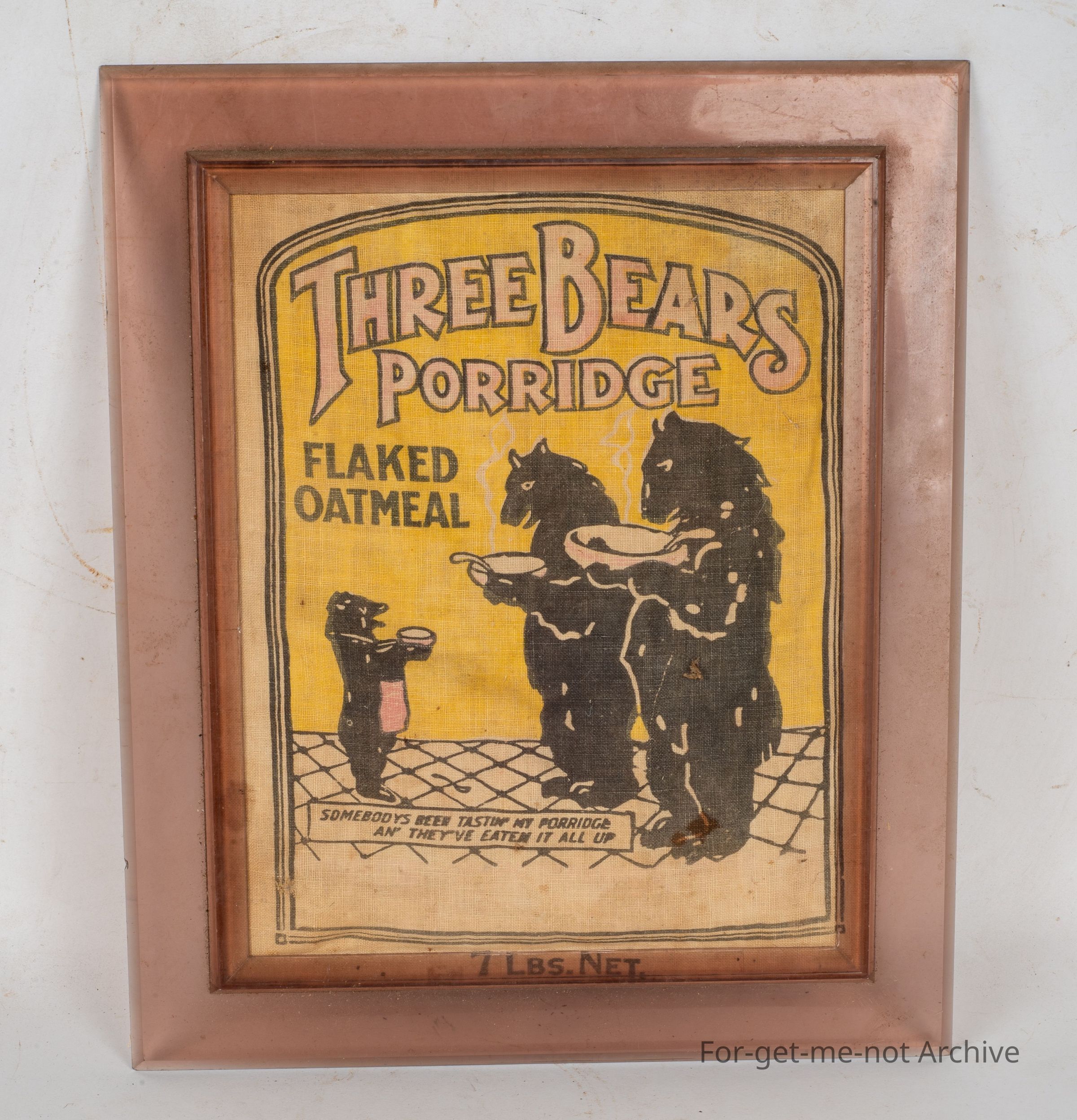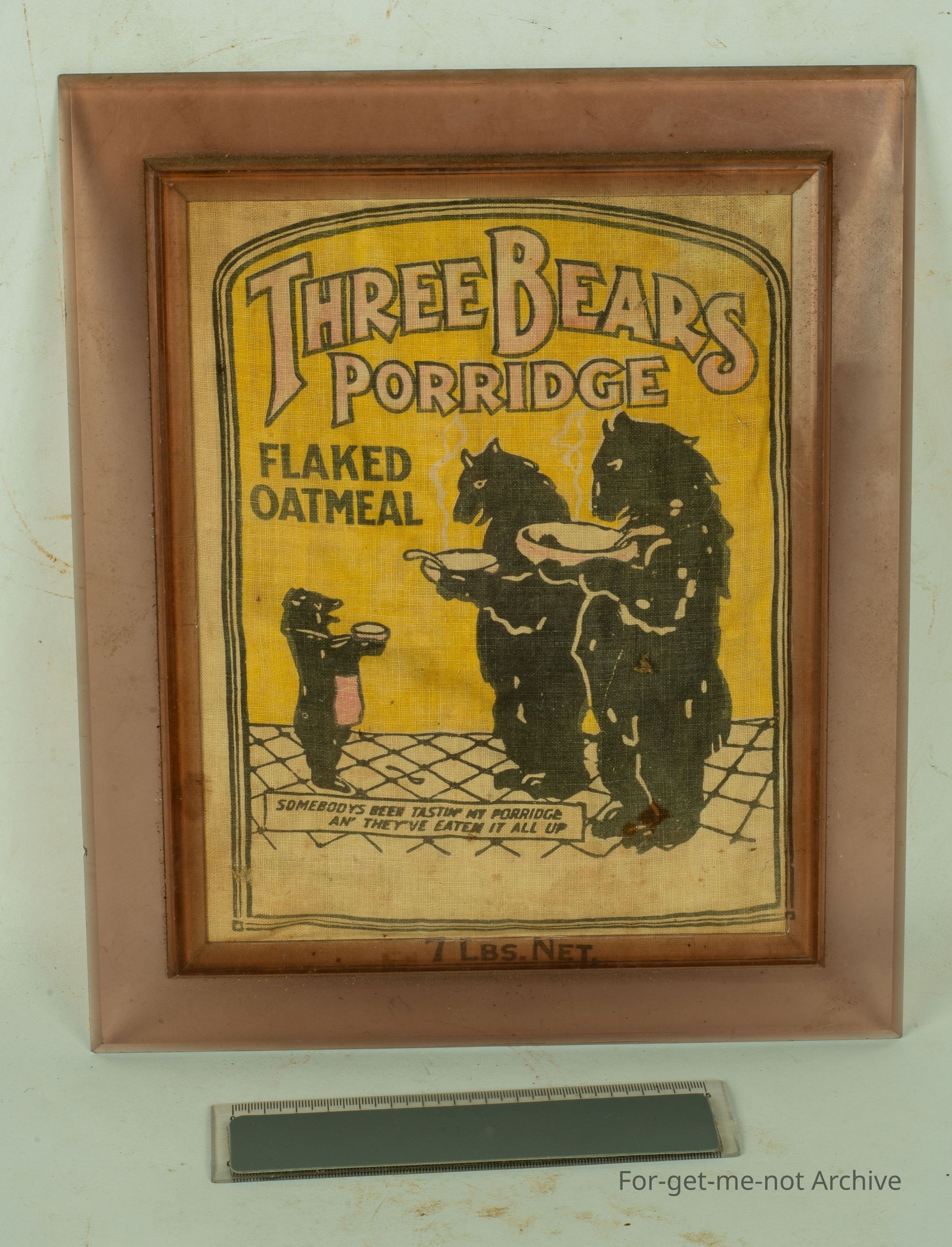 This is a framed cloth bag which once had porridge in it, The bag is named three bears porridge taking off the old nursery rhyme, goldilocks and the three bears