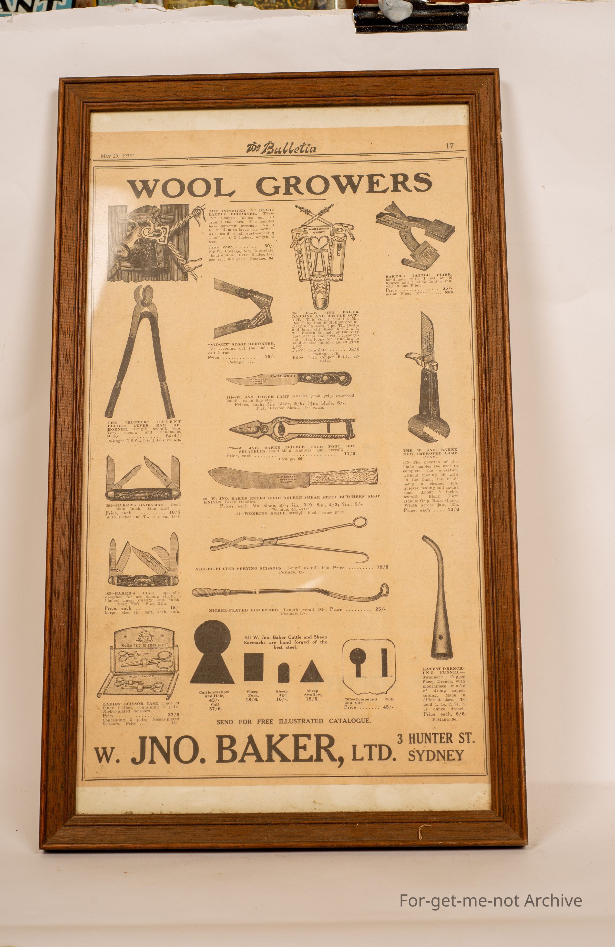 A framed piece from the Bulletin newspaper 1935, advertising for Jno Baker, various, pastoral tools for wool growers that they made