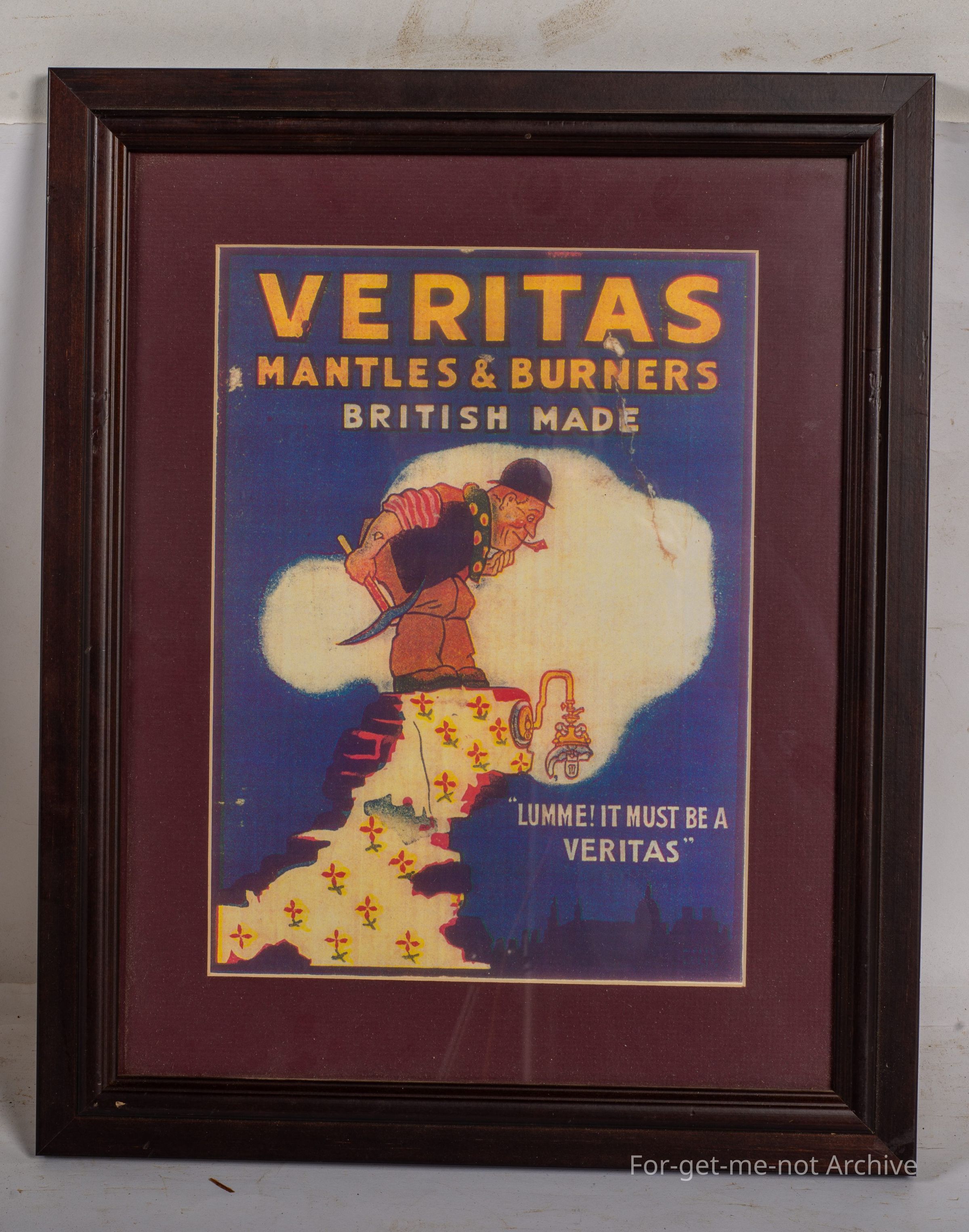 Sangeet Collection. . This is another framed piece of advertising for Veritas mantles and burners, British made. This has a different conical image of a fellow with a pick. The glass on the lamp is broken, but it's still illuminating light. The caption is Lummy, it must be a Veritas.Collection