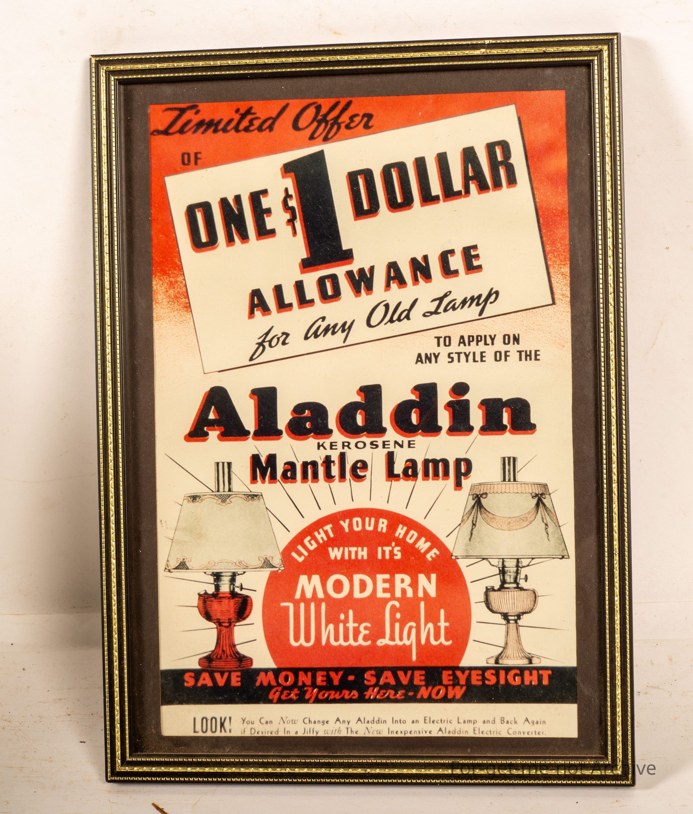 Sangeet Collection. A frame piece. This piece is advertising for a Alladin, Allowance of $1 for any old lamp. This is a smaller version of one we did earlier. In very good order