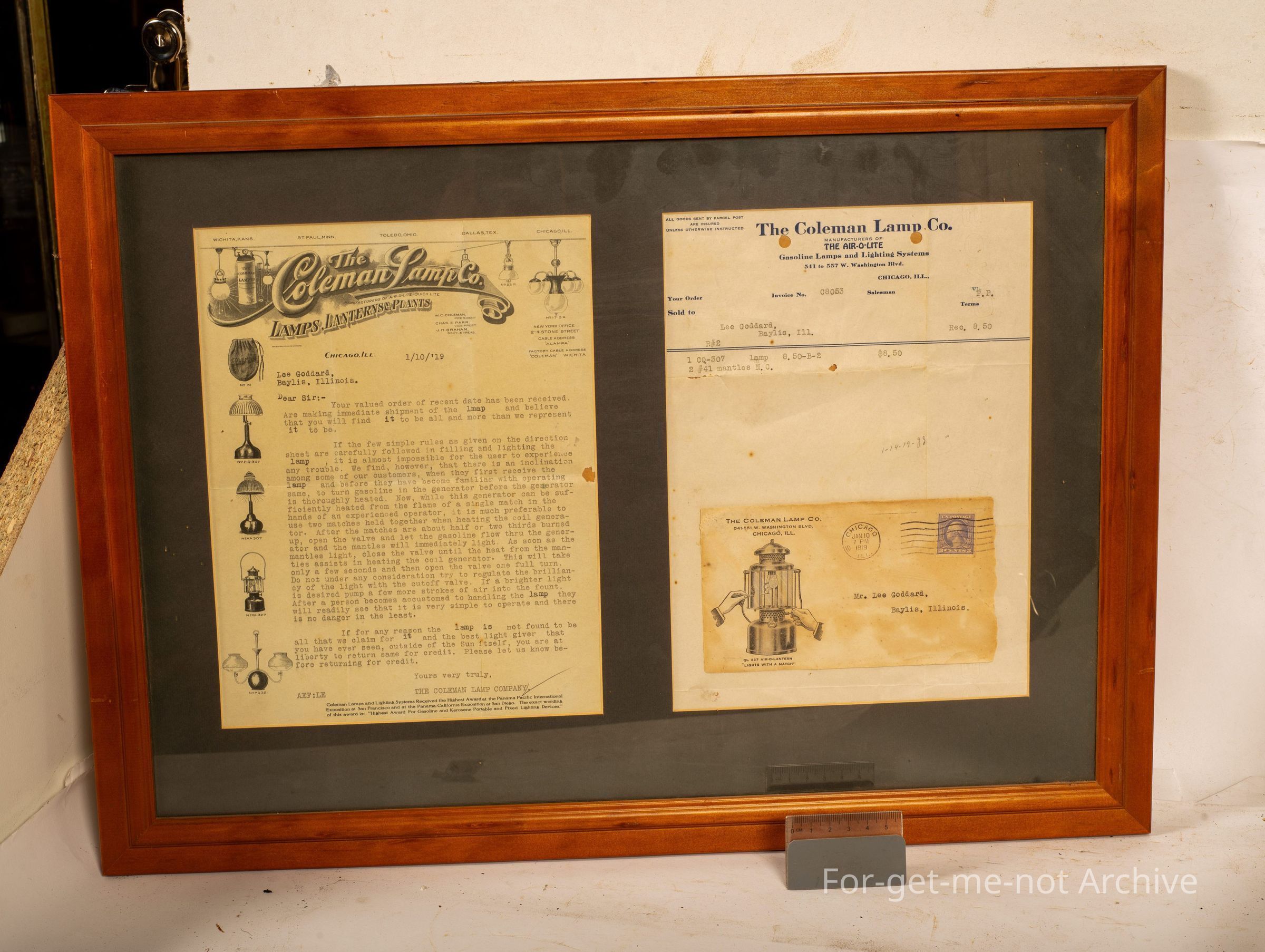 Sangeet Collection. Framed pieces. These are letterheads from correspondence and invoice , from the Coleman Lamp Company. Both these pieces are very genuine. 1919