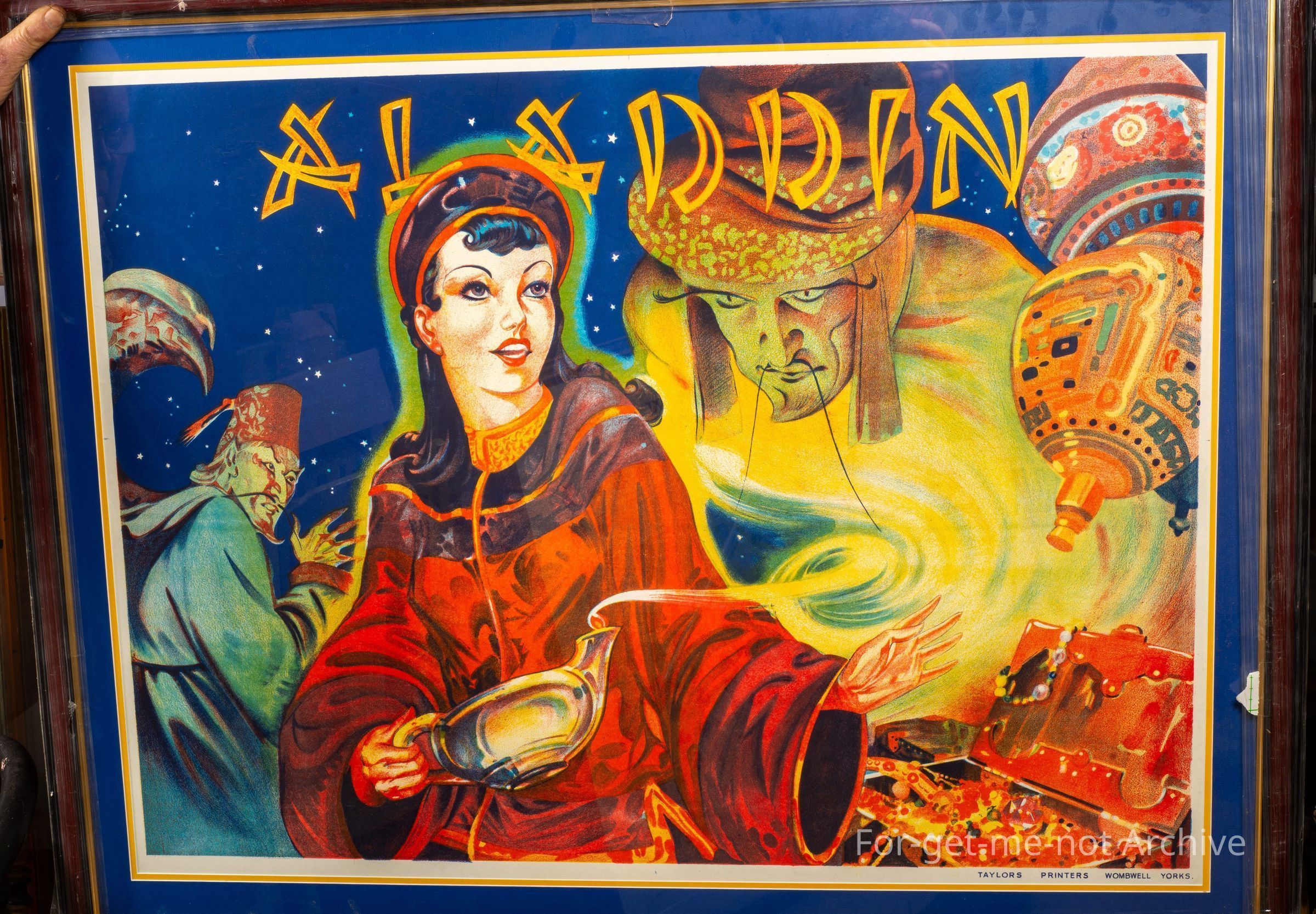 Sandeep Collection. This is a huge, framed, very colourful piece of advertising for Aladdin. A Pantomime poster from the 1930's This features the genies and all the dreams. A very attractive piece printed by Taylor's Printers, Womwell York.Collection