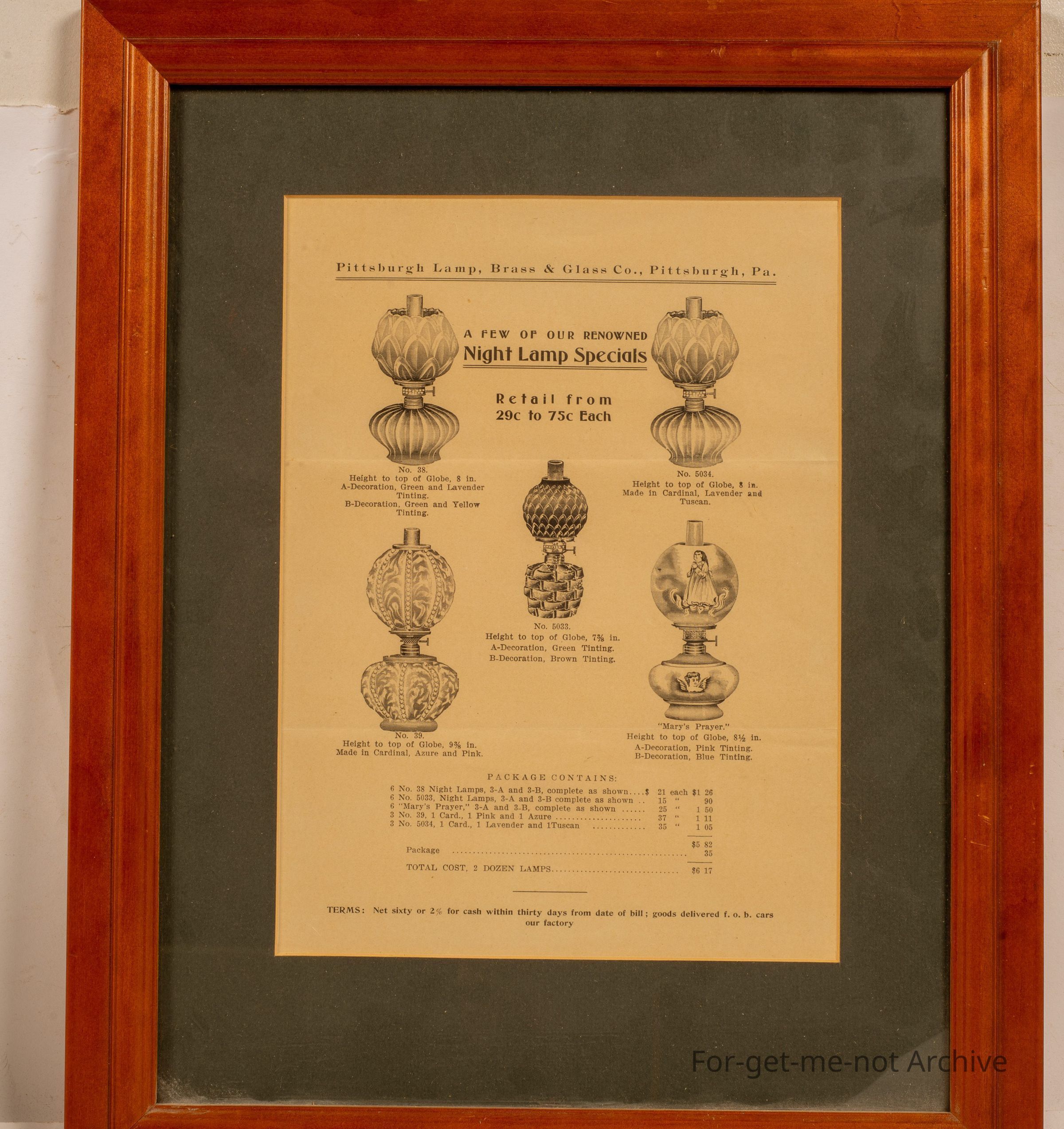 Sangeet Collection. This is a wooden framed, advertising pamphlet for night light night lamp specials from Pittsburgh Land Company. Diagrams of various lamps,