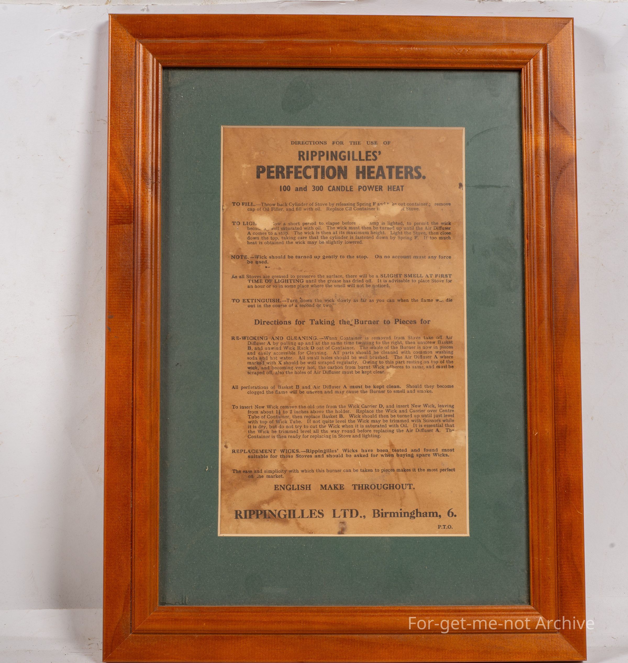 Sangeet Collection . A framed advertising poster piece. The heading is Rippingilles Perfection Heaters. This is a Birmingham piece. The it is, double sided frame which is unusual. Of these unusual heatersCollection