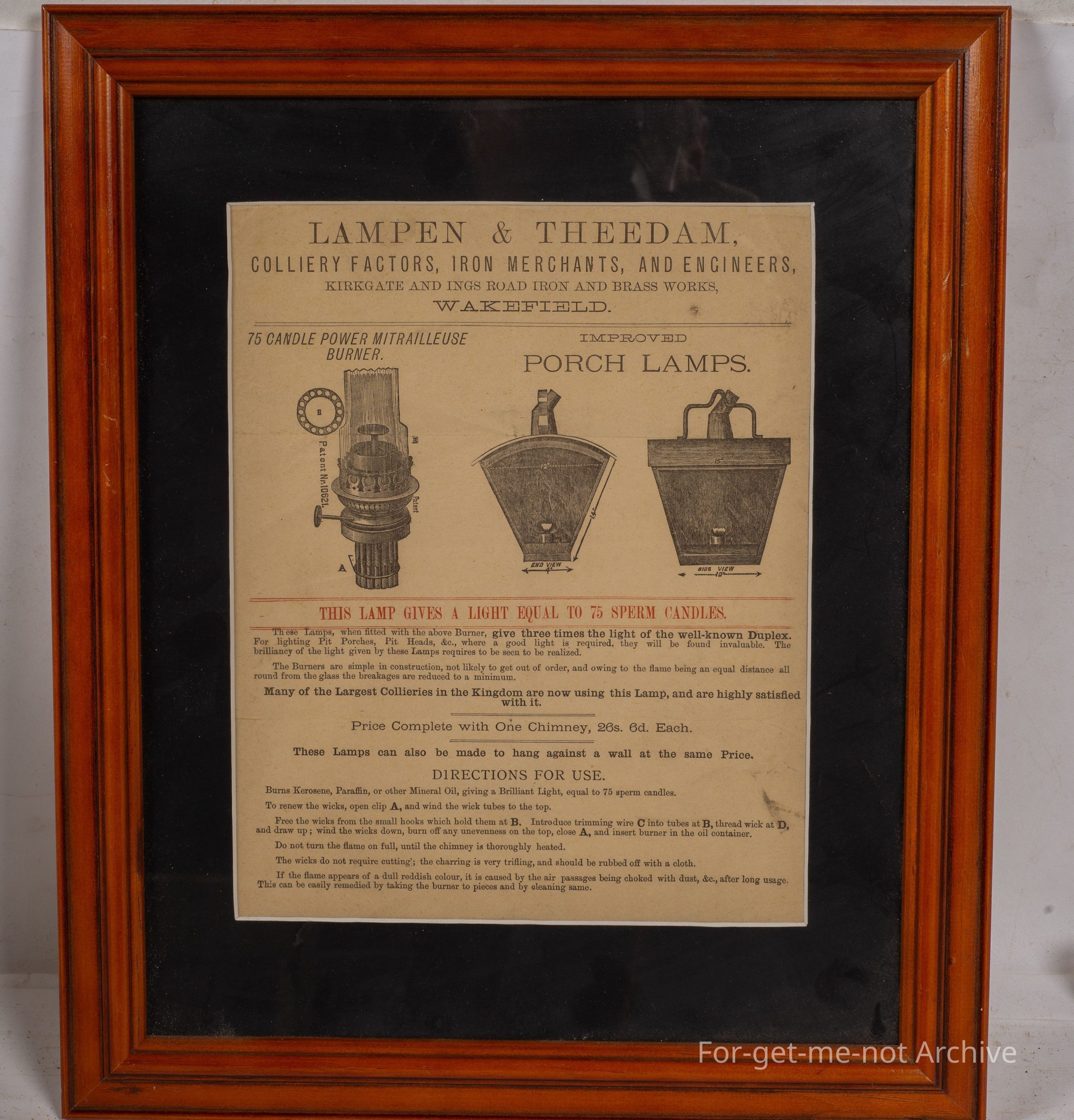 Sangeet Collection. A framed advertising piece, very early, Lampen and Theedam, colliery factors, iron merchants and engineers. This states at the bottom that this lamp gives a light equal to 75 sperm candles. There'll be very early, graphics of the particular land.Collection