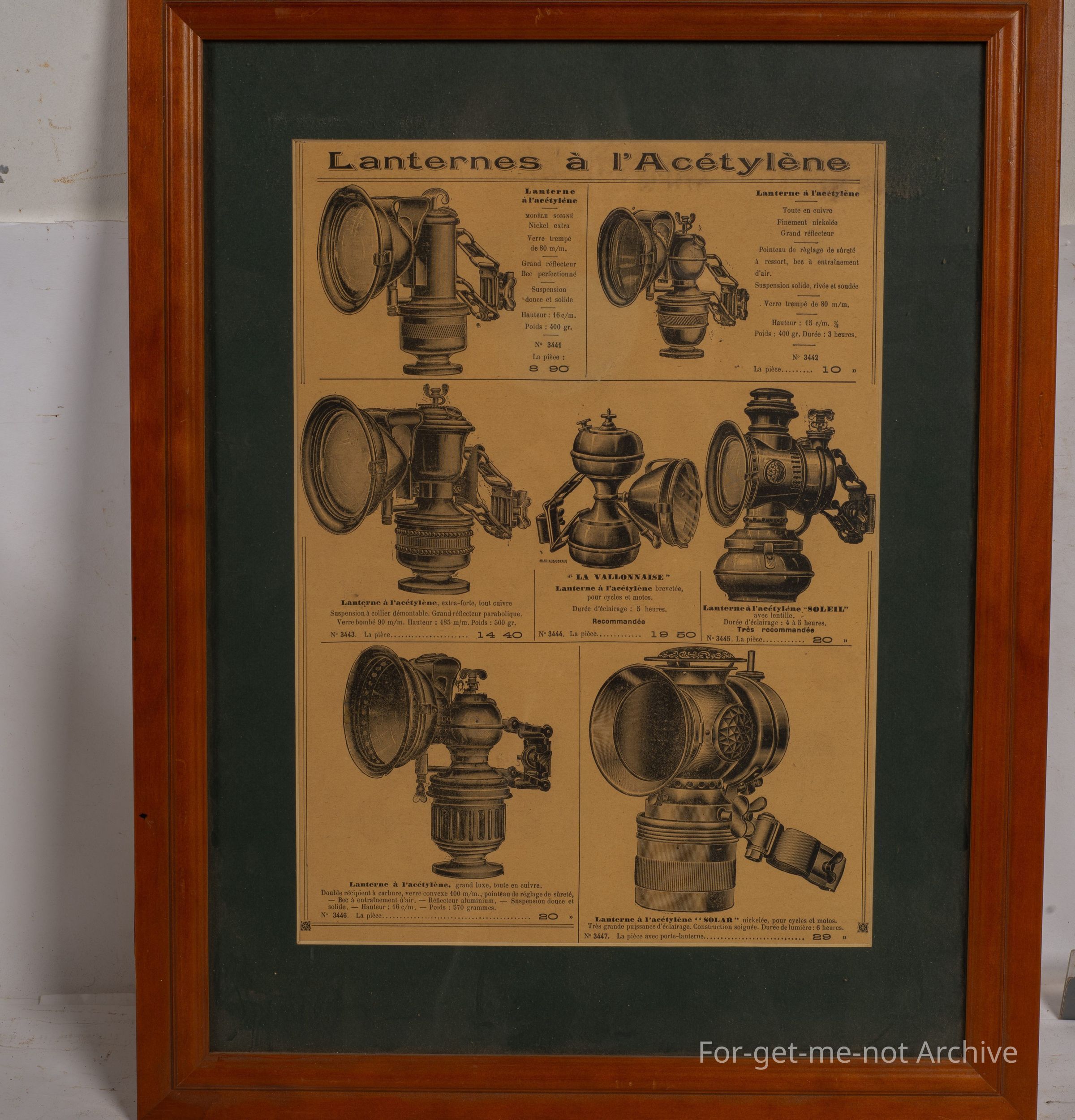 Sangeet Collection. A framed advertising piece in a wooden frame, details. This is for lanterns of acetylene, so they're carbide lights. These are very early lights from push bikes and motorbikes by the appearance. Very clear graphics.Collection