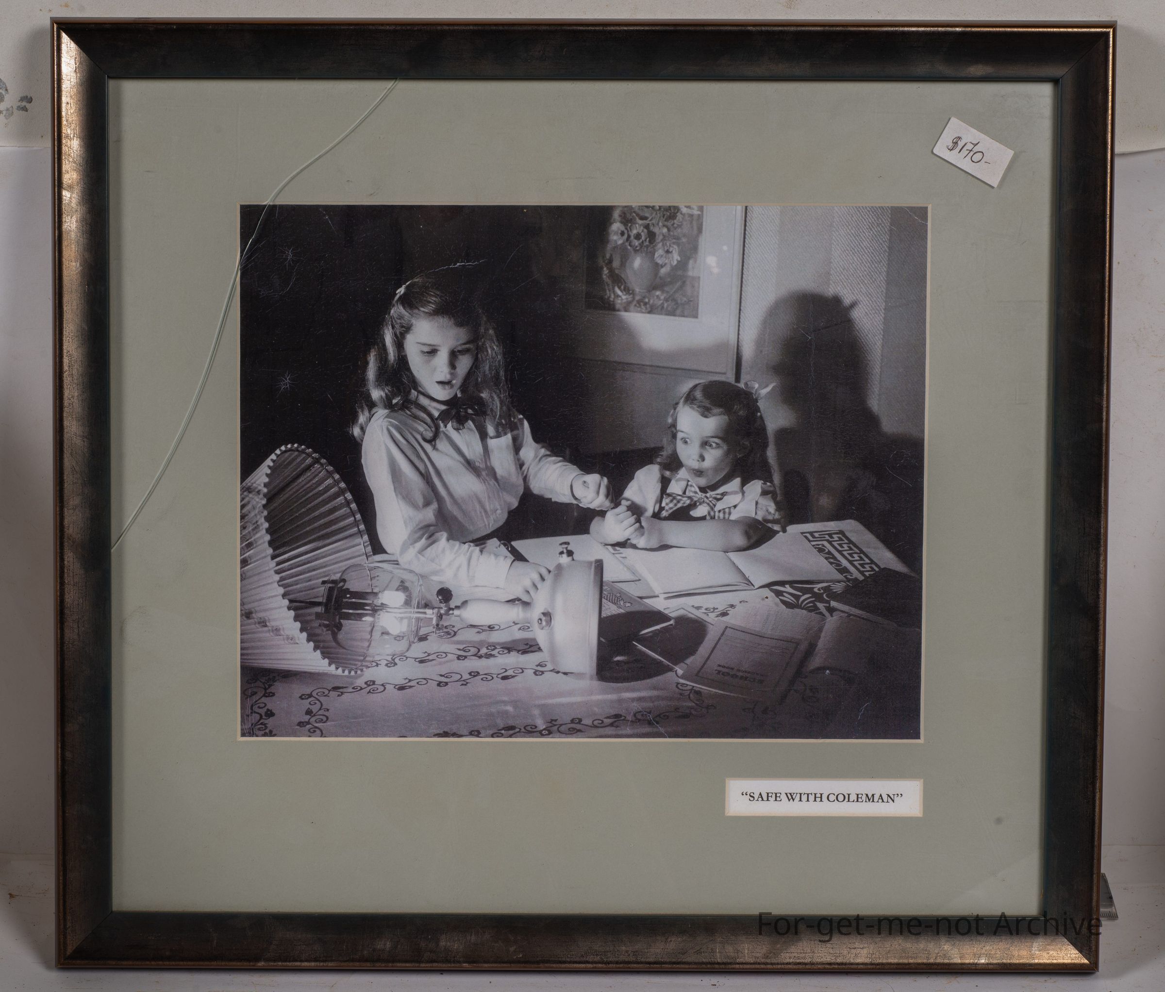 Sangeet Collection. This is an image. 2 kids that have knocked a lamp over stating "Safe with Coleman". This one has been framed but the glass is cracked.