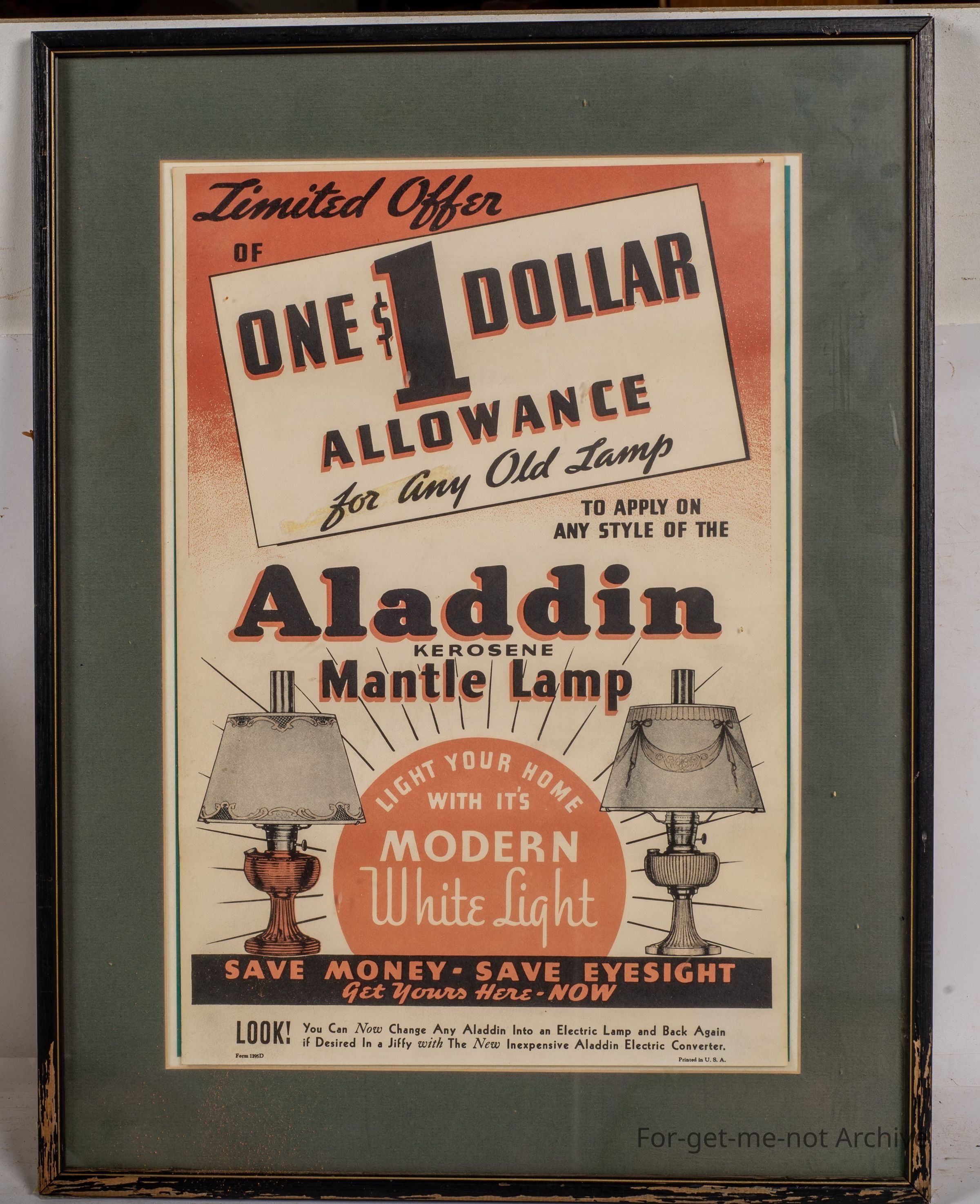 Sangeet Collection. A framed advertising piece. This time from Aladdin stating, Limited offer. Allowance for any old lamp. This is to promote the Aladdin Kerosene Mantle Lamp. Modern white , in very good order.Collection
