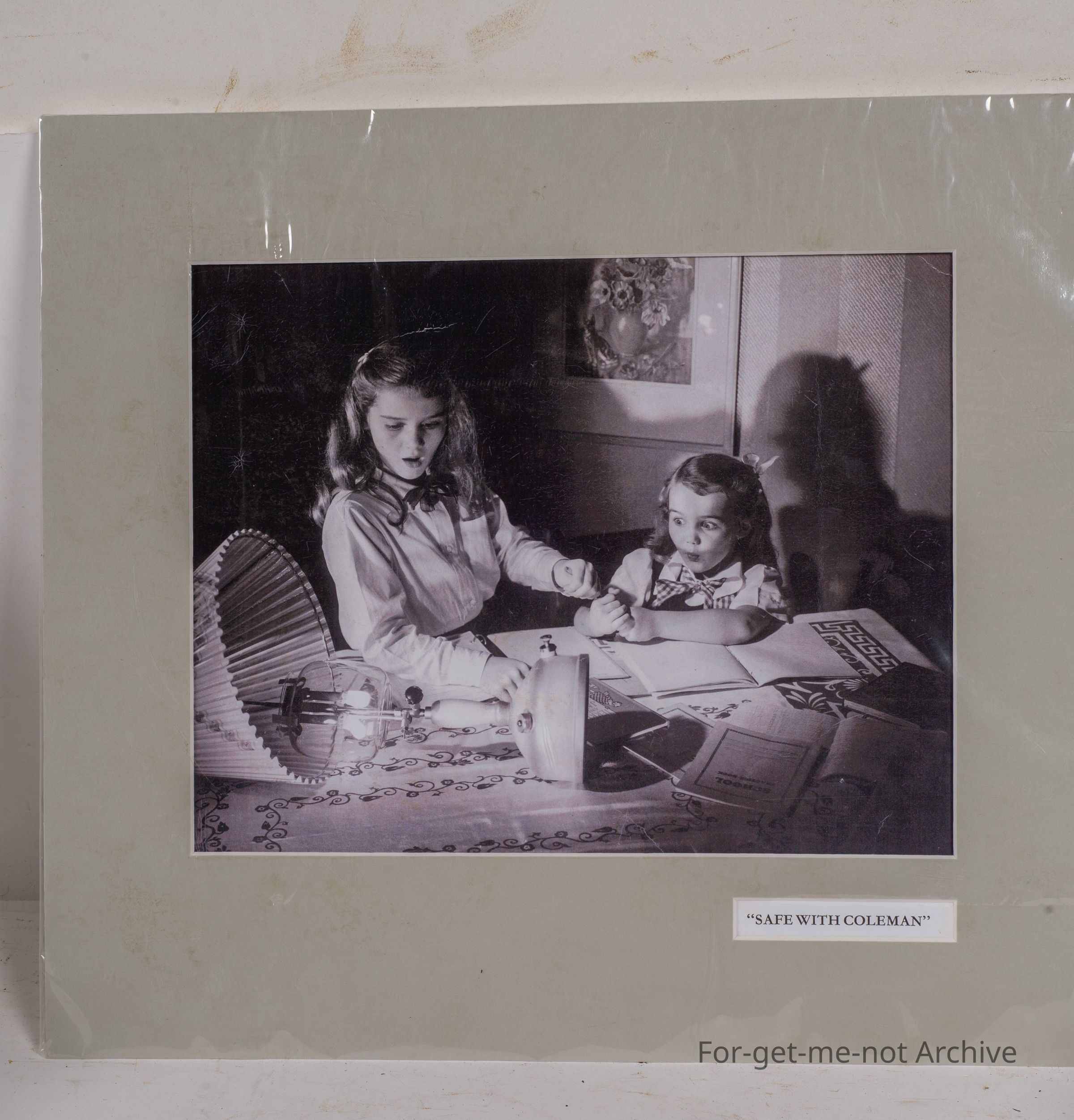 Sangeet Collection. This is a piece that only has the backing, board. It is an advertising, image of 2 kids that have knocked the lamp over and it set the states "Safe with Coleman". This is ready to frame, wrapped in cellophane.Collection