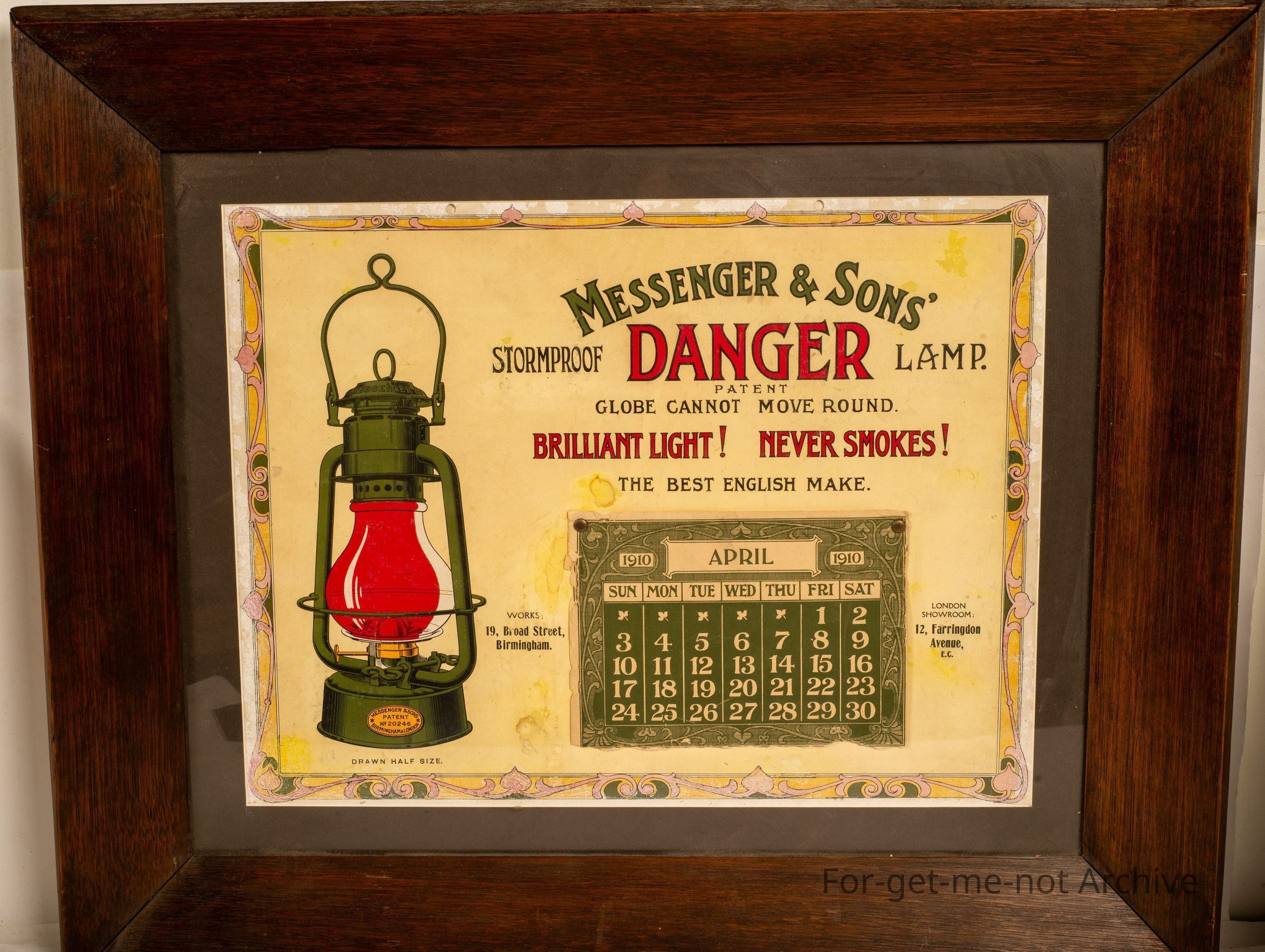 Sangeet Collection. Framed. This is a wonderful piece of early advertising from Messenger and Sons. Advertising the Storm Proof Danger Lamp, which is which is a reference to the red lens in the hurricane lamp. This advert includes a small calendar, from 1910. A very early, very genuine piece.Collection