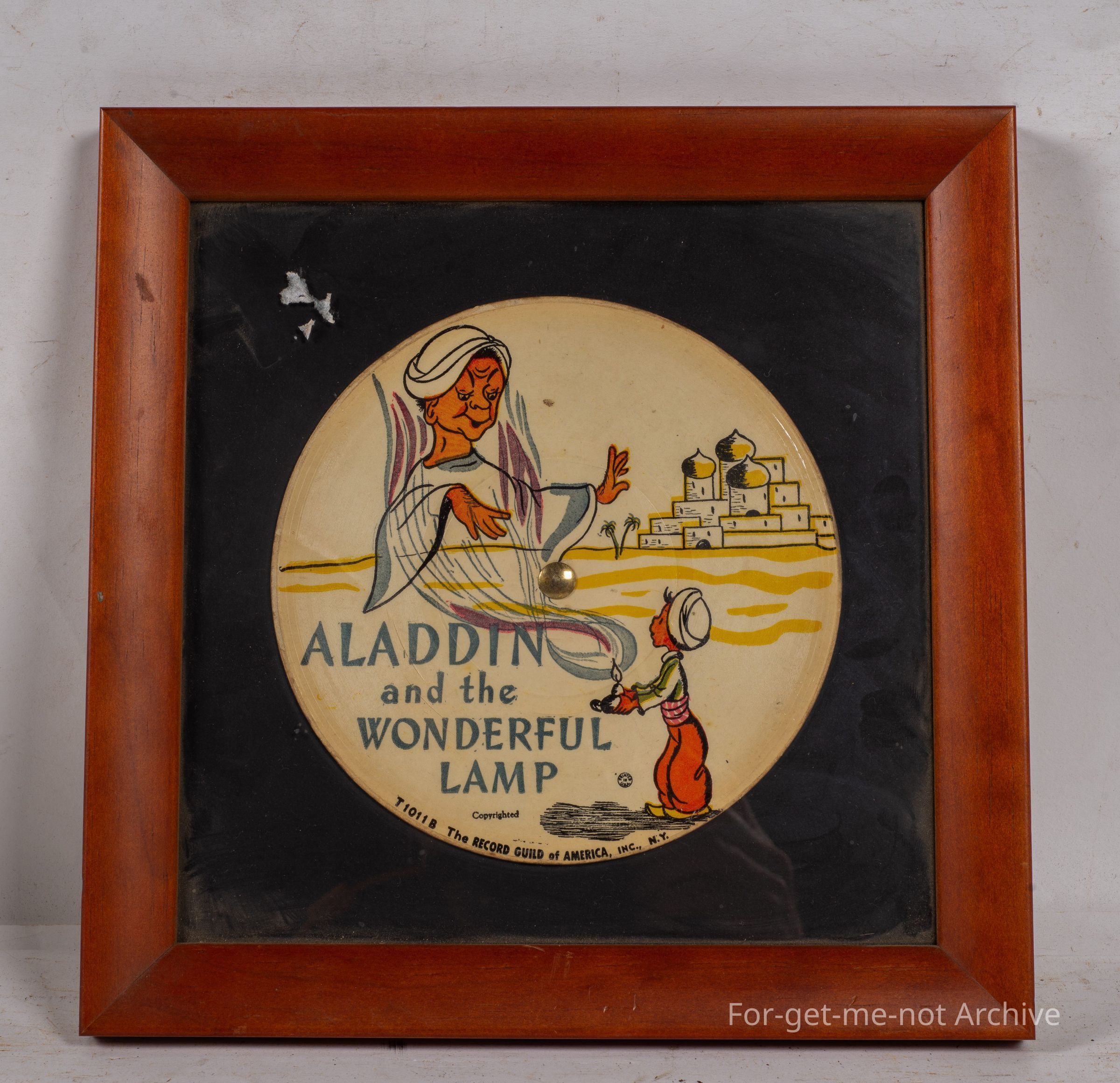 Sangeet Collection. This is a framed record which says "Aladdin and the wonderful lamp" in the form of a record, with the genie working, a mosque in the background. This looks to be an authentic piece.Collection