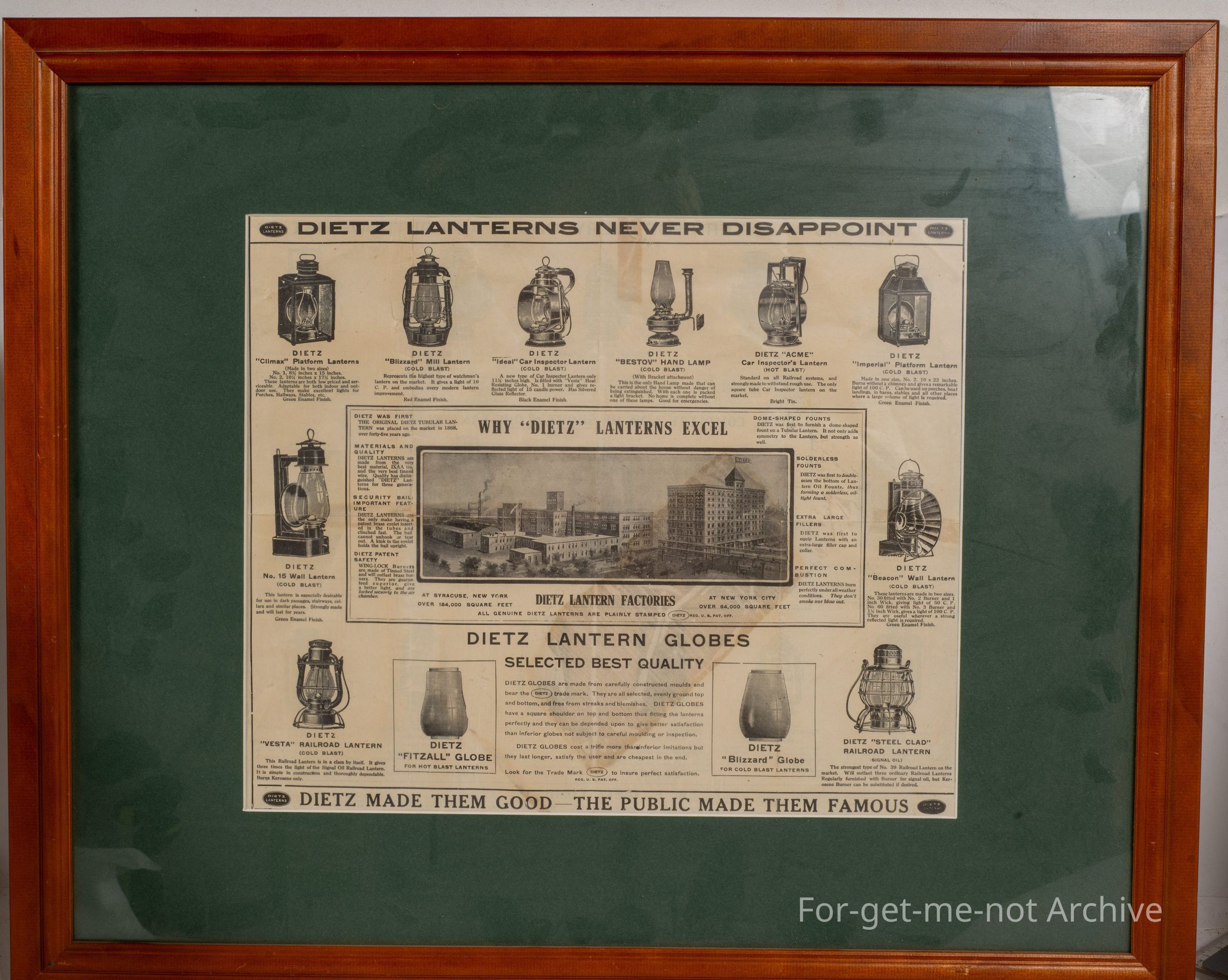 Sangeet Collection. A wooden frame piece of, genuine advertising for, Dietz Lanterns never disappoint. Various, graphics of all the different types of lanterns they have with a scene of the Dietz Factory in America. Very good piece.Collection