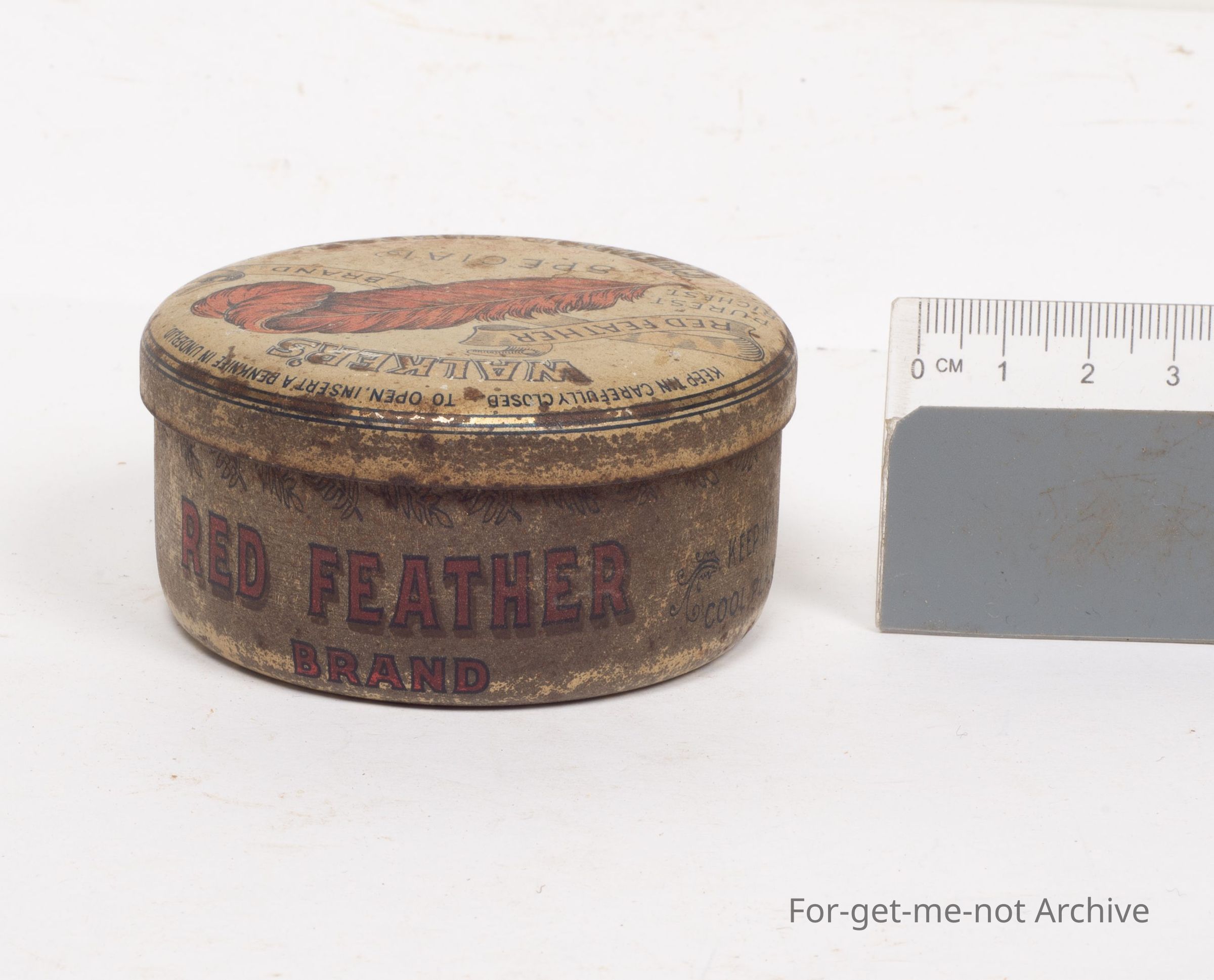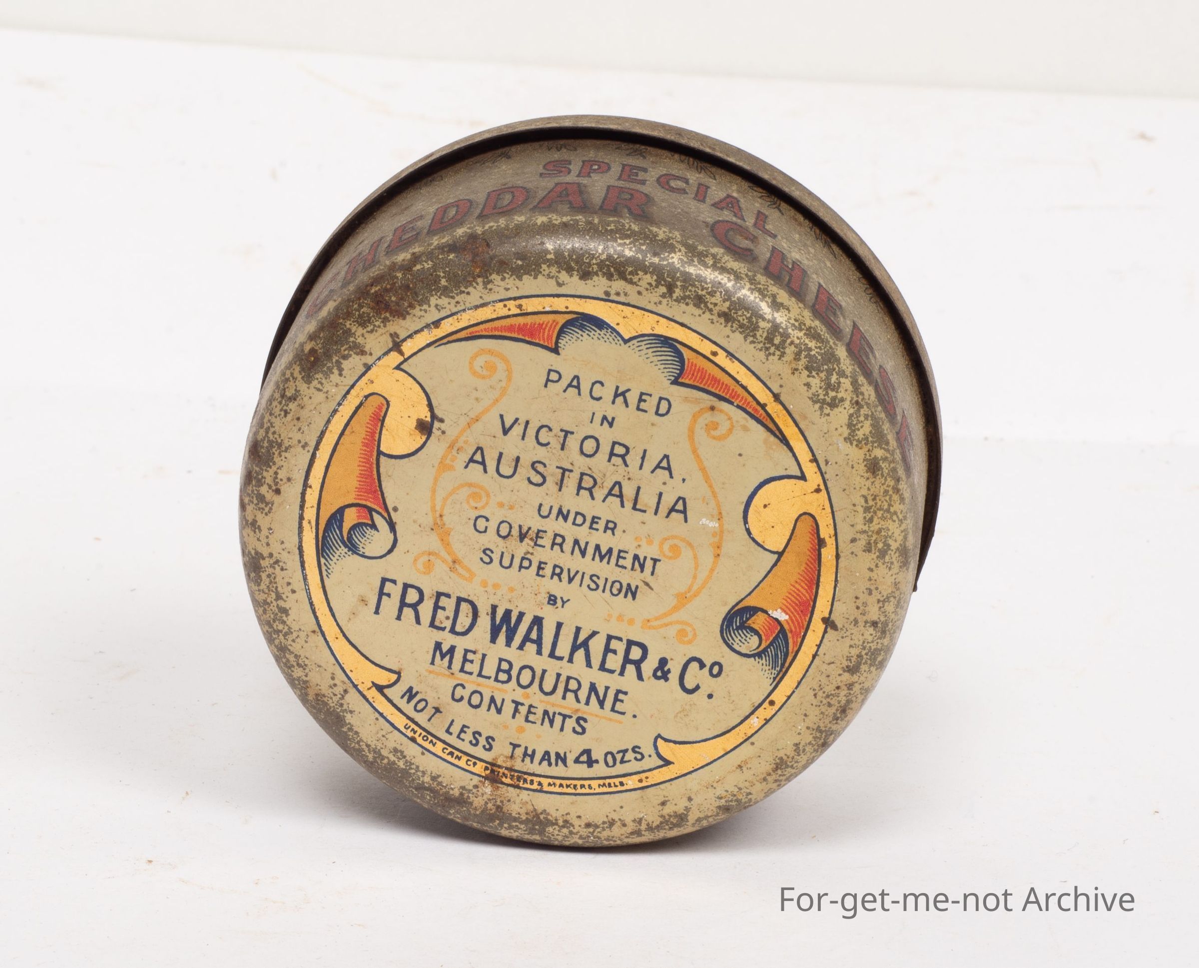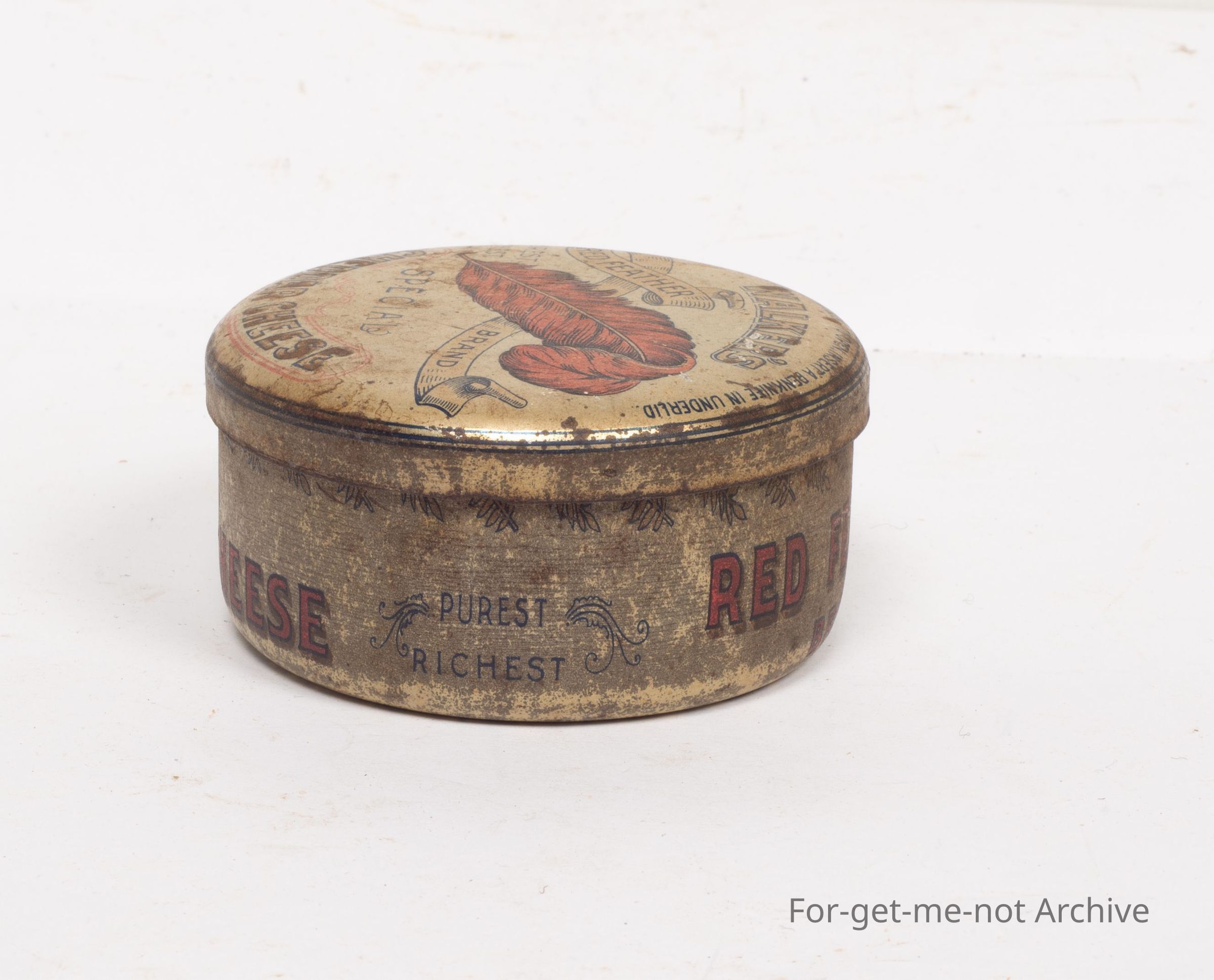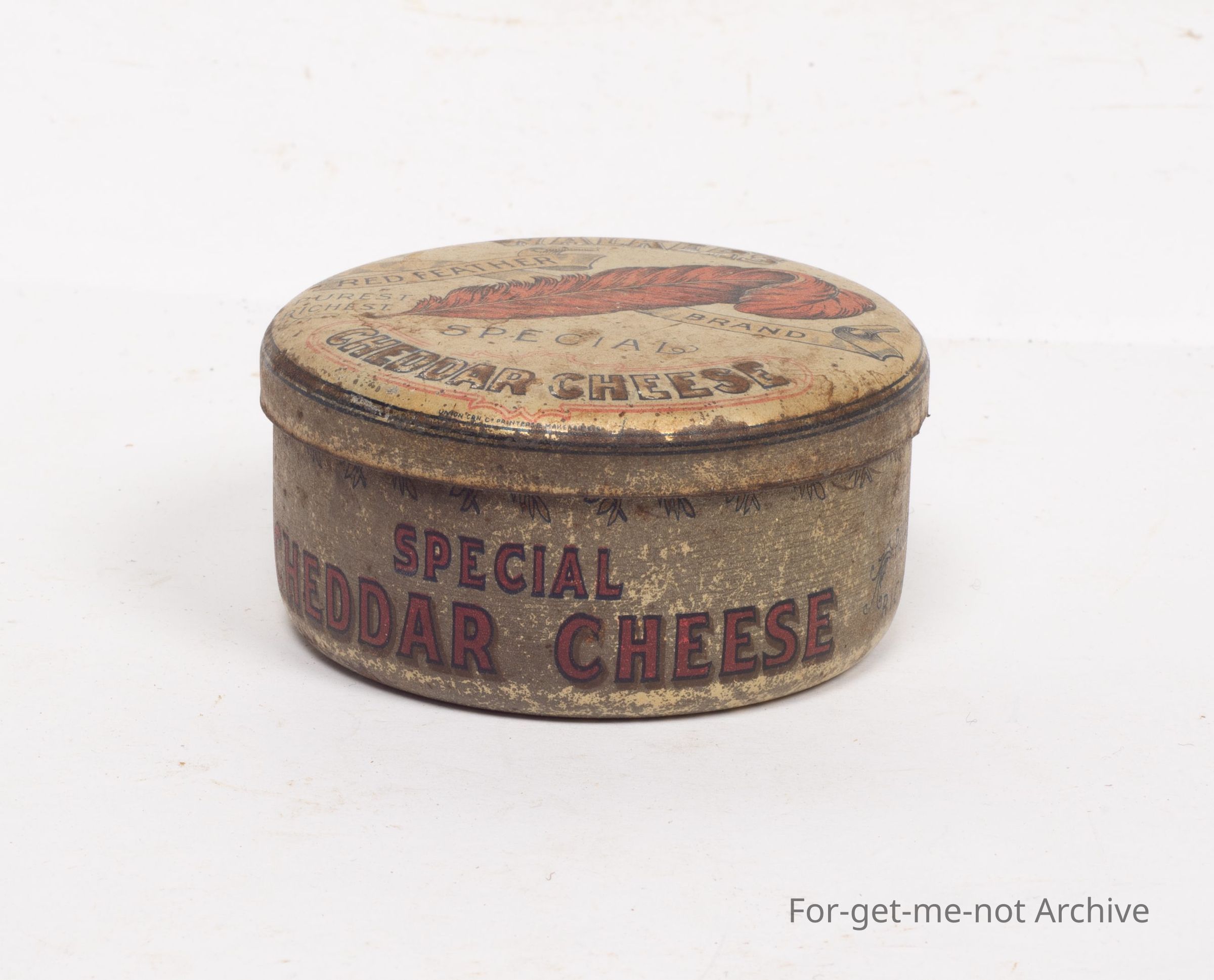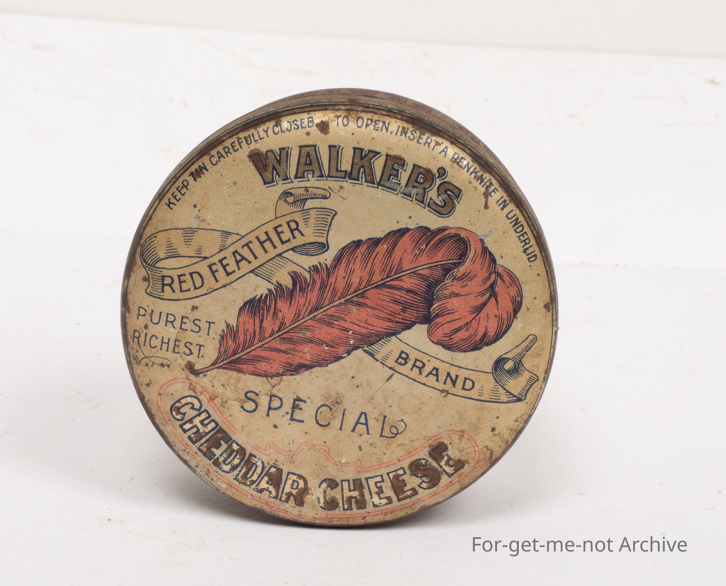 This is a tin of Walker's Red Feather Brand Special Cheddar Cheese. Quite lovely brackets with a red squalled feather. A rare tin, very hard to find in this condition. Fred Walker Melbourne. Contents, not less than 4 ounces.Collection