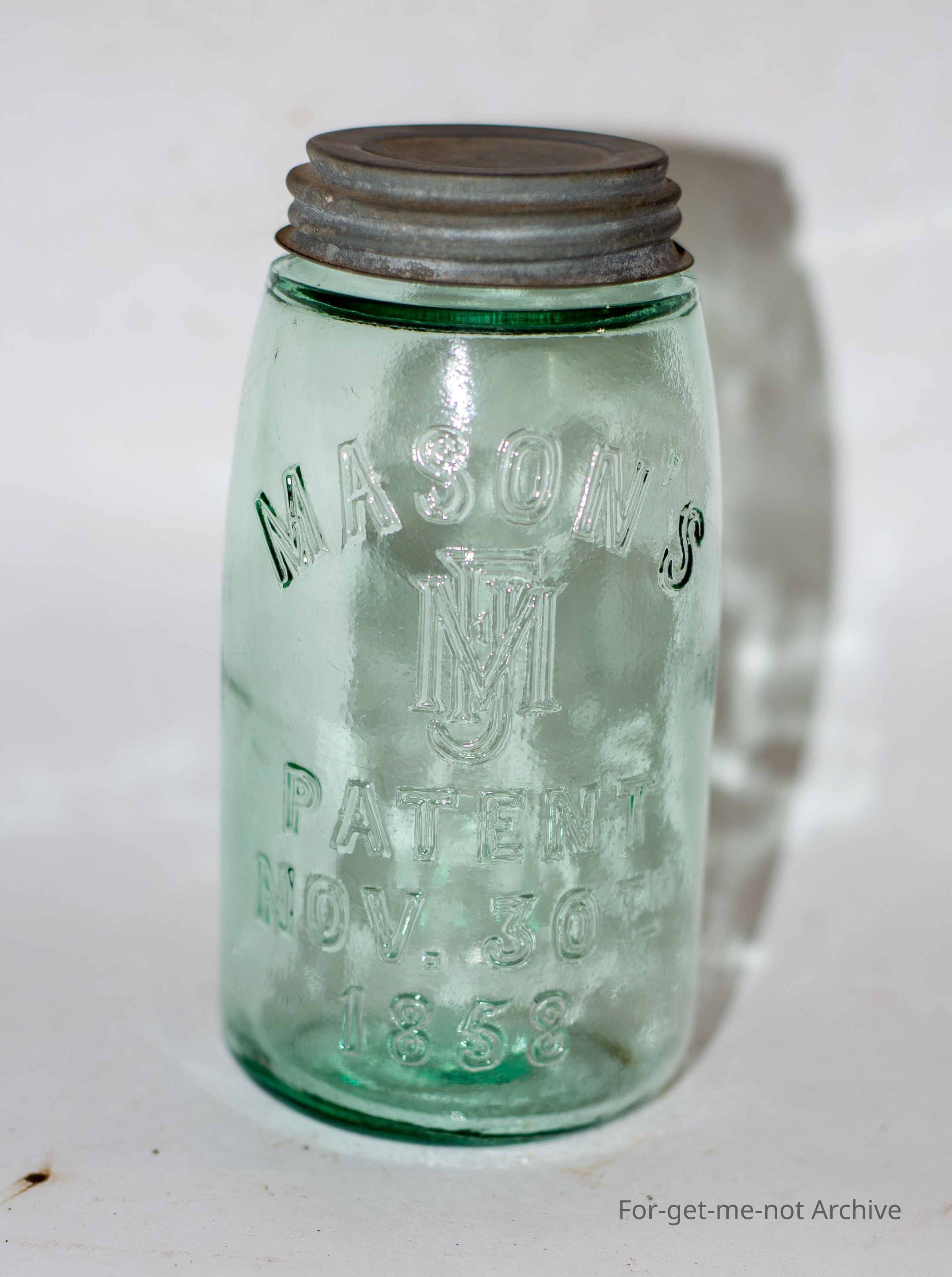 Mason Patent Nov 30 1858, this jar has a tin lid with glass cap insert, monogramed and a small size