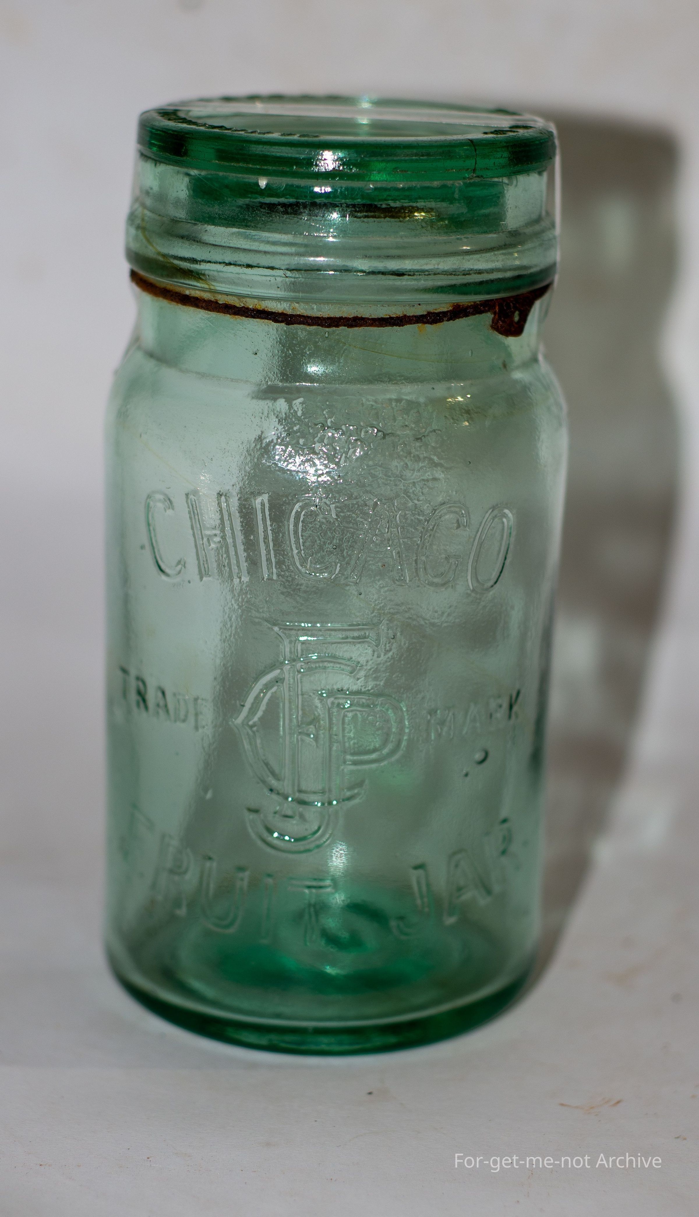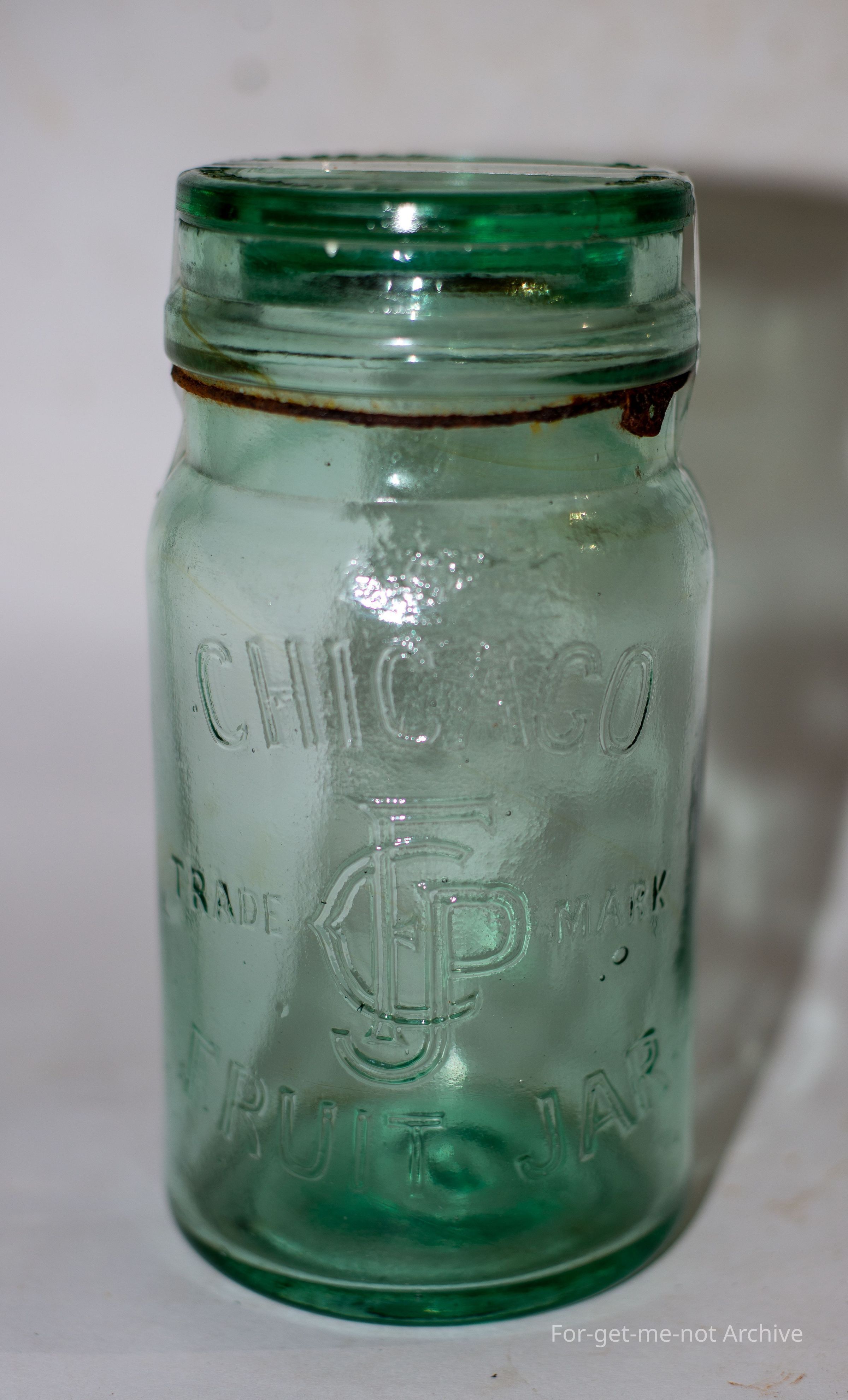 Chicago fruit jar with monogramed CFPJ Chicago Fruit Preserving Jar, glass lid small size