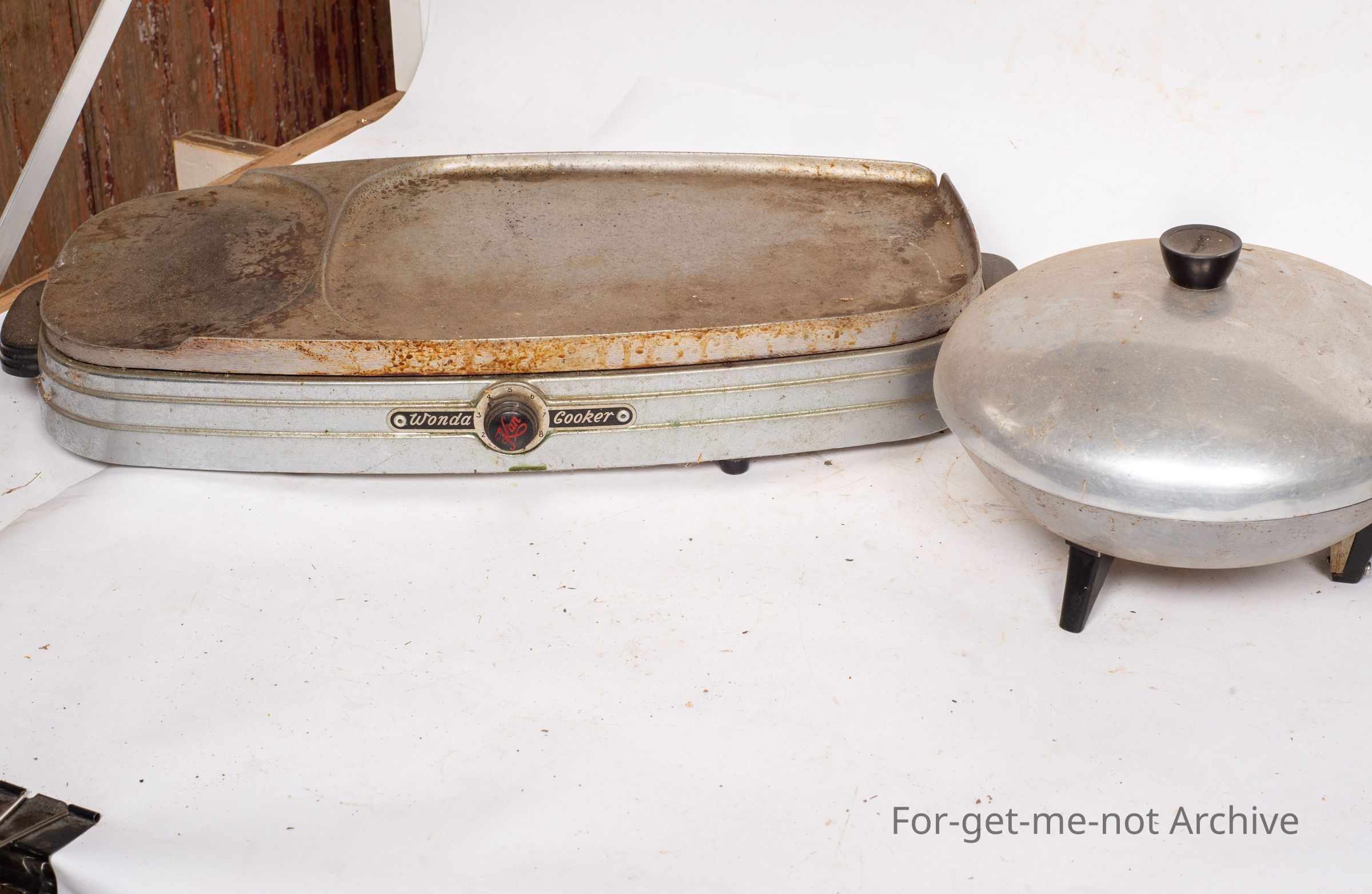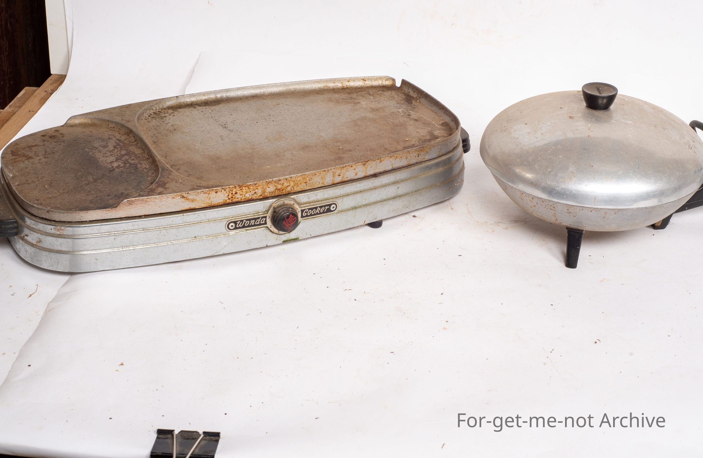 One is a very, large fry pan, a flat base for cooking meat. The other one is like a miniature Sunbeam fry pan, circular with a lid. Probably a lighter piece. Both sort of popular sixties to seventies kitchen implements.Collection