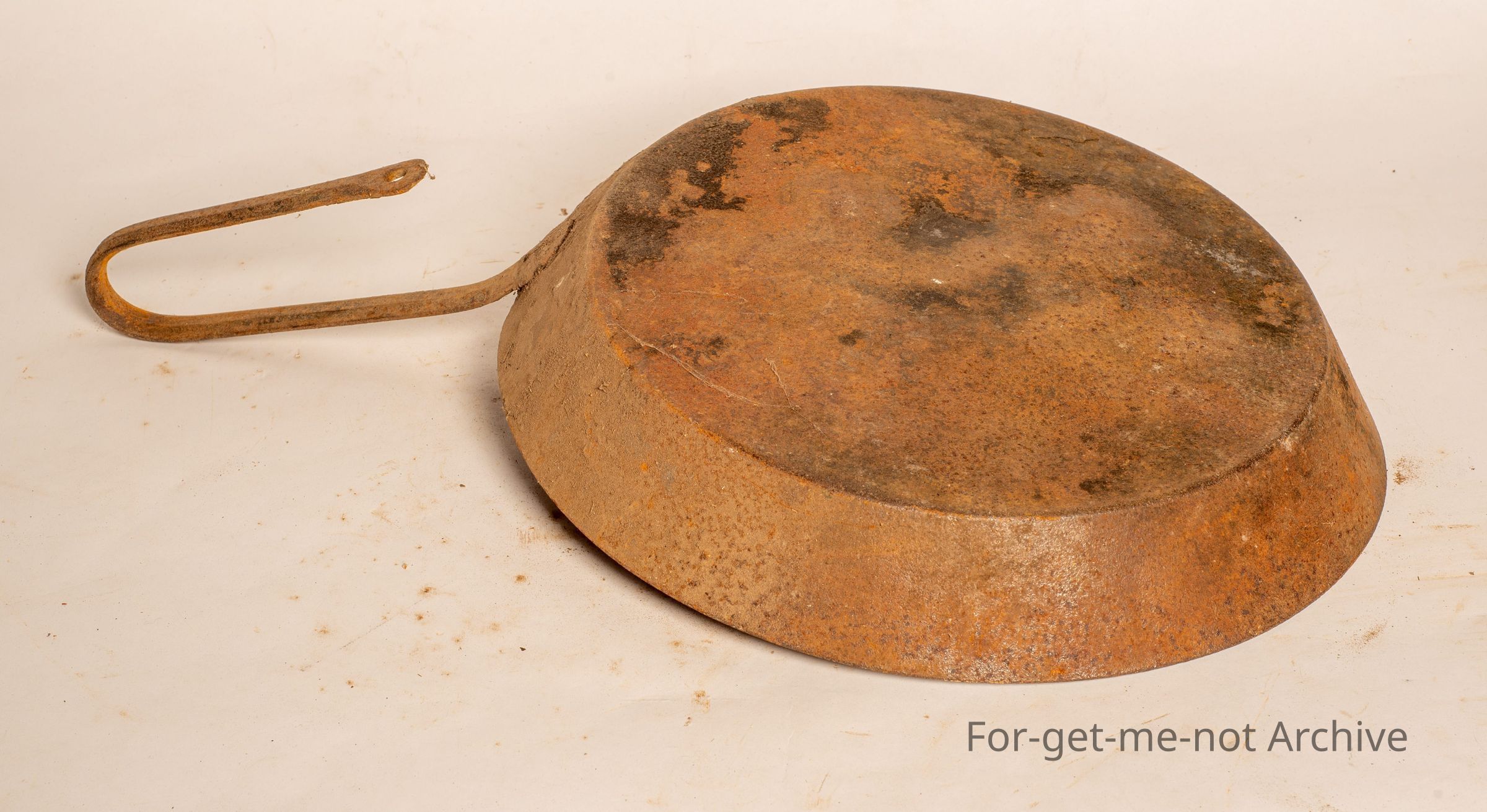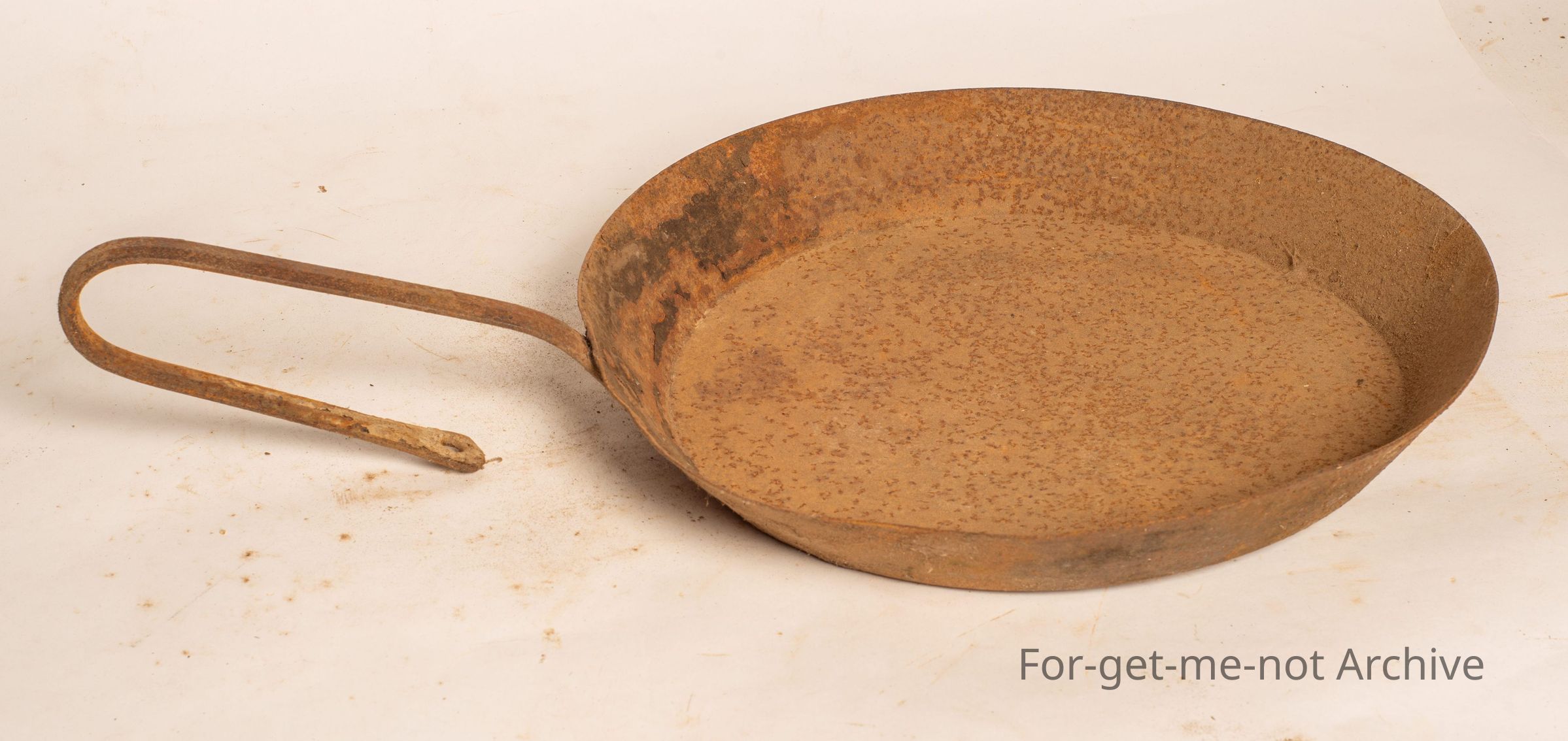 Tin, frying pan, pressed with a cast iron handle with a hook on it.