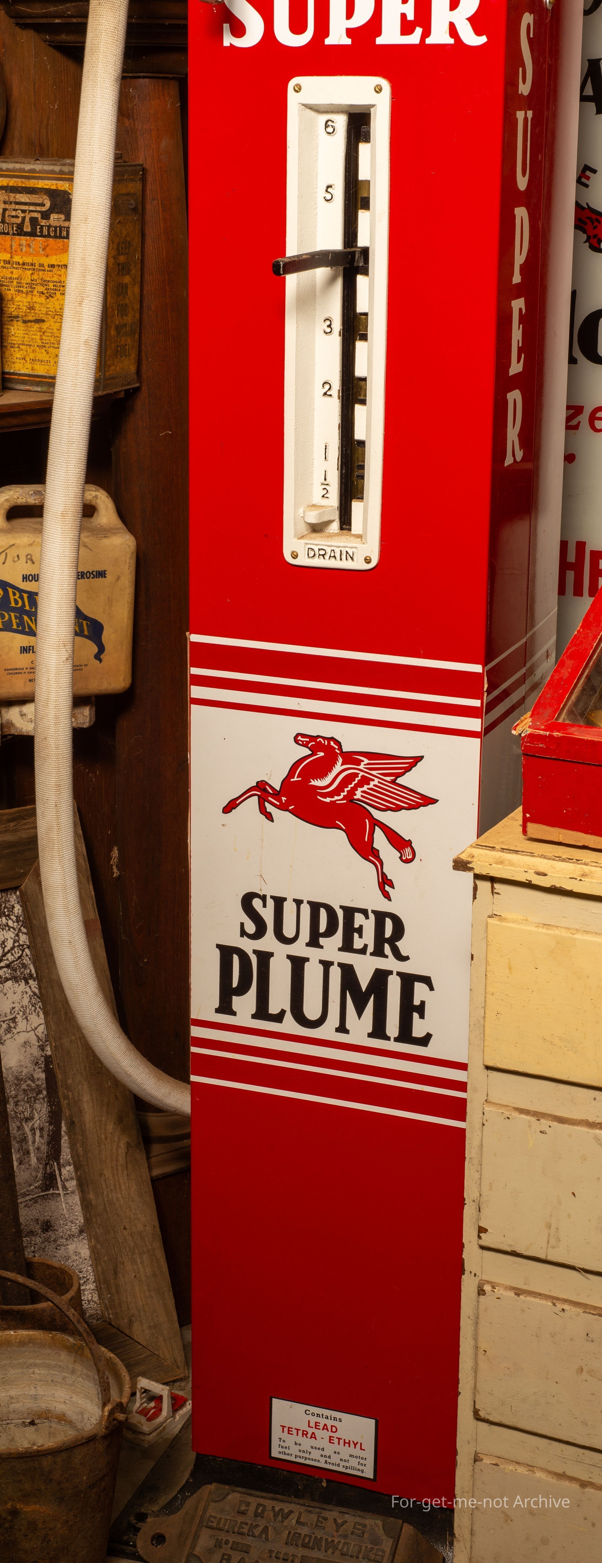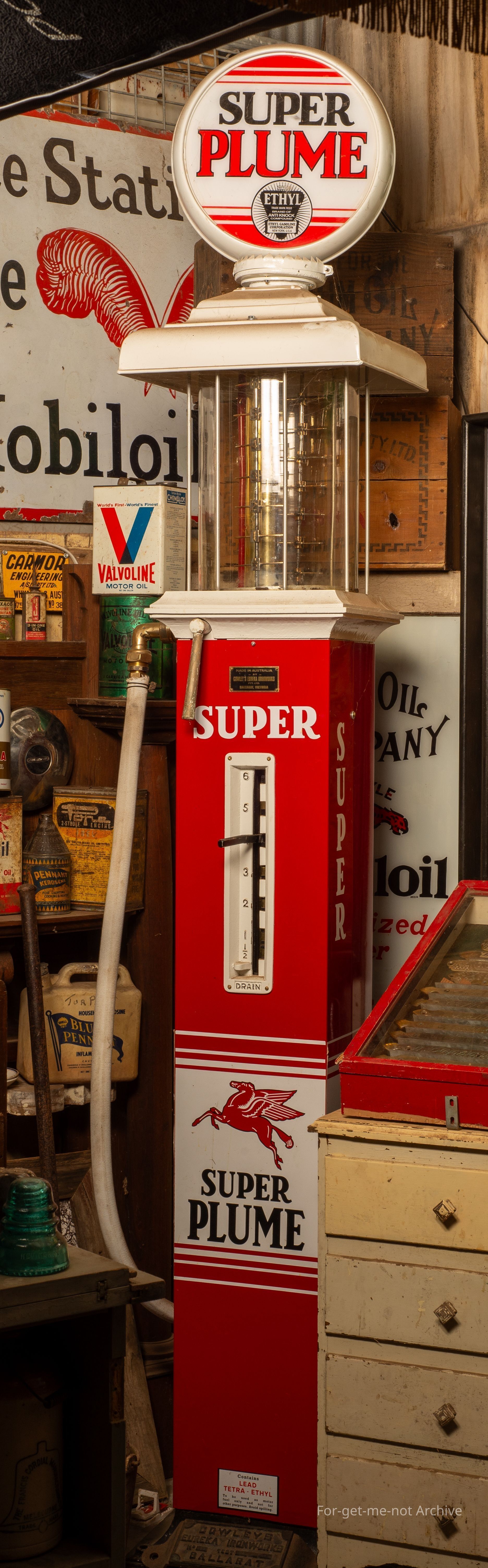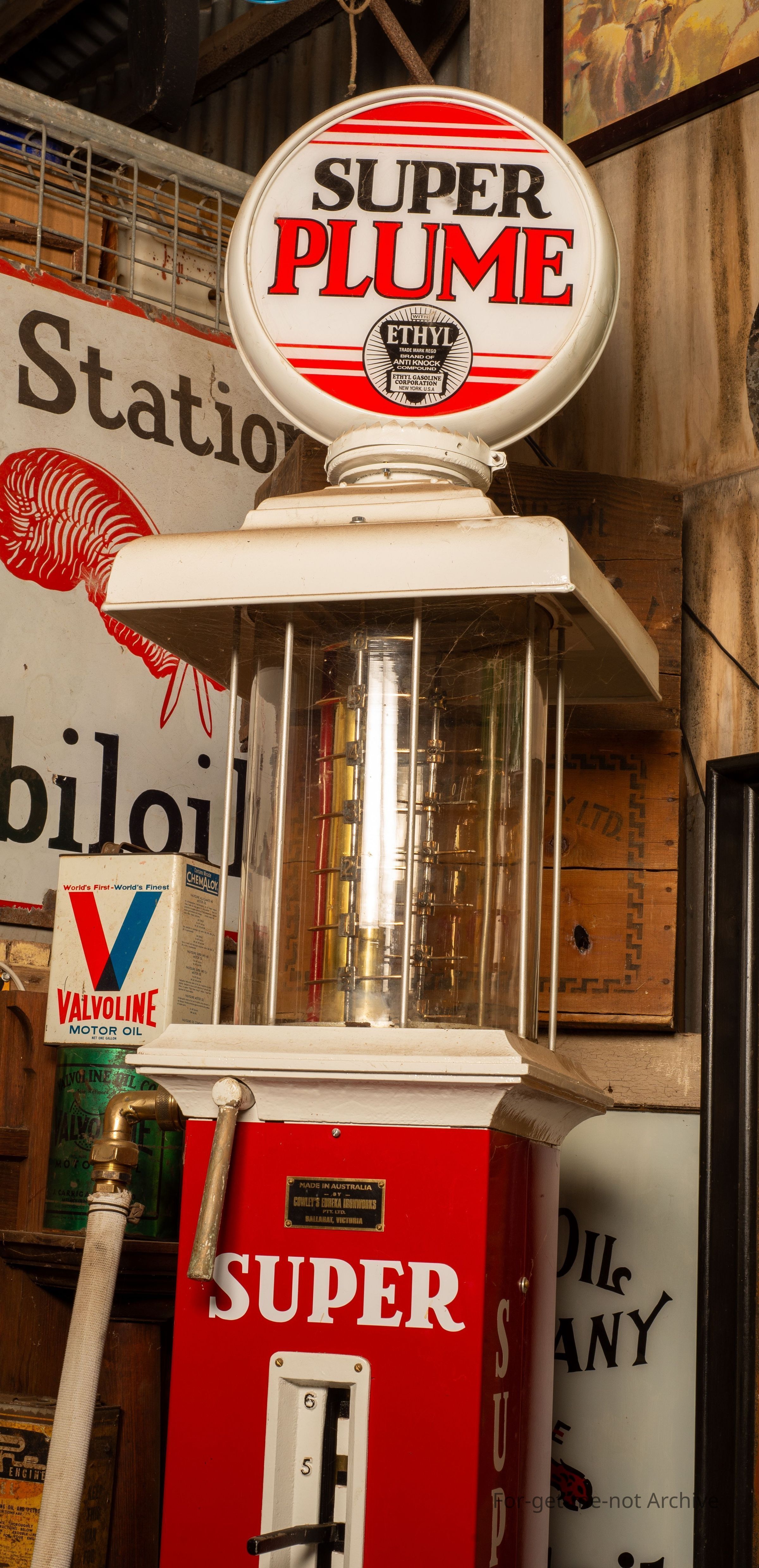 Fuel bowser manufactured by Cowley Eureka Iron Works in Ballarat. This has been restored. All original components other than the globe on the top, from the original make. The glass is all original.
