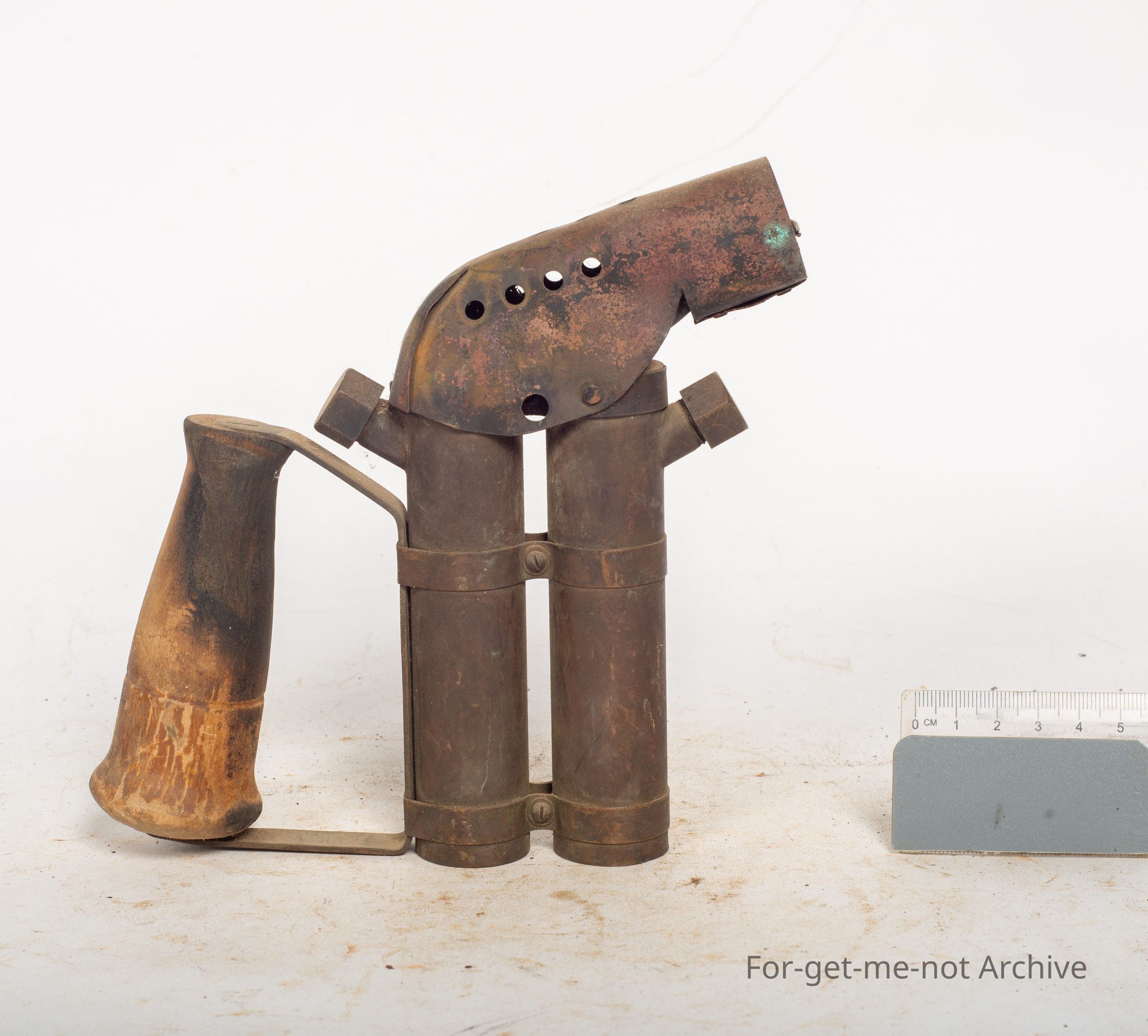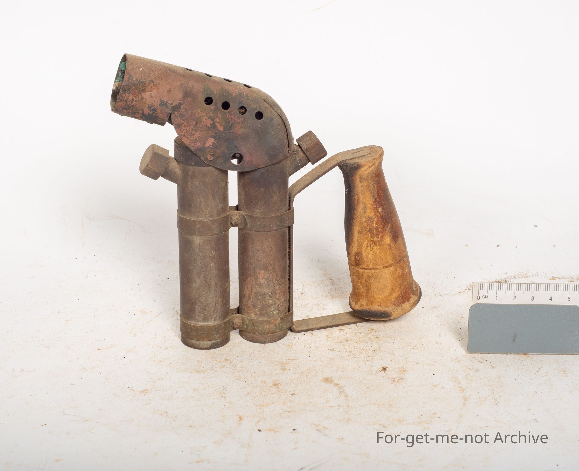 This is a small held handheld, pressurized, gas fuel burner. Most unusual, 2 cylinders for fuel. The protective cover over the burner, wooden handle which has been very hot, no identification valueCollection