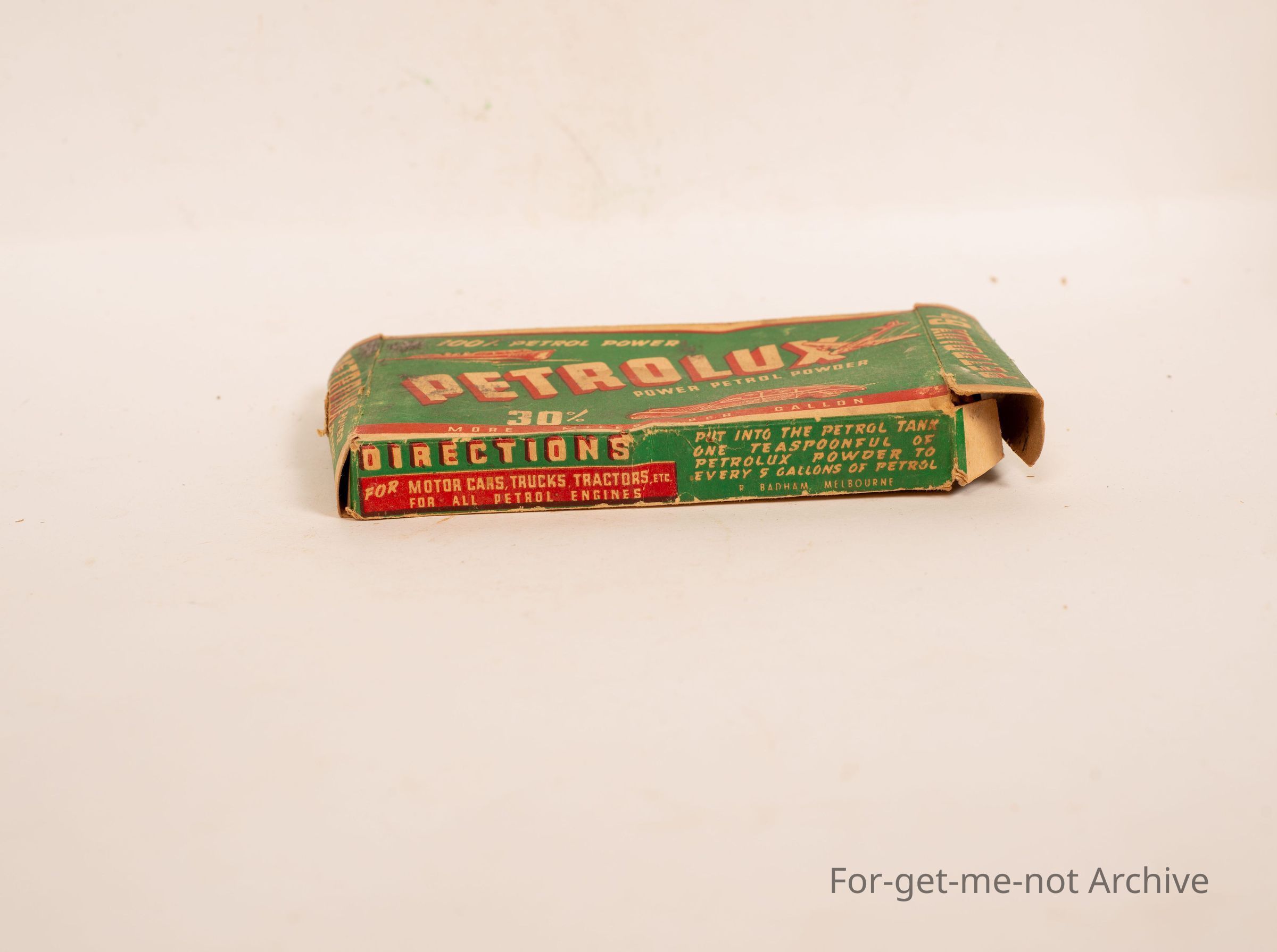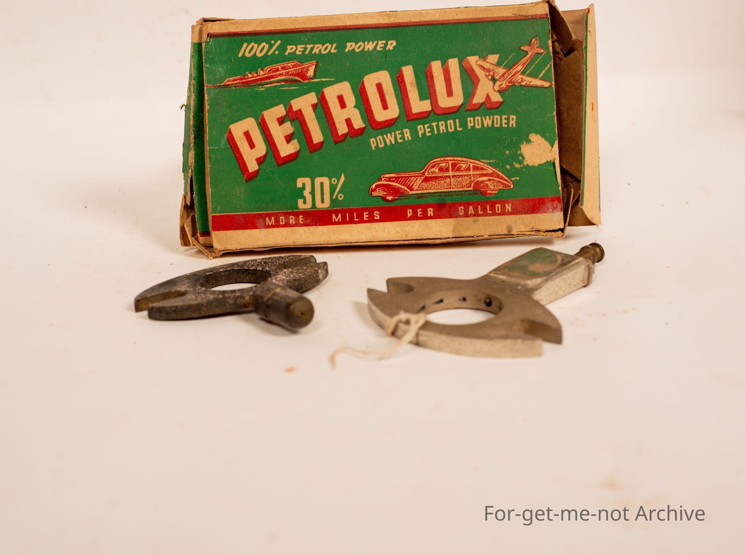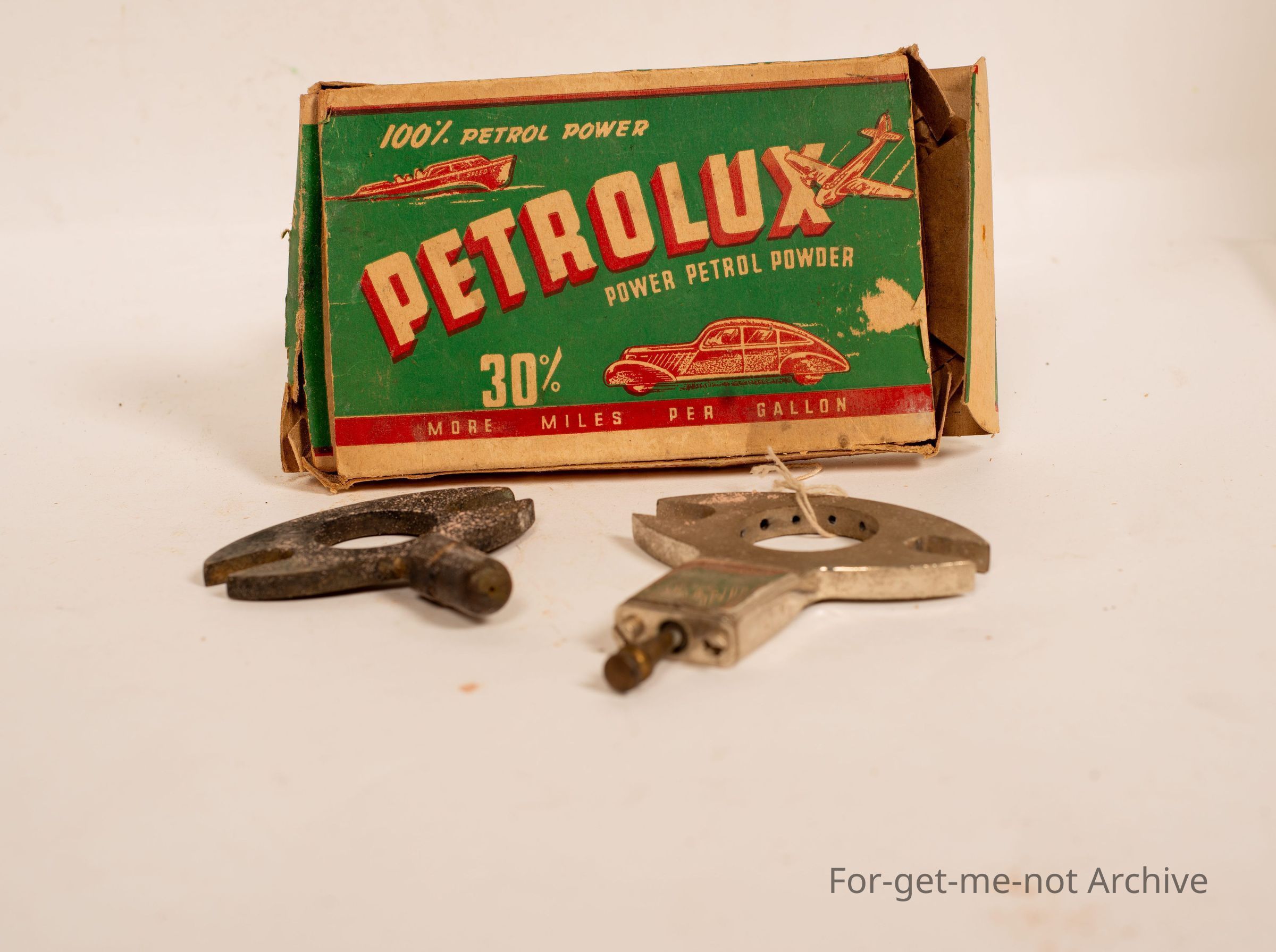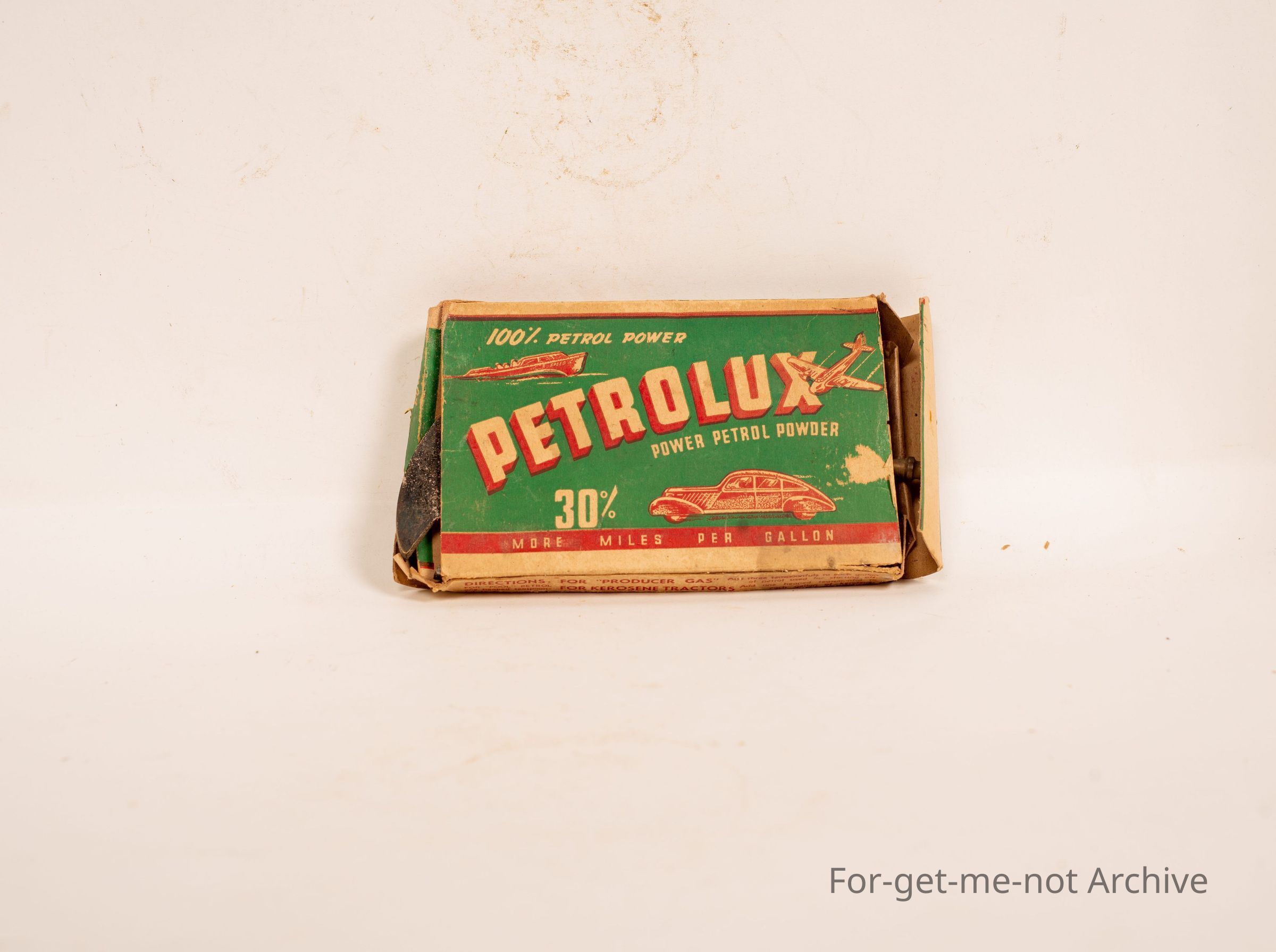 Cardboard box with petrolux power petrol power powder. 30 miles per gallon. This is an economizer for the early cars. Dubious effectiveness