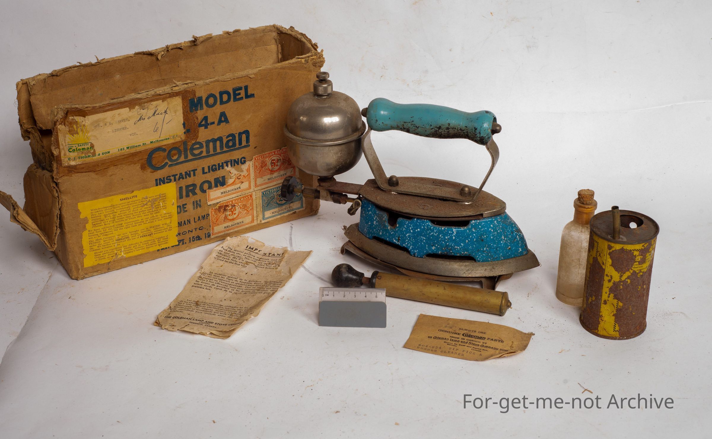 This is a Coleman fuel iron. These irons ran on petrol with a tank, they were pressurized. This is enamelled metal with a wooden handle in its original box, in very good order.Collection