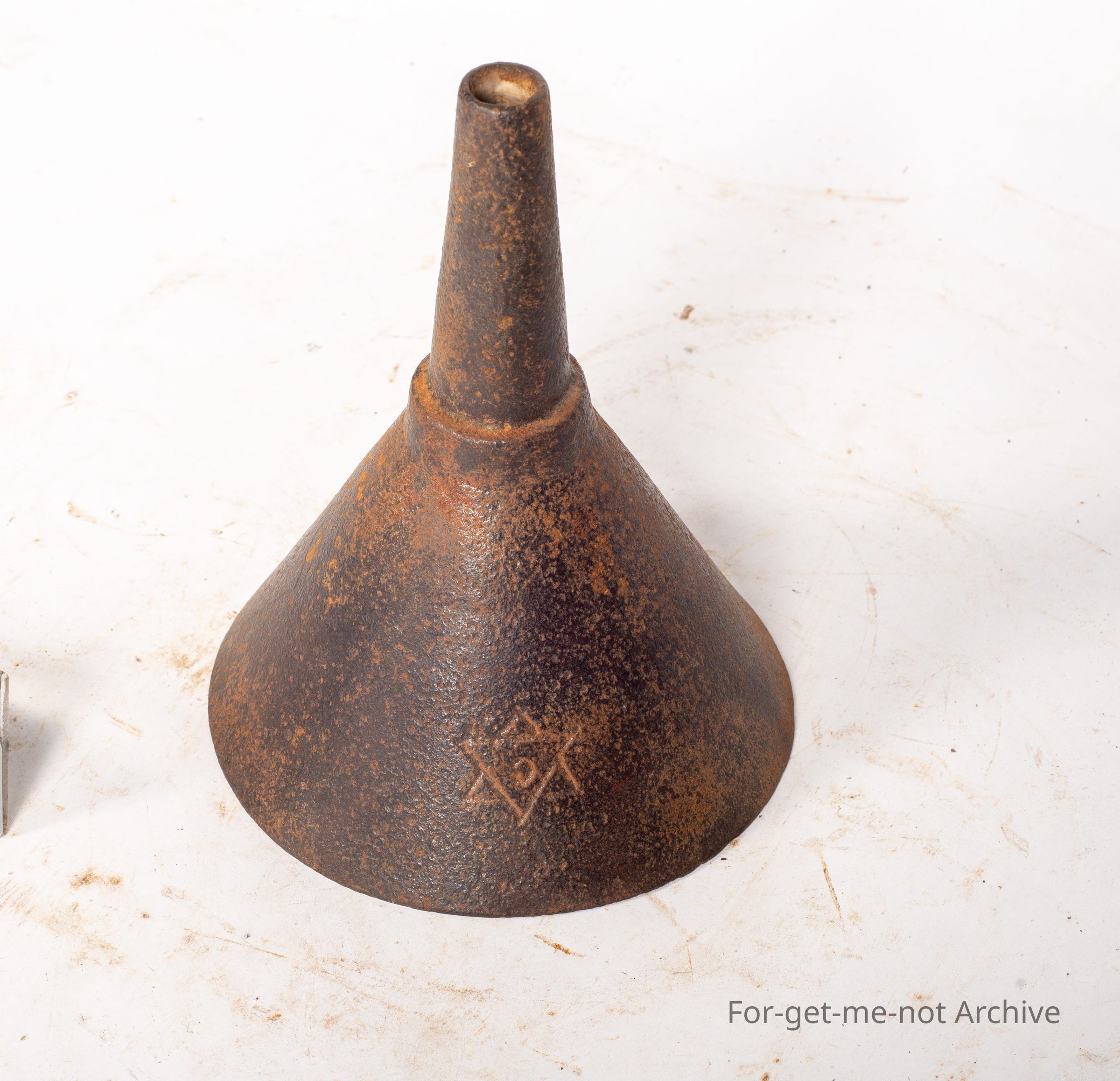 This is a very simple funnel enamelled on the inside. Has the earliest trade symbol of Clark, which is a C inside of a star. Number 5 on the back of it. Has a little ring to hang it from things. This would be a very rare piece of early KitchenAidCollection