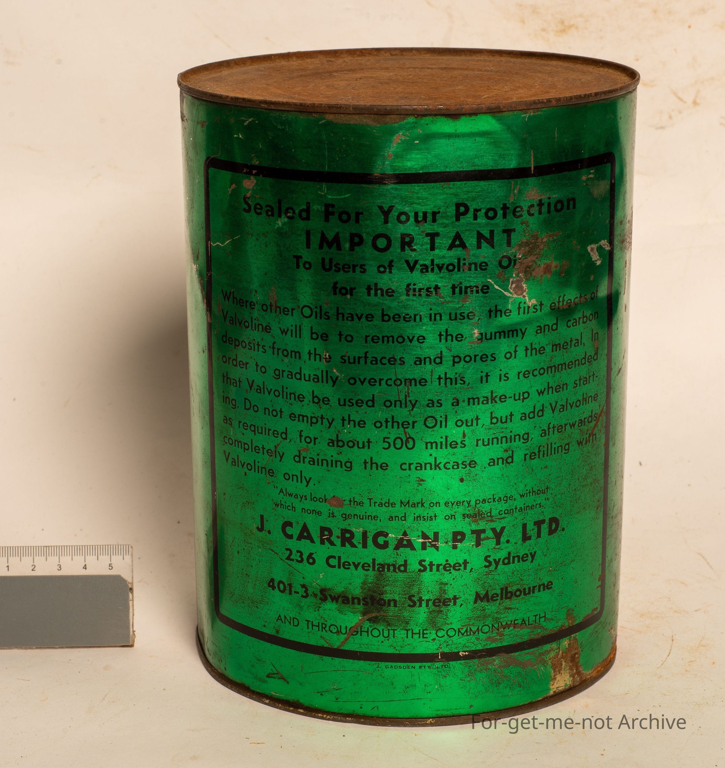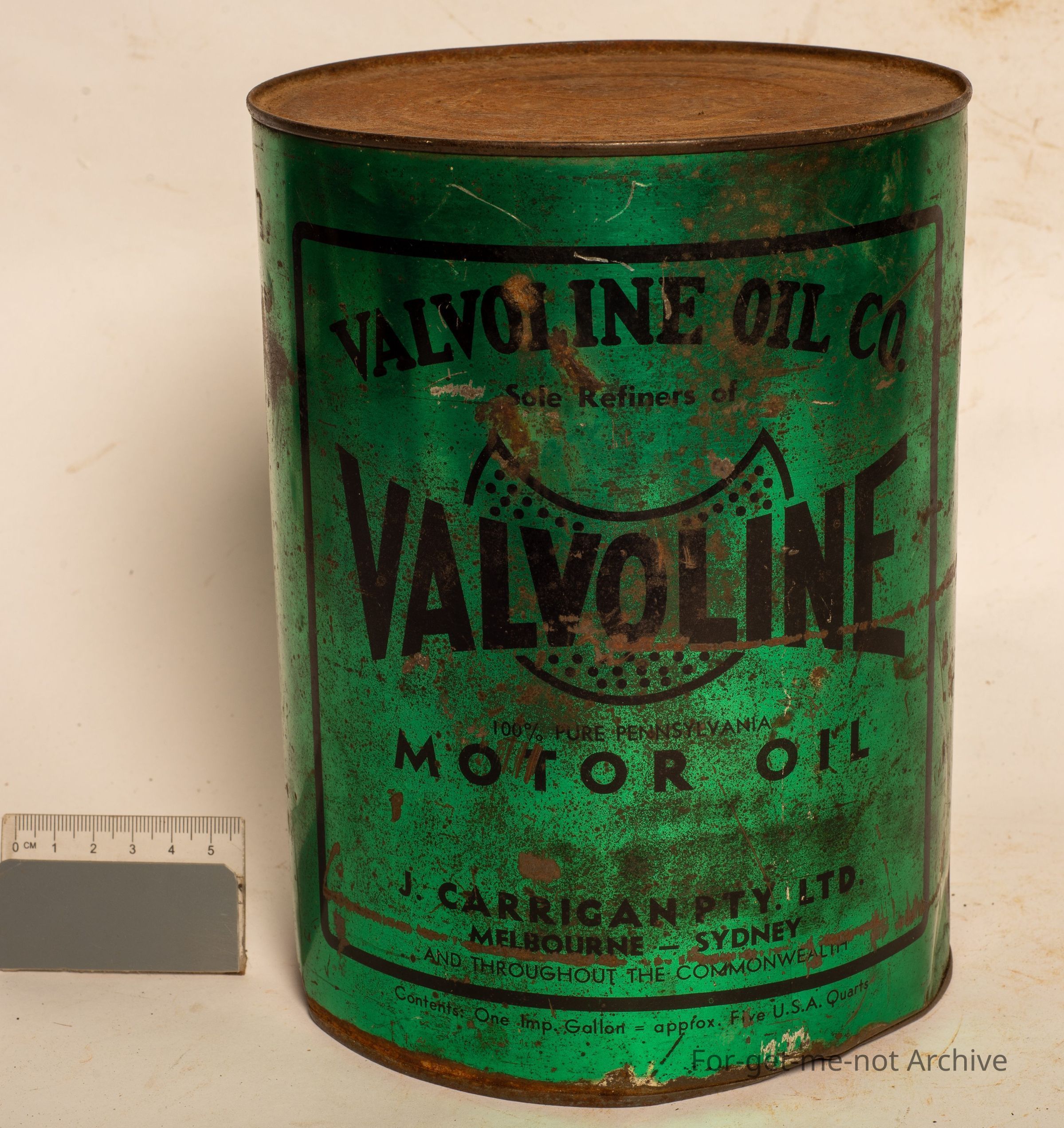 It just says pure Pennsylvania motor oil packaged by Carrigan, Melbourne Sydney. Nice green label, not in bad condition, never been opened. The tin is made by Gadsden Melbourne. Still has its original contents.Collection