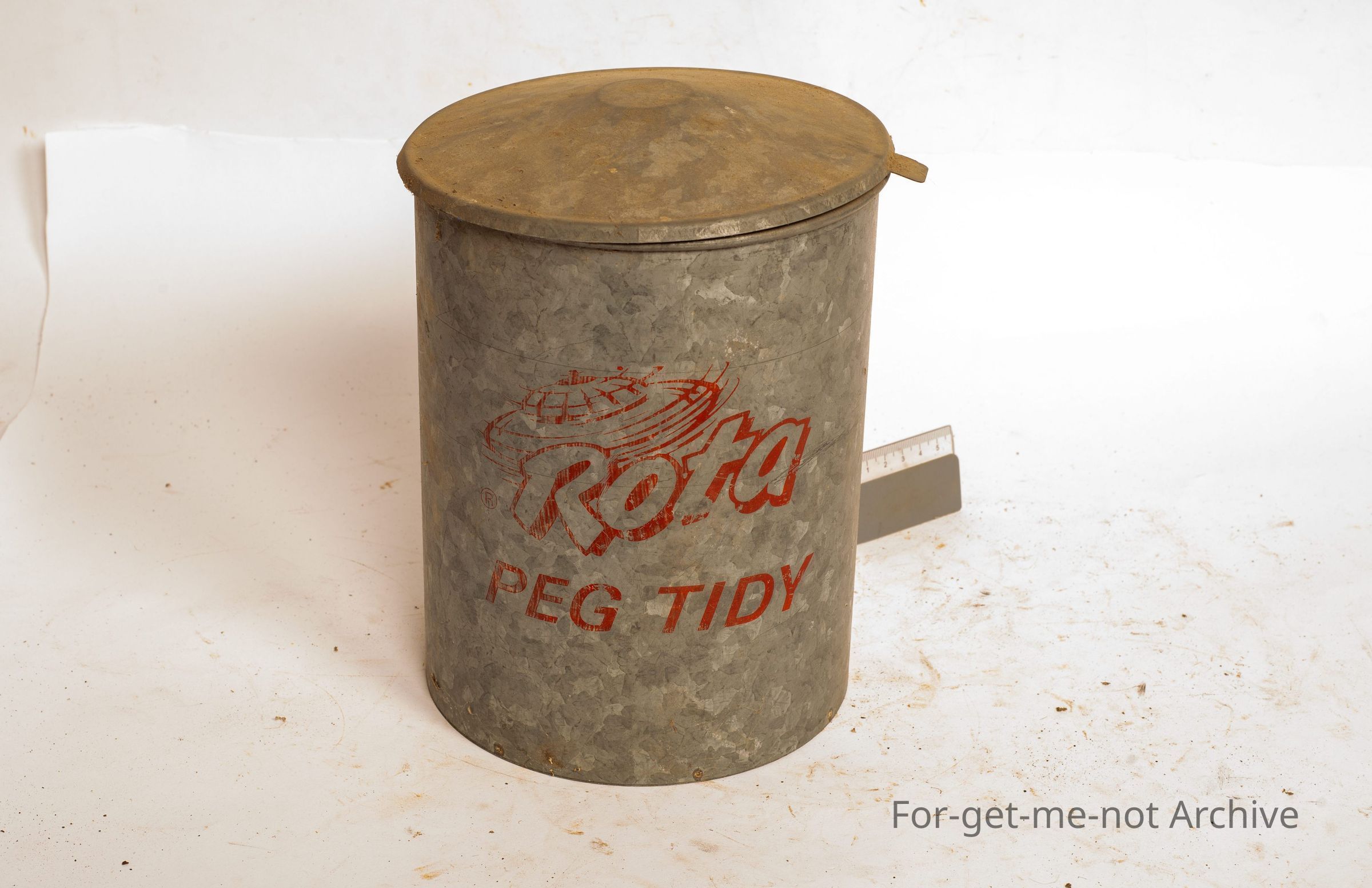 This is a galvanized tin with a lid called the Way top Peg Tidy. These were usually fitted on to the hills horse to keep the wooden pegs out of the weather. Not very often you see one in such good condition as this. It may have never been used.Collection