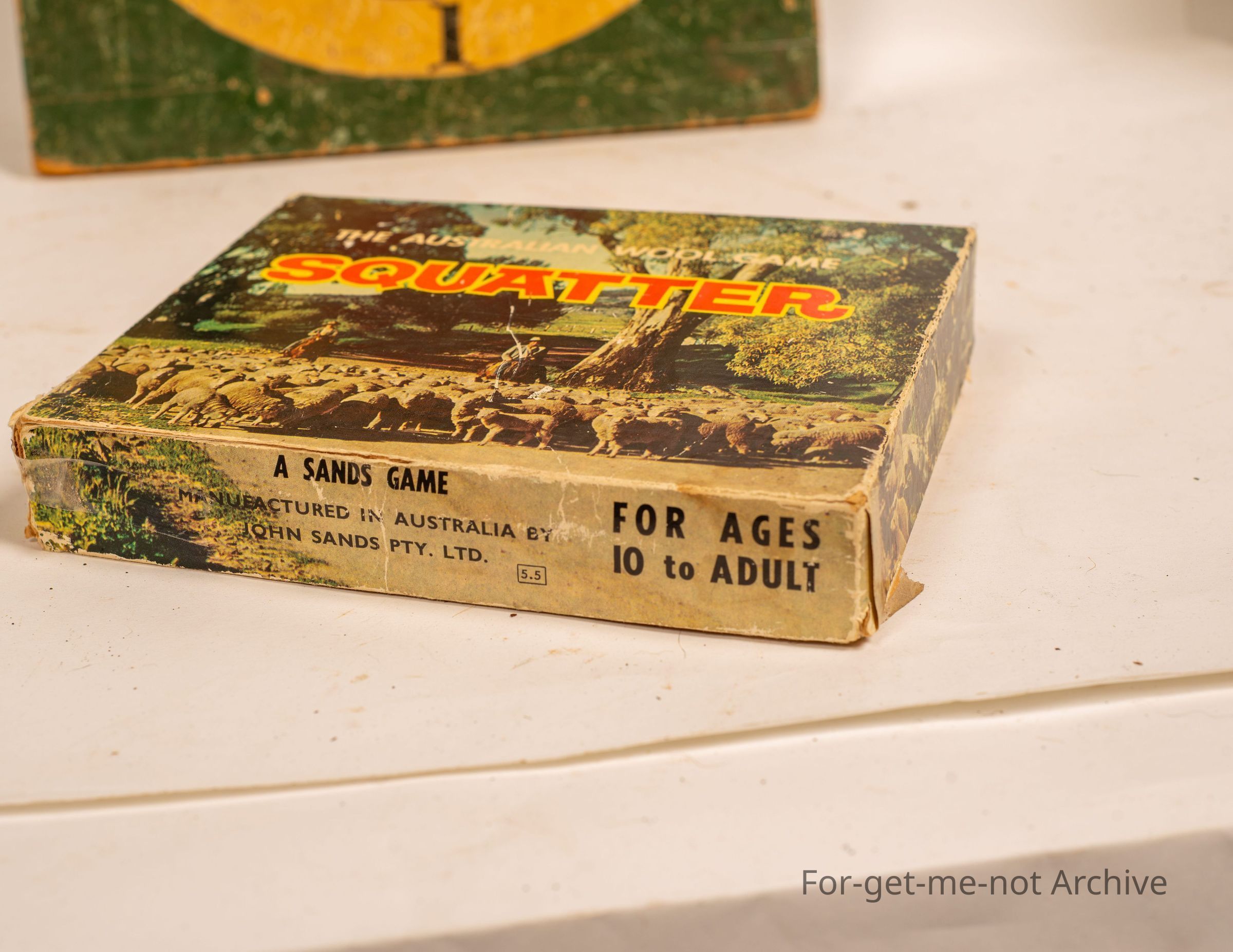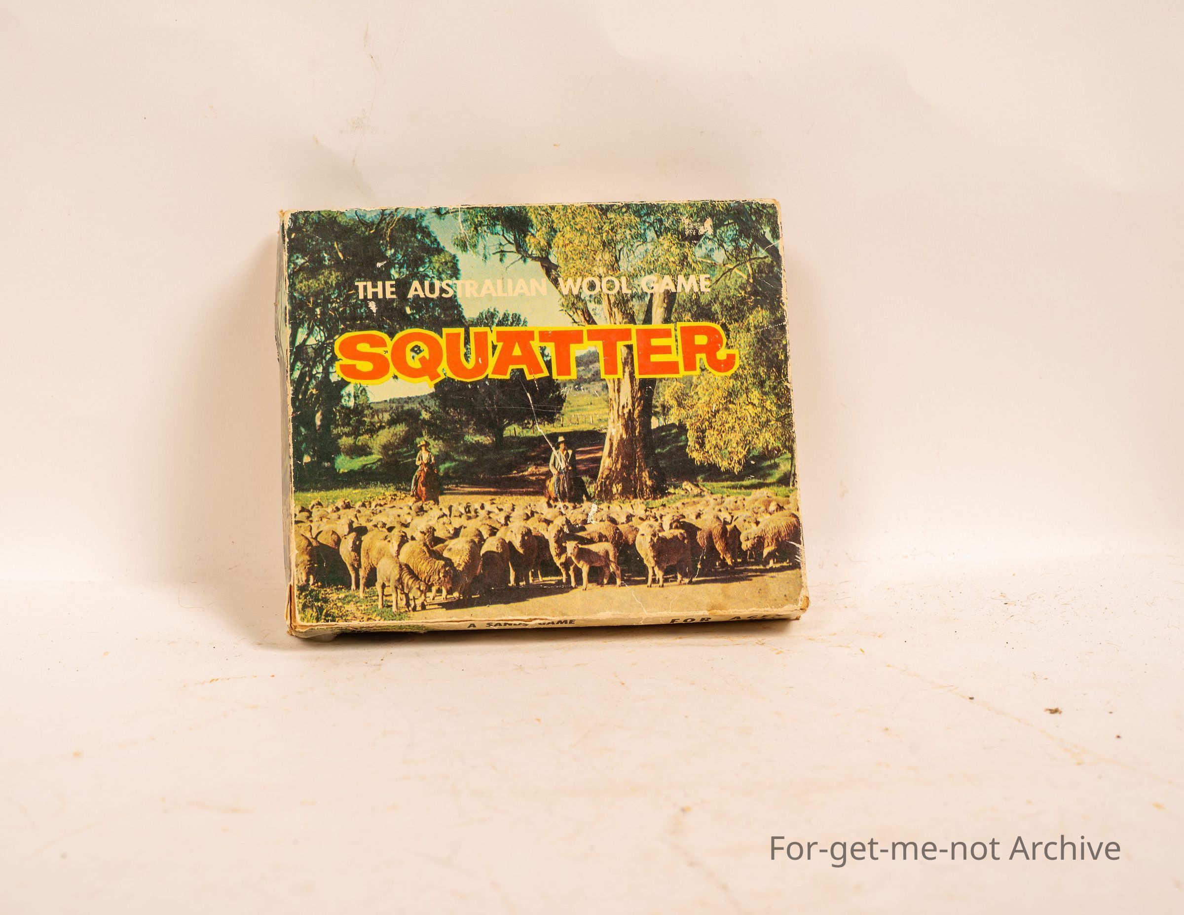 A small size box of the game called Australian squatter rule game. This box was donated by Timothy Hall, all intact with the pieces.