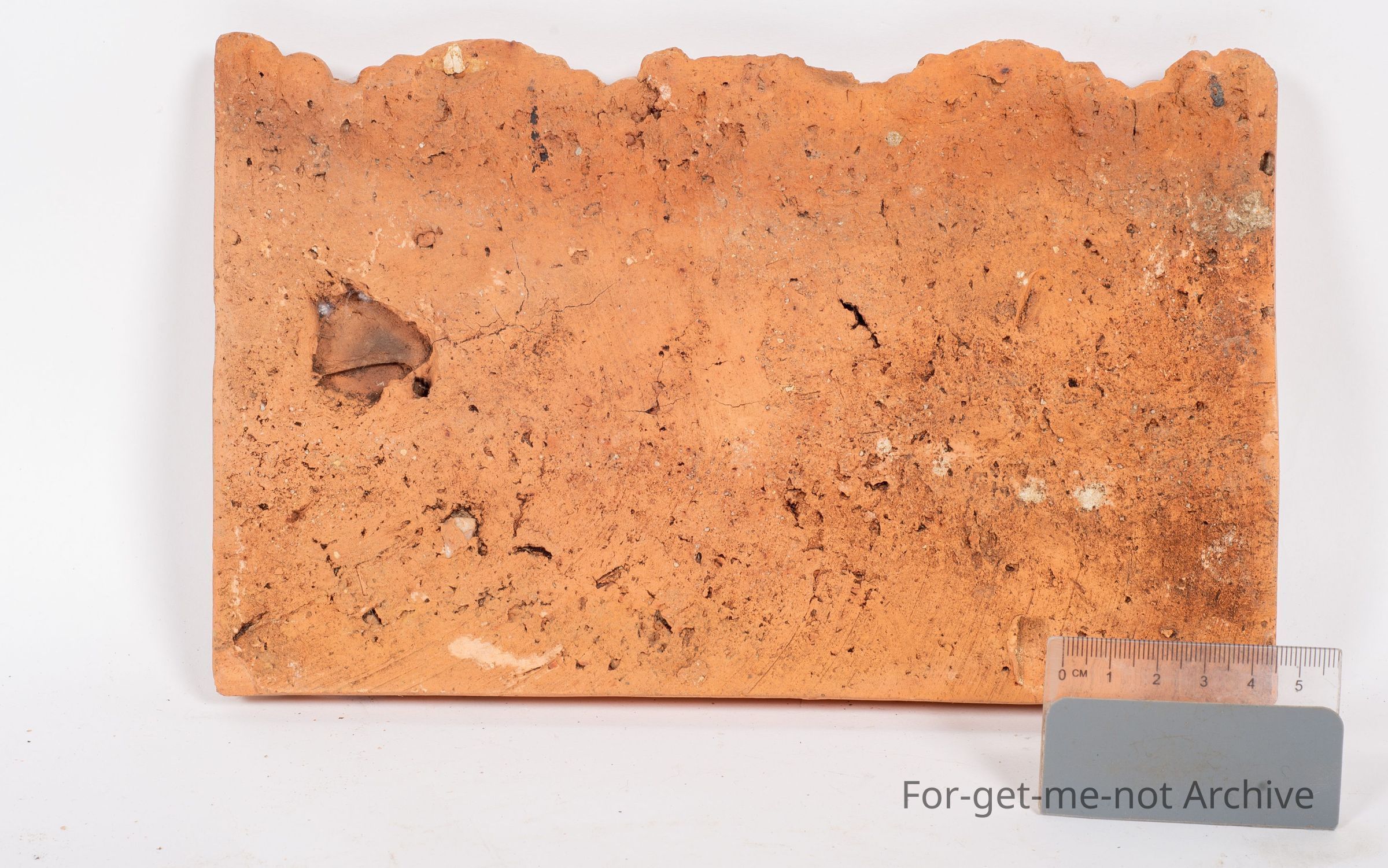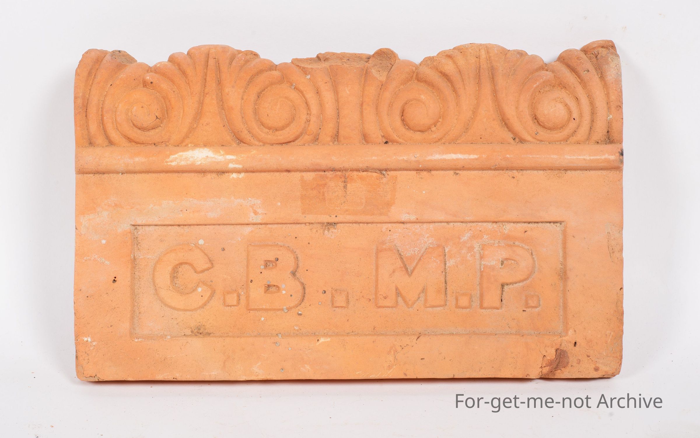 Garden edge tile, embossed CBMP, which is Charles Bennett McGill Pottery. Has a bit of breakage to the top, but at the same time, this is a very early one from Charles Bennett, the father or grandfather of the present day Maguire Pottery.Collection