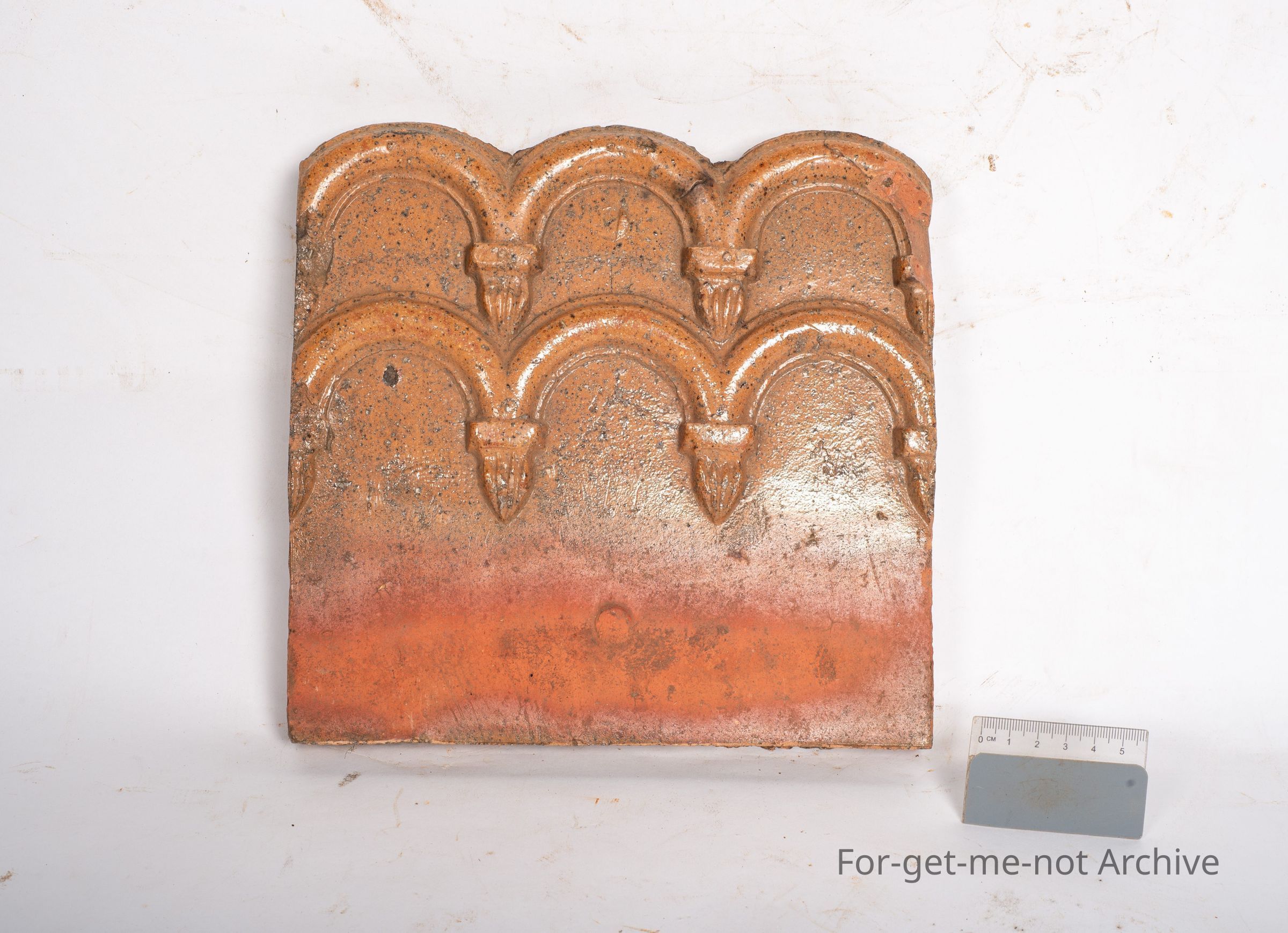 This is a large garden edging tile. A lot of pressed ornament in the shape of arches. This has been attributed to Botel Pottery Newcastle, New South Wales.