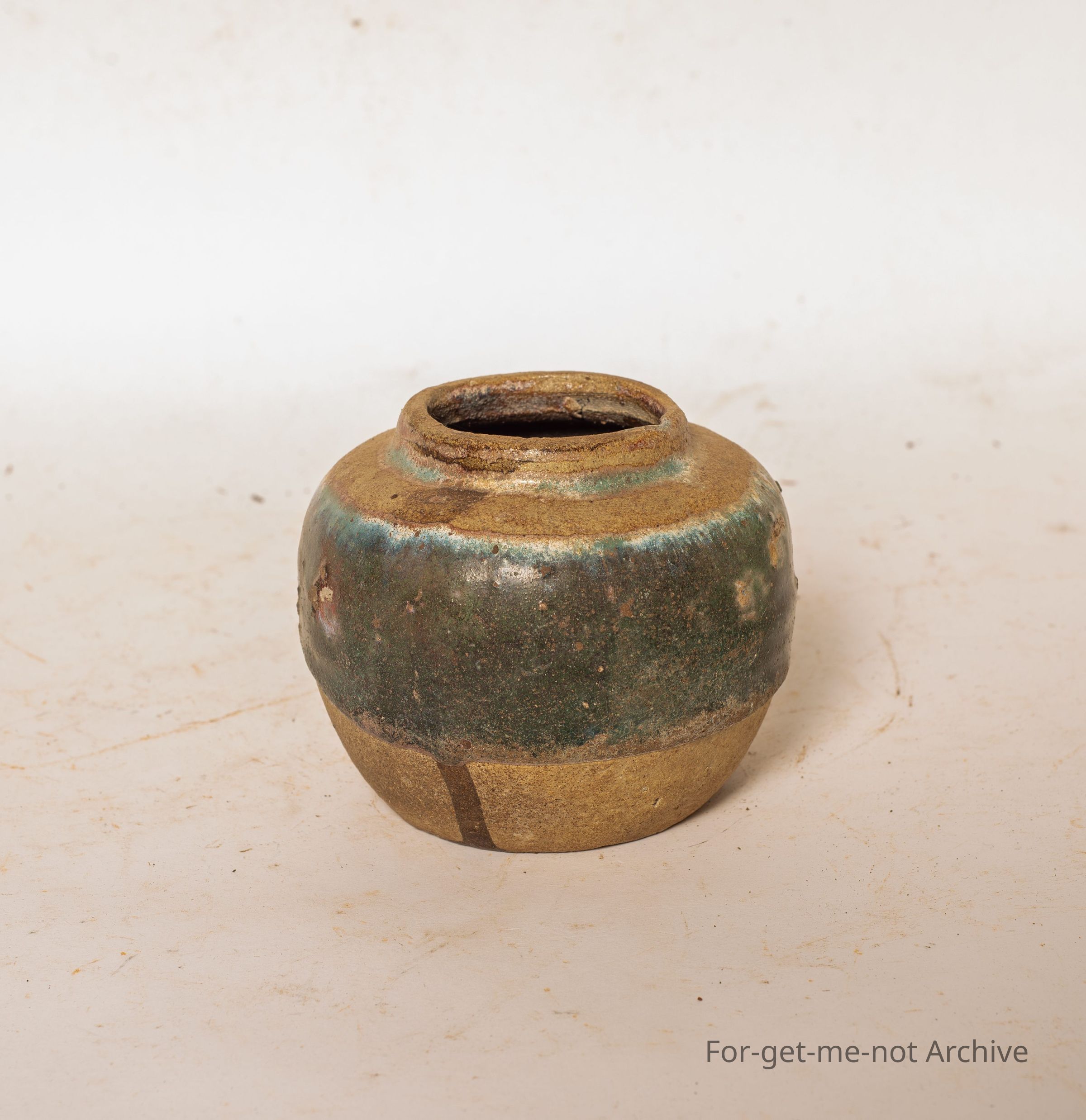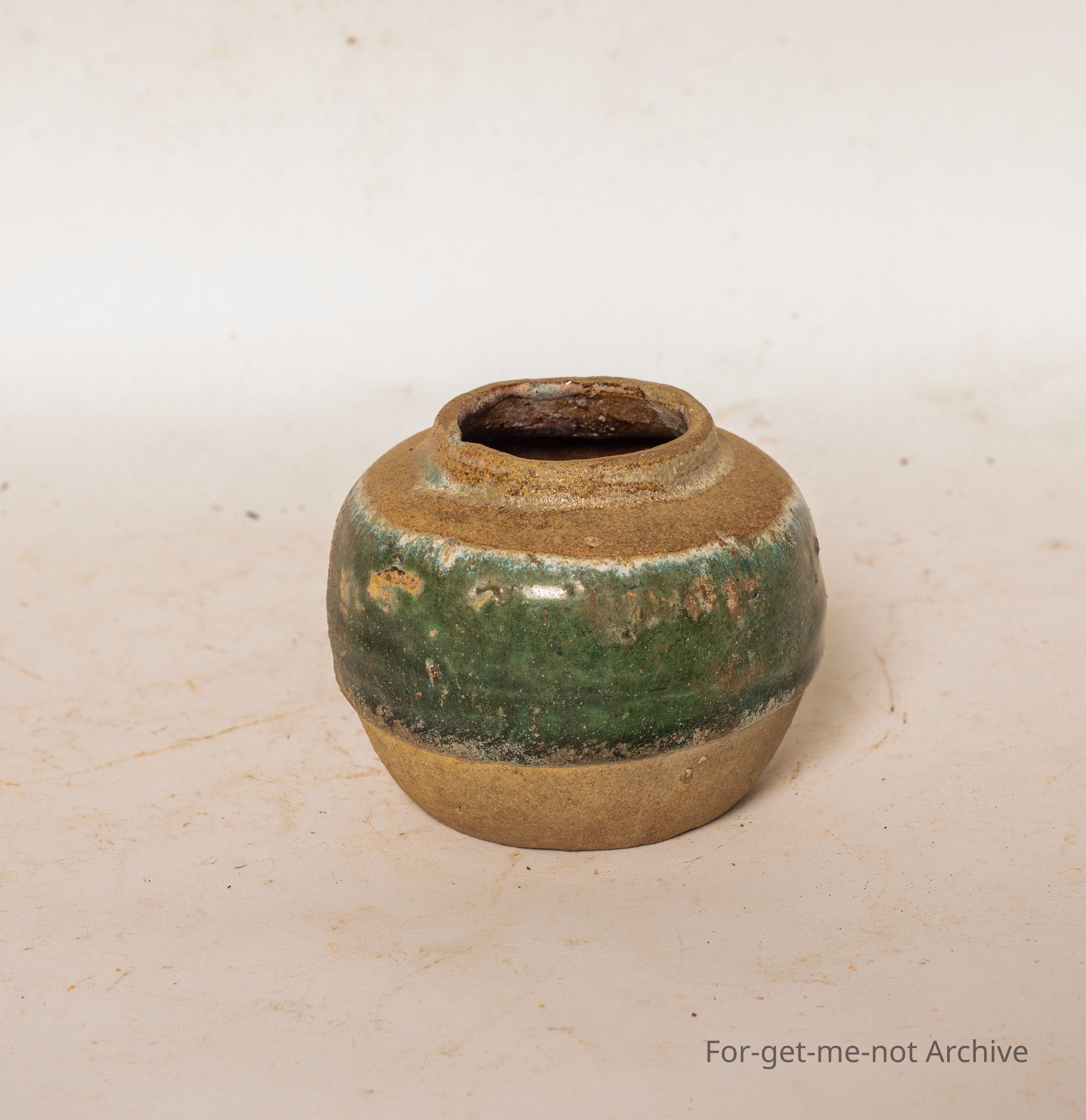 Chinese collection. Small Chinese Ginger Jar again being fired with the lid. The usual band of, glaze around the outer side. This time a darker green.