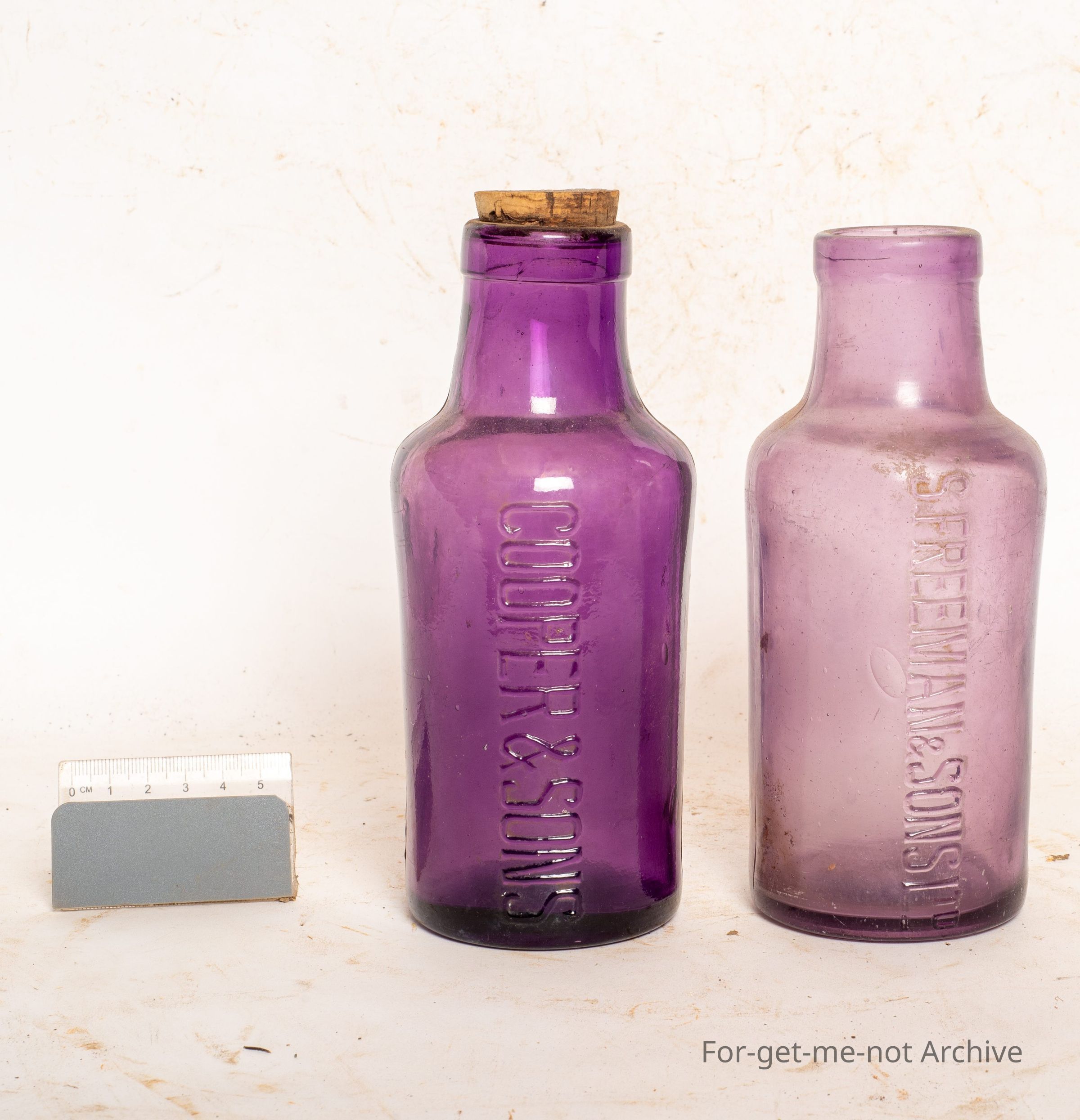 These are 2 amethyst jars, possibly being from Pickles or something like that. 1, Cooper and Sons. The other one, s Freeman and Sons. Both early, both in good condition.