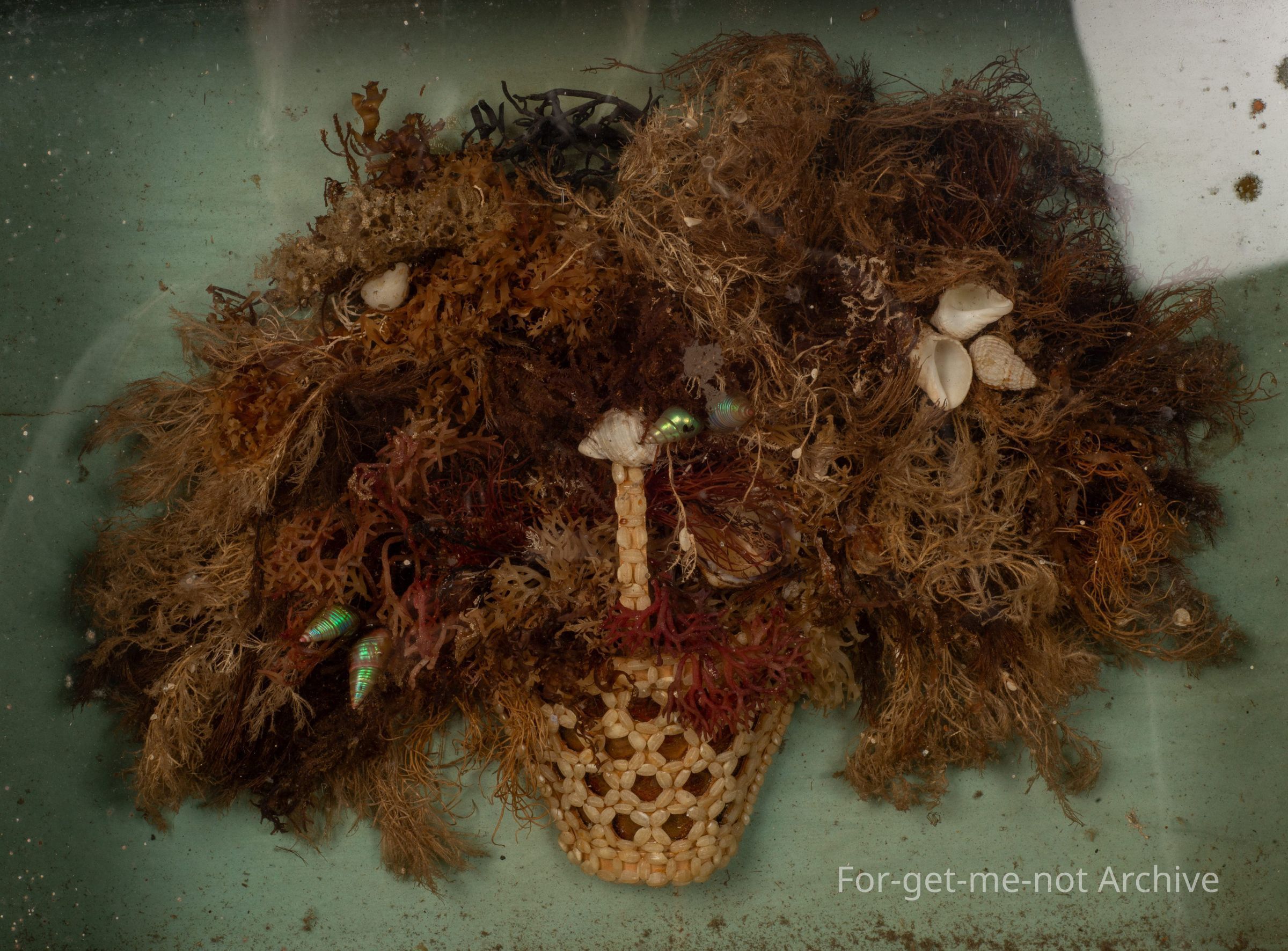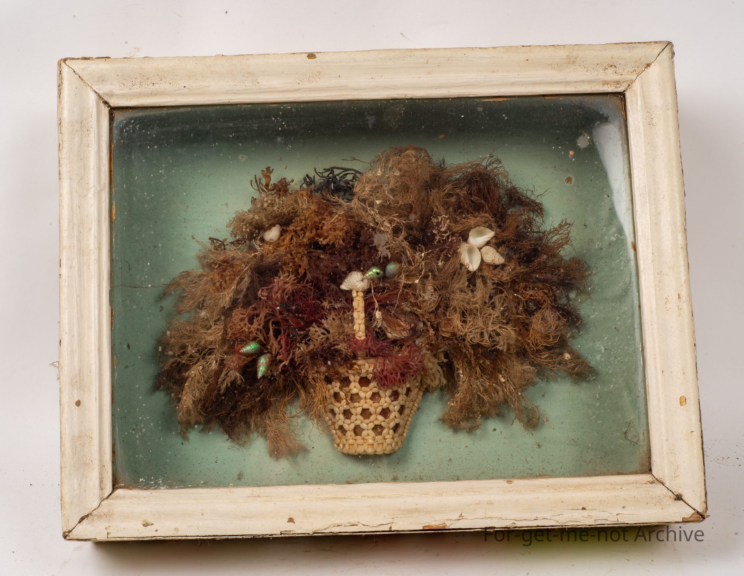 This is a small front display cabinet, glass front. The craft piece in the back is made of seaweed, with shells. The bowl at the base is all made from what looks like to be grains of Weiss. Could be a small shell. Delightful little piece. Has a lot of dust in it, but, certainly made at a very early time.Collection
