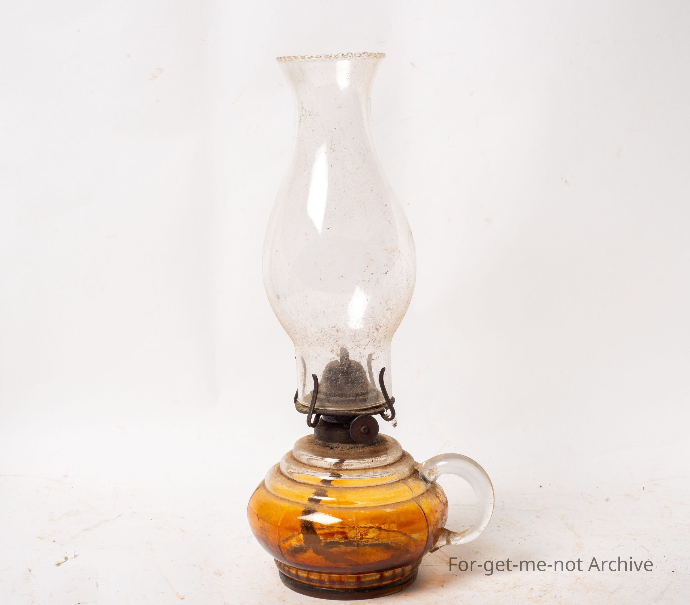 Is a little glass finger lamp, handle on the side, the fluted top, got an oil burner and chimney,